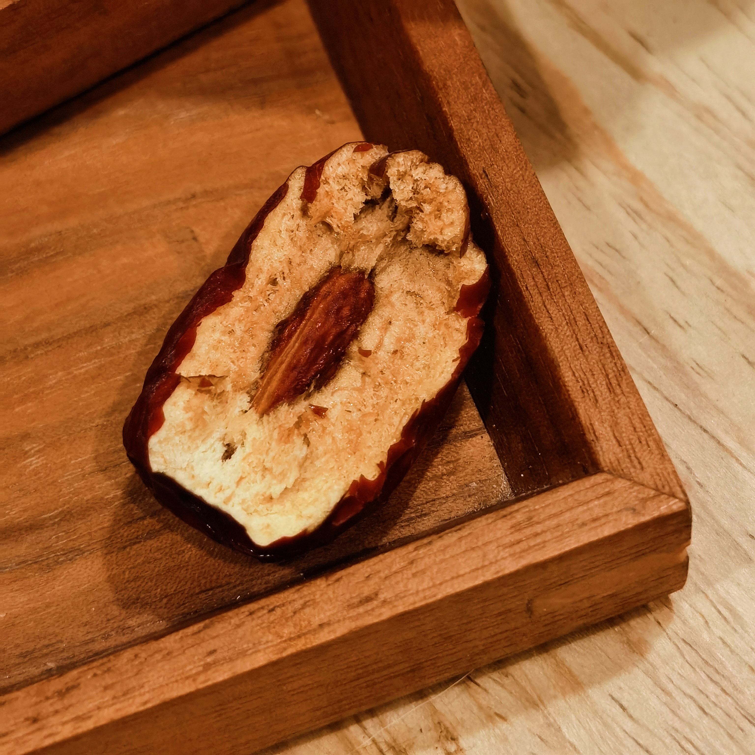 红枣算是我的必备小干果,泡茶、煮汤、都会放,没事也会当零食吃几颗,尤其是喝中药时,都要来5颗,防止胃难受。若羌灰枣的枣子果皮很薄,吃起来没什么渣感,果肉绵密有嚼劲,透着自然枣香,枣核还特别的小。不塞牙缝,甘甜不腻,几乎没有酸,水分糖分保留得刚刚好,有些还能拉出丝来,真的有淡淡余香。