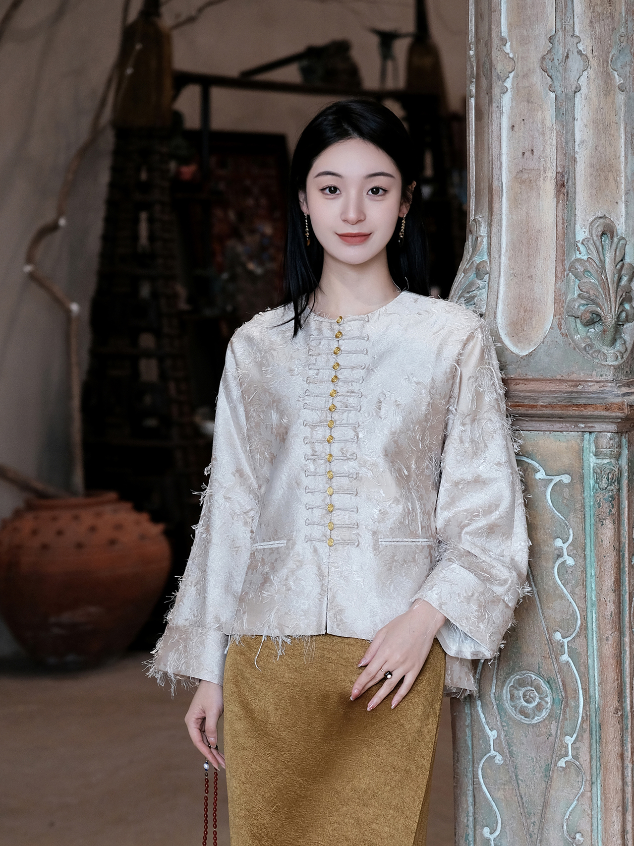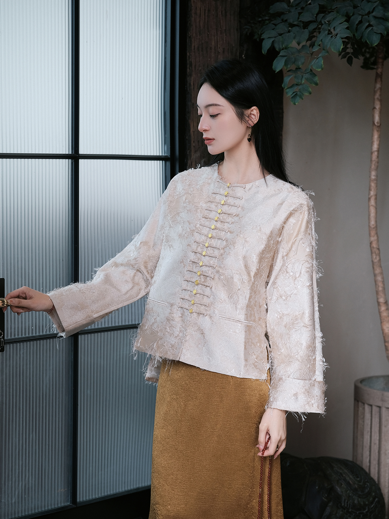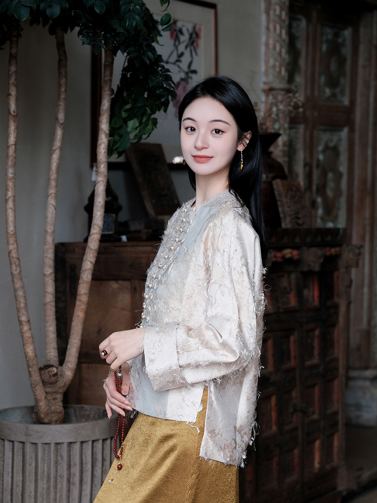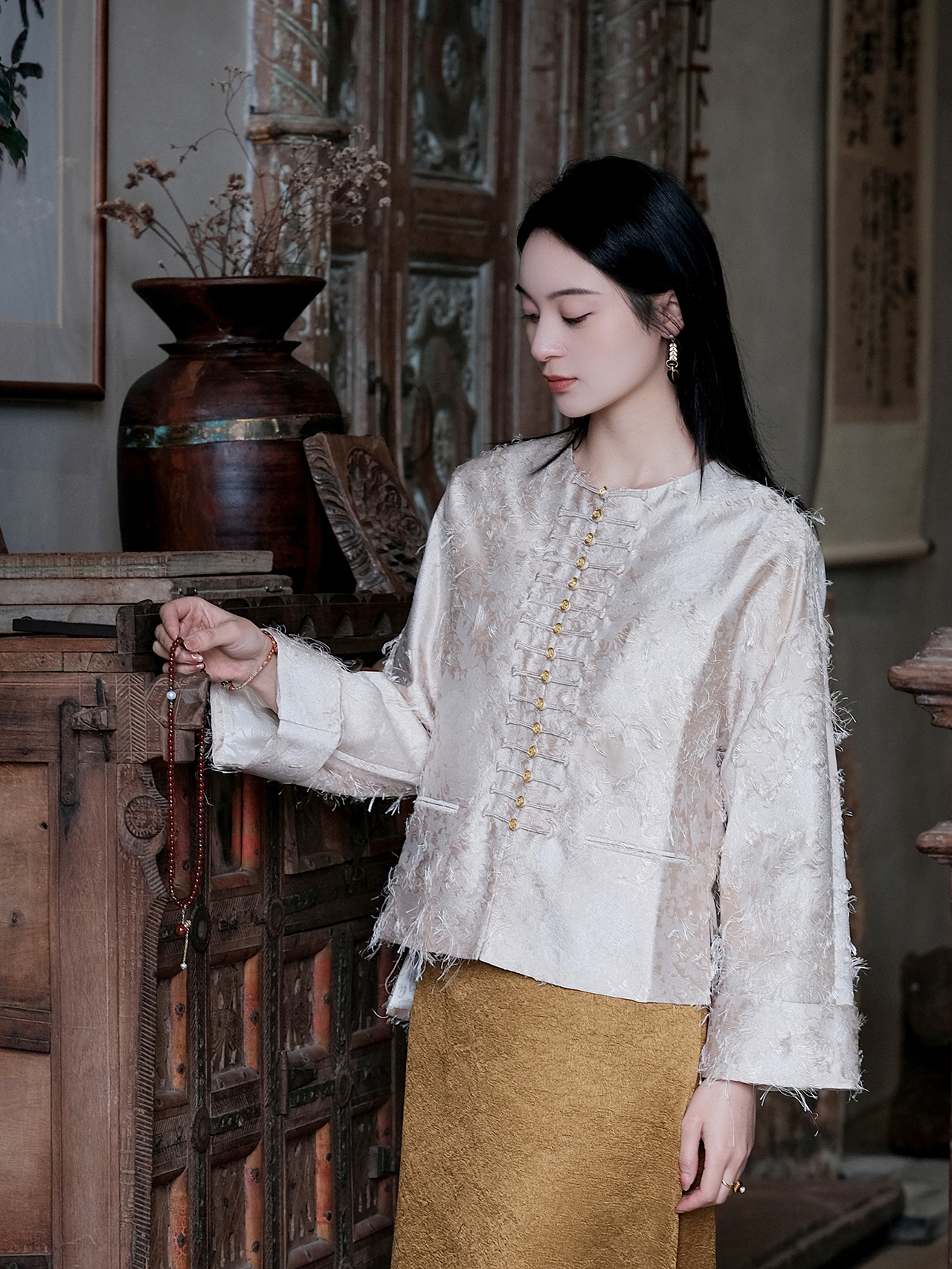 盛唐牡丹| 珍珠白真丝竹子纹偏襟上衣
