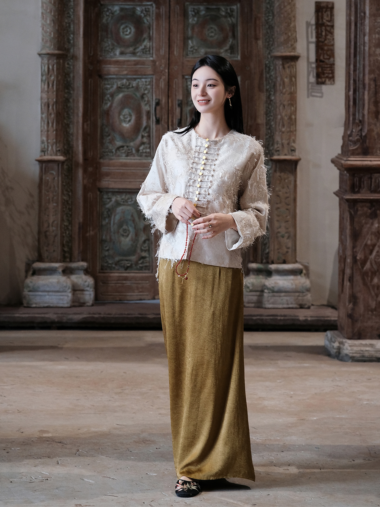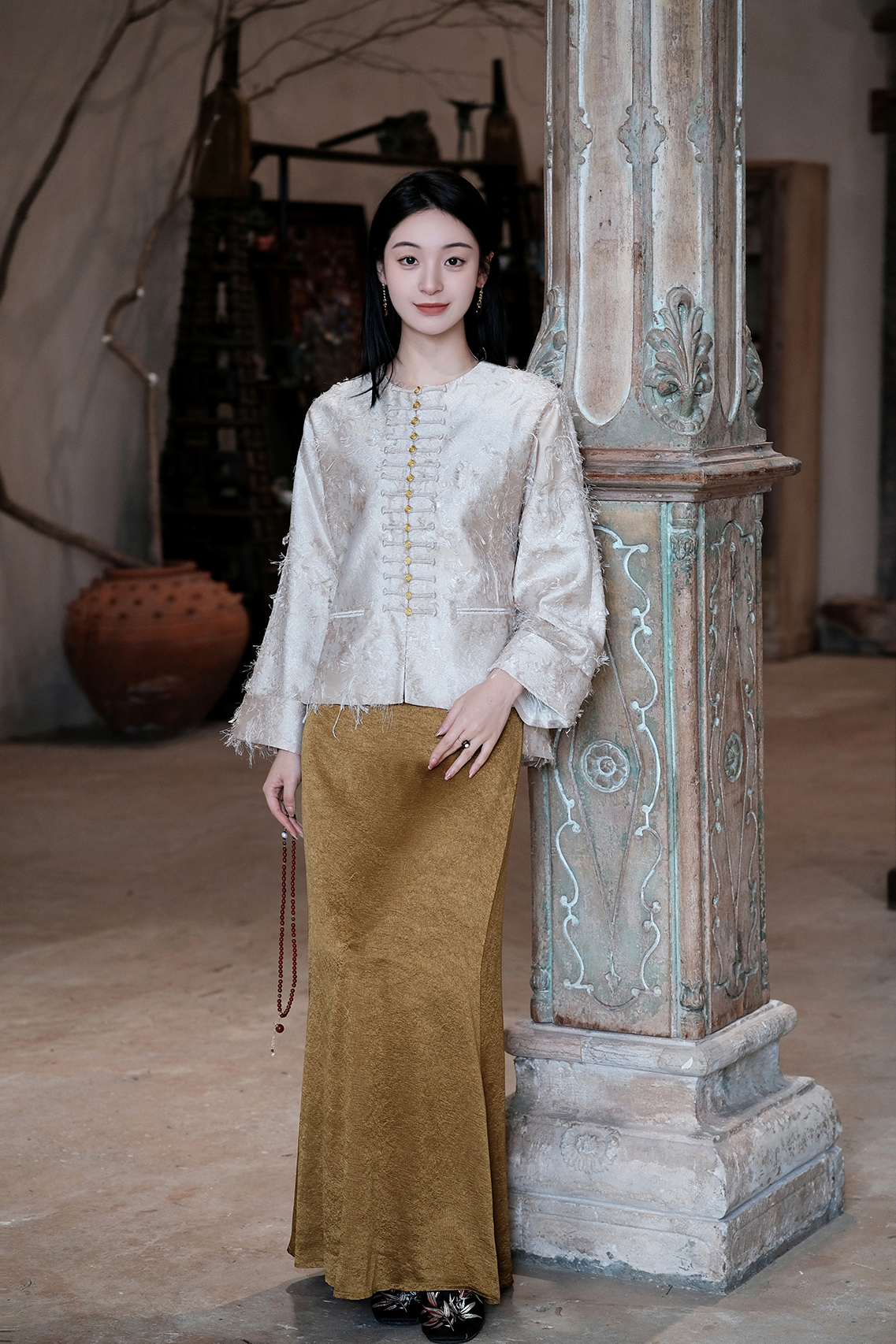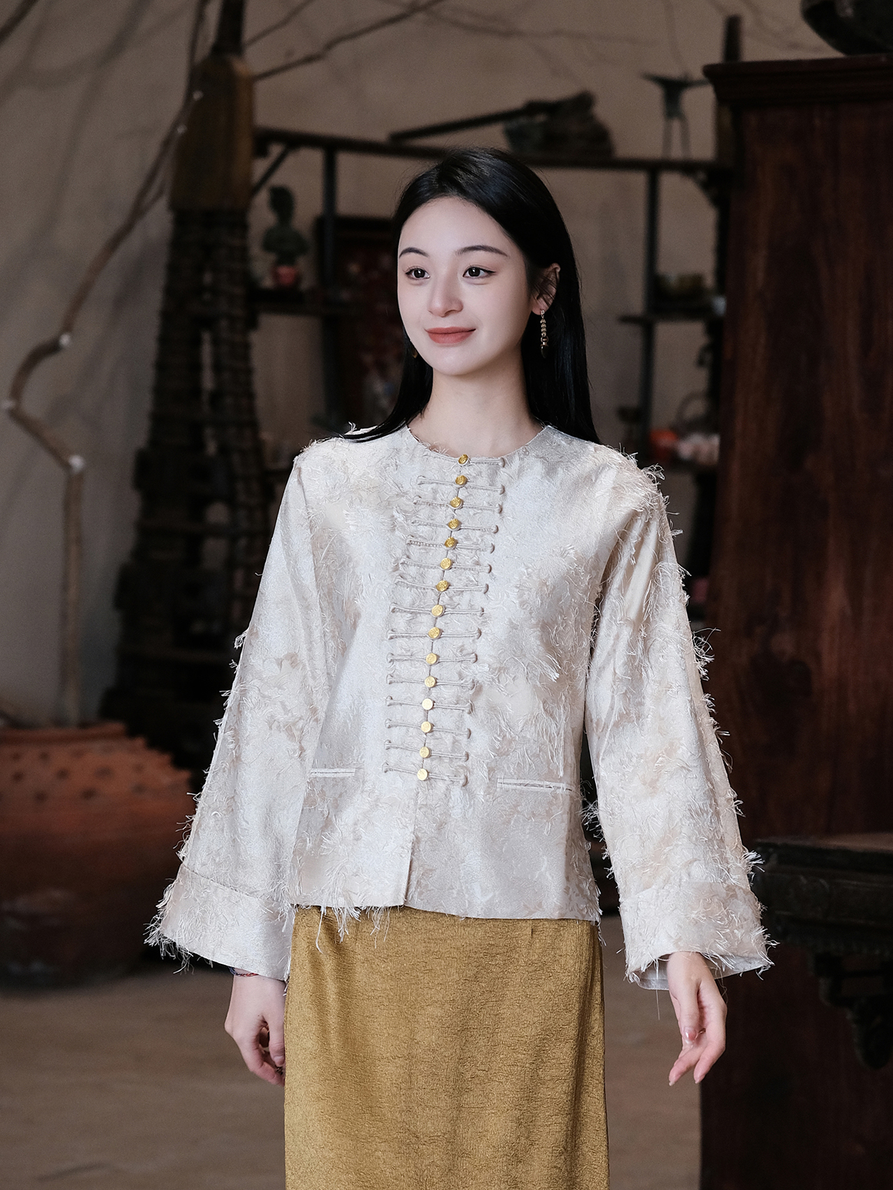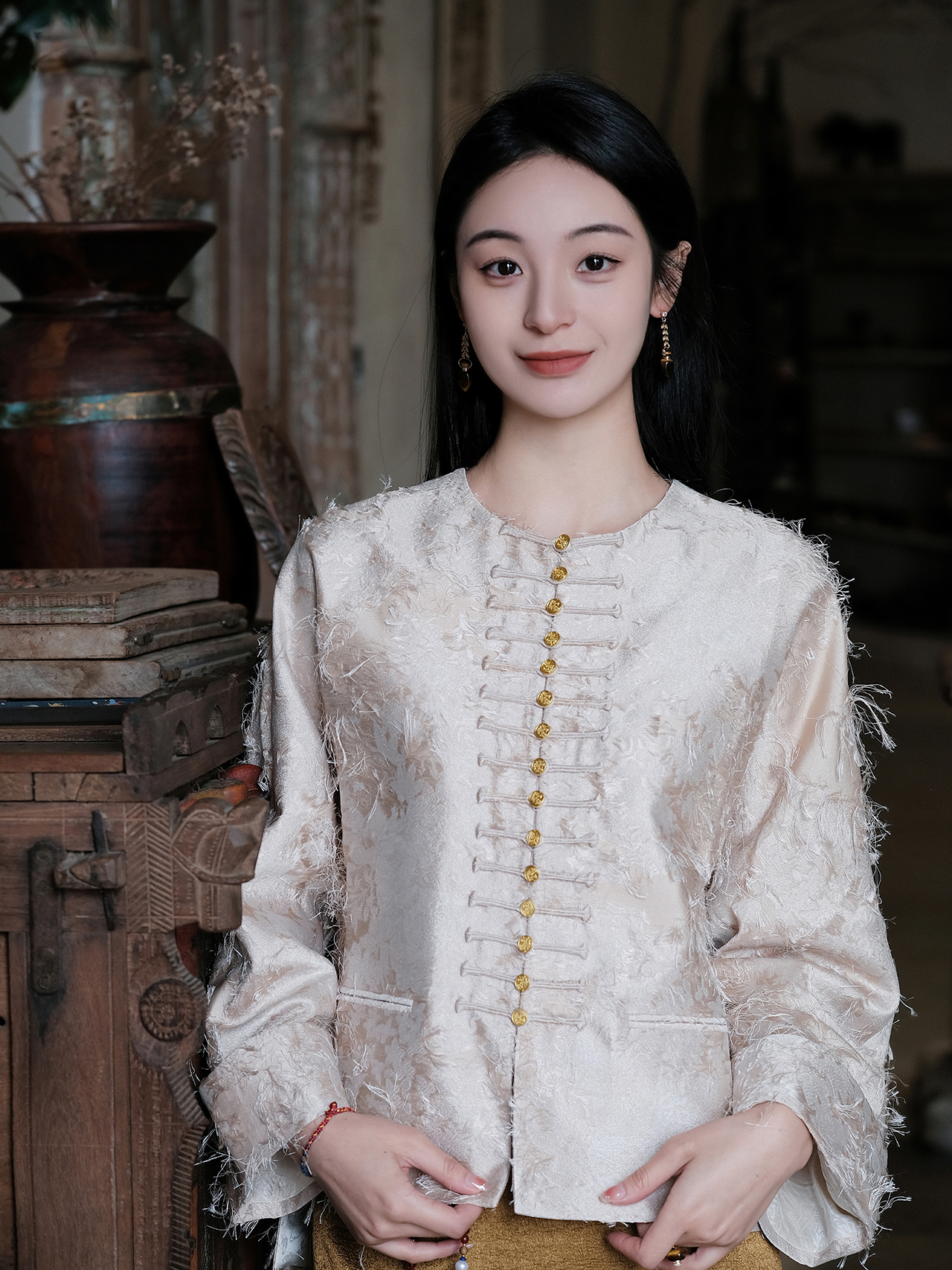 盛唐牡丹| 珍珠白真丝竹子纹偏襟上衣