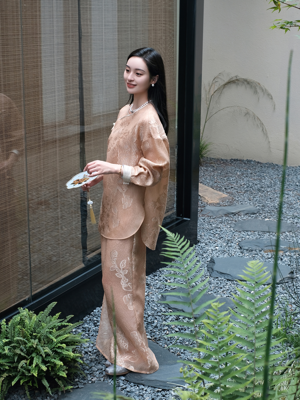盛唐婧 |桑蚕丝重缎折枝玫瑰花直筒裤-黑色