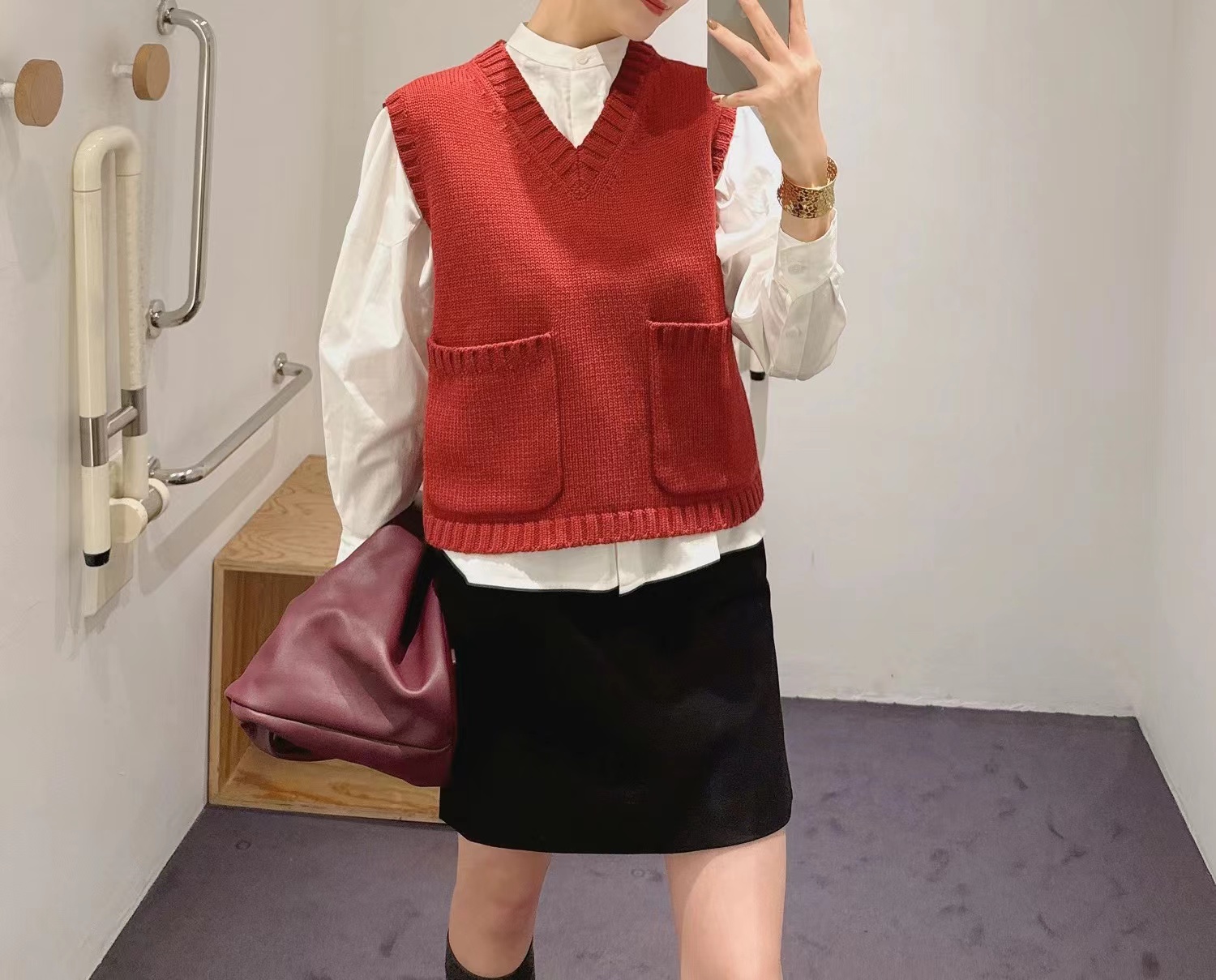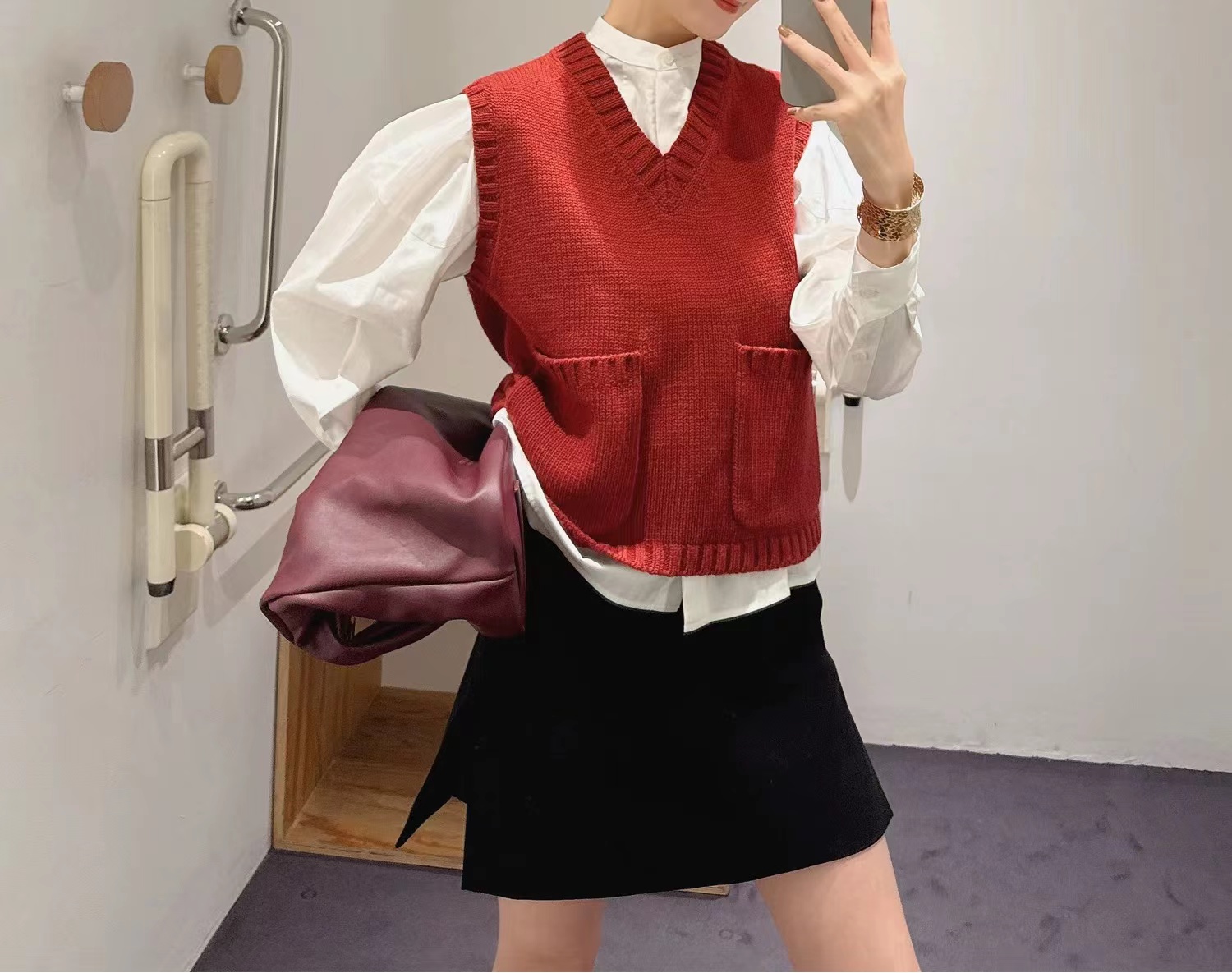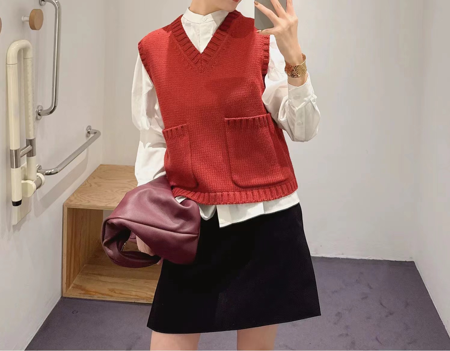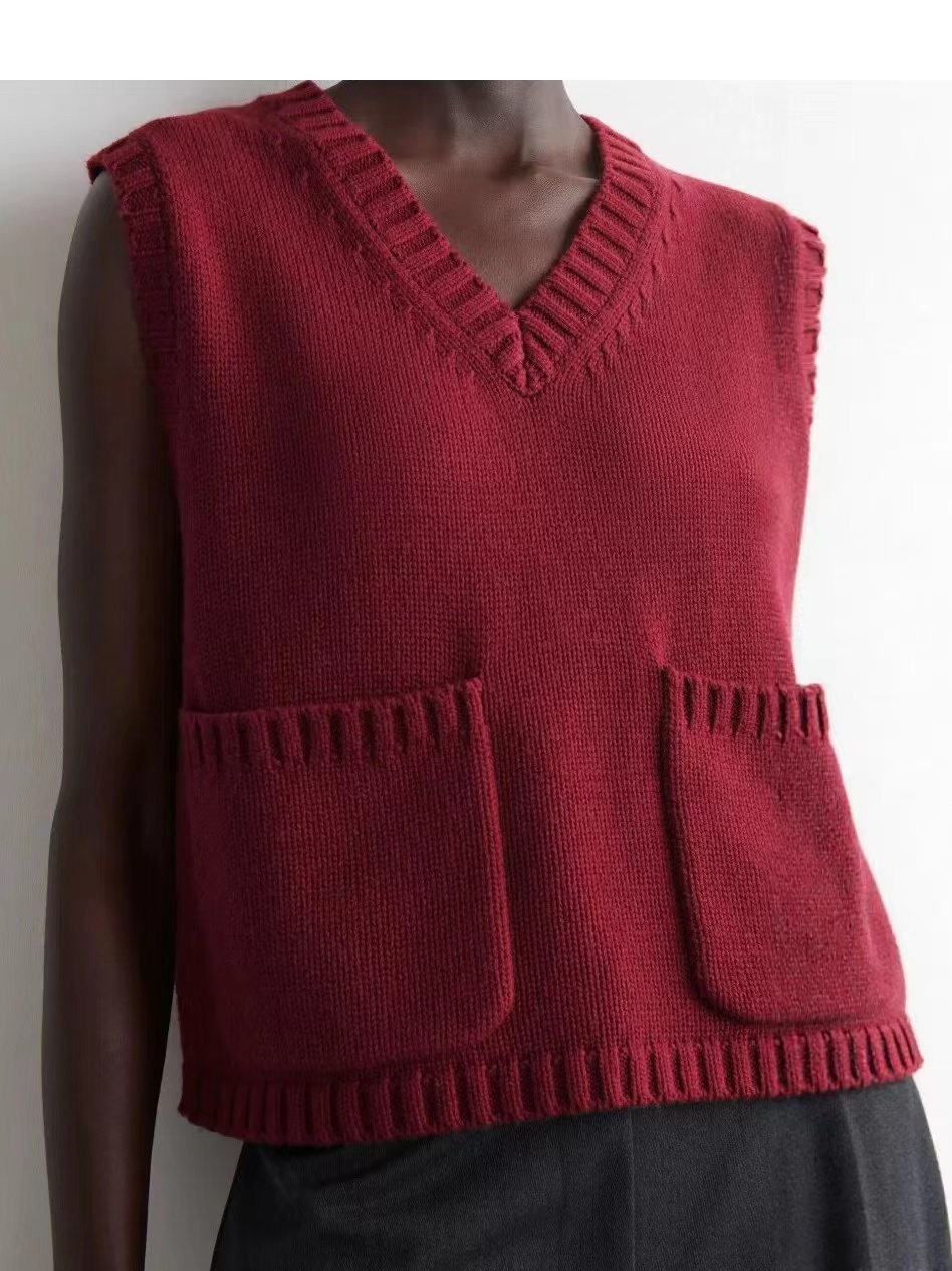 马甲2025冬季新款时尚V领大口袋红色无袖羊毛马甲背心坎肩女,叠穿神器~北欧小众酒红色无袖针织毛衣外搭背心马甲女,2025秋冬叠穿v领宽松坎肩上衣,尤选混纺针织纱线,触感舒适亲肤,设计感宽松箱型廓形剪裁,罗纹边V领修饰脖颈线条,也便于内搭各种打底,身前立体工装风贴袋,简单叠穿T恤打底衫,提升整体层次感~~~