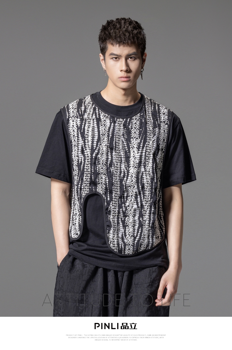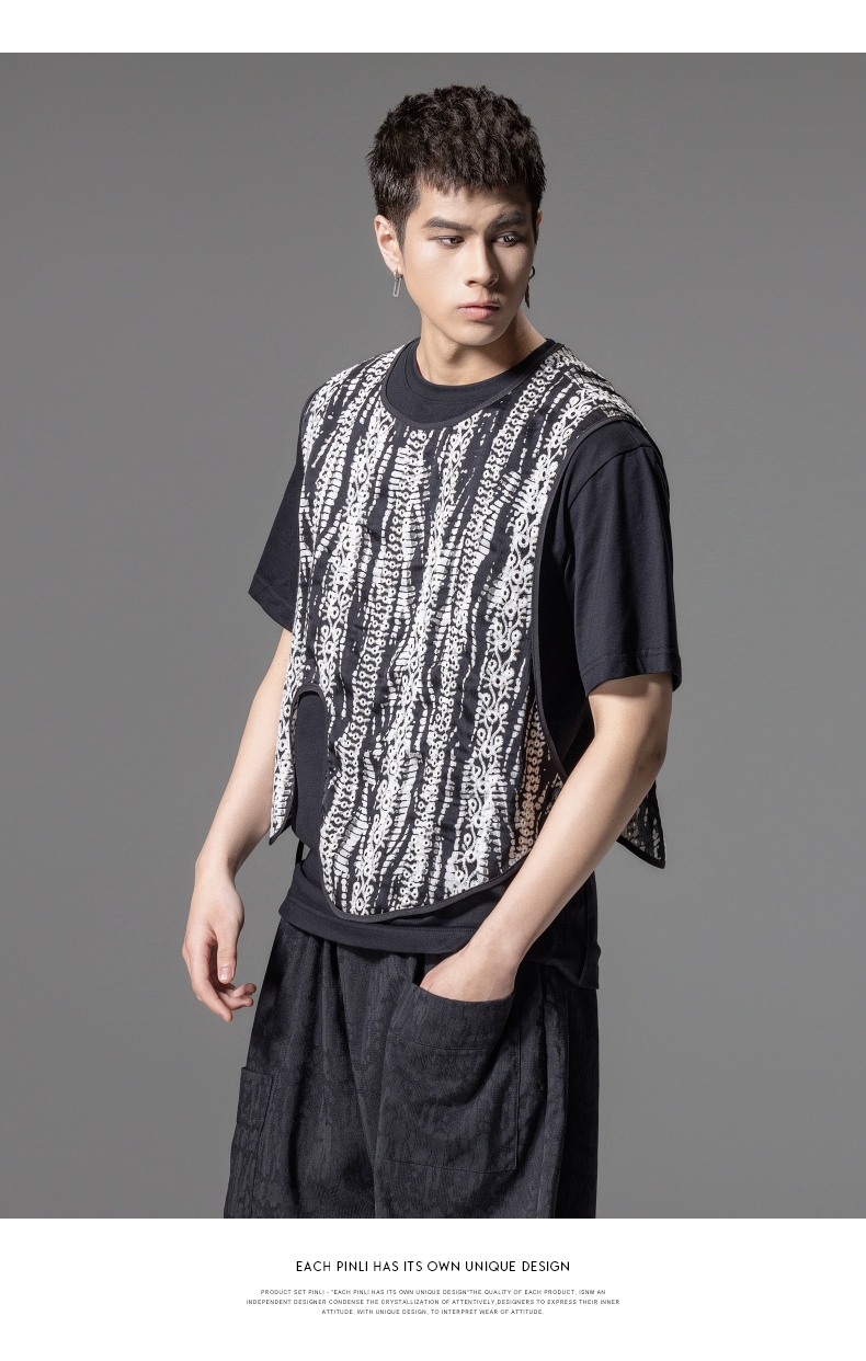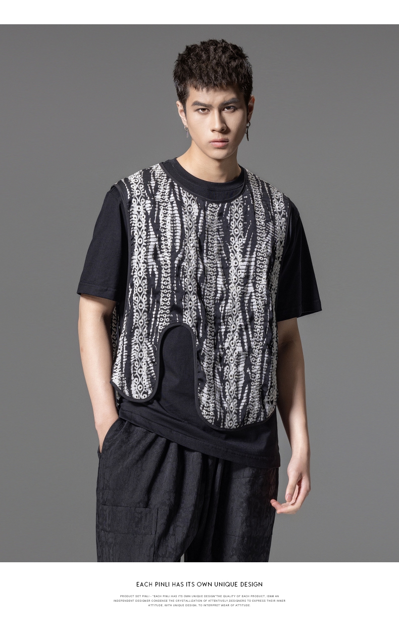 PINLI品立夏季新款新中式刺绣镂空马甲不规则下摆休闲男背心B242107122