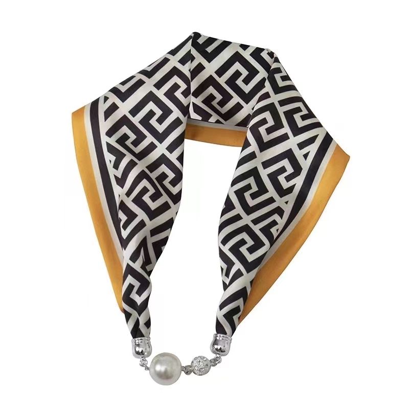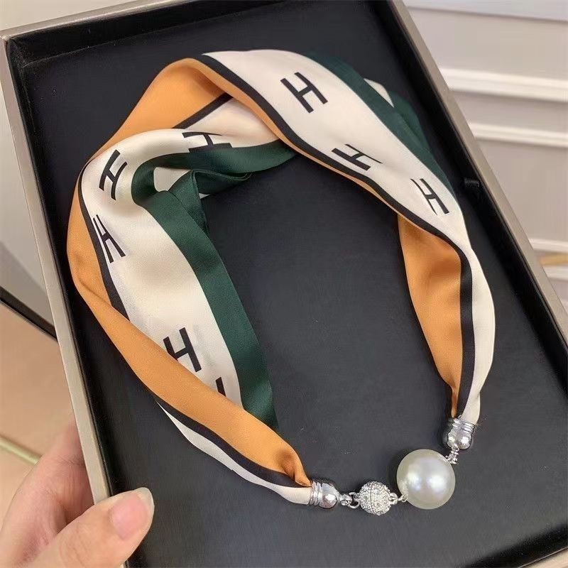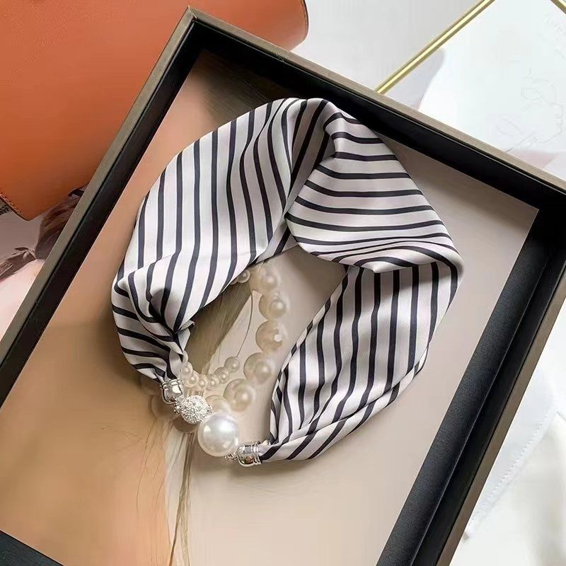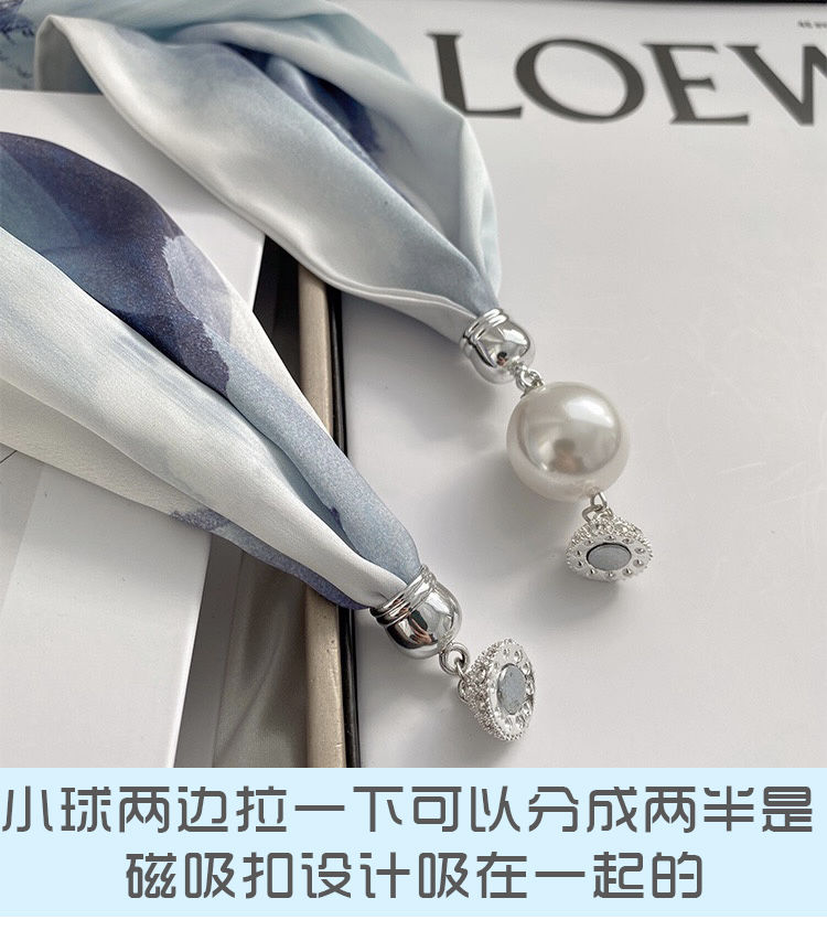 懒人磁扣丝巾女春秋薄款护脖子磁吸扣丝巾小长条领巾护颈珍珠项链
