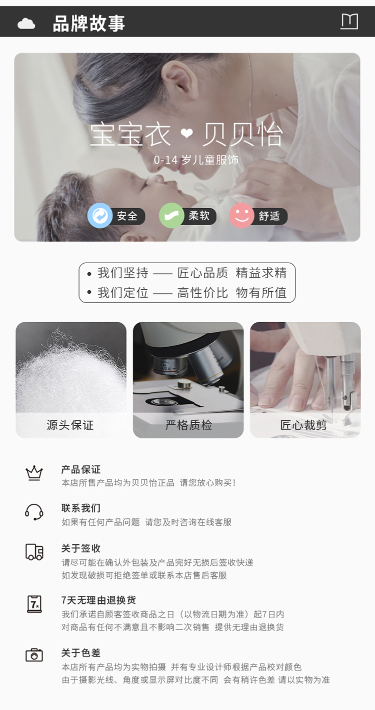 - 贝贝怡专注0-6岁婴幼儿服饰,坚持安全、柔软、舒适的产品理念,为千万中国家庭提供超高品质、安全可靠的婴幼儿服饰产品,妈妈放心,宝宝开心!