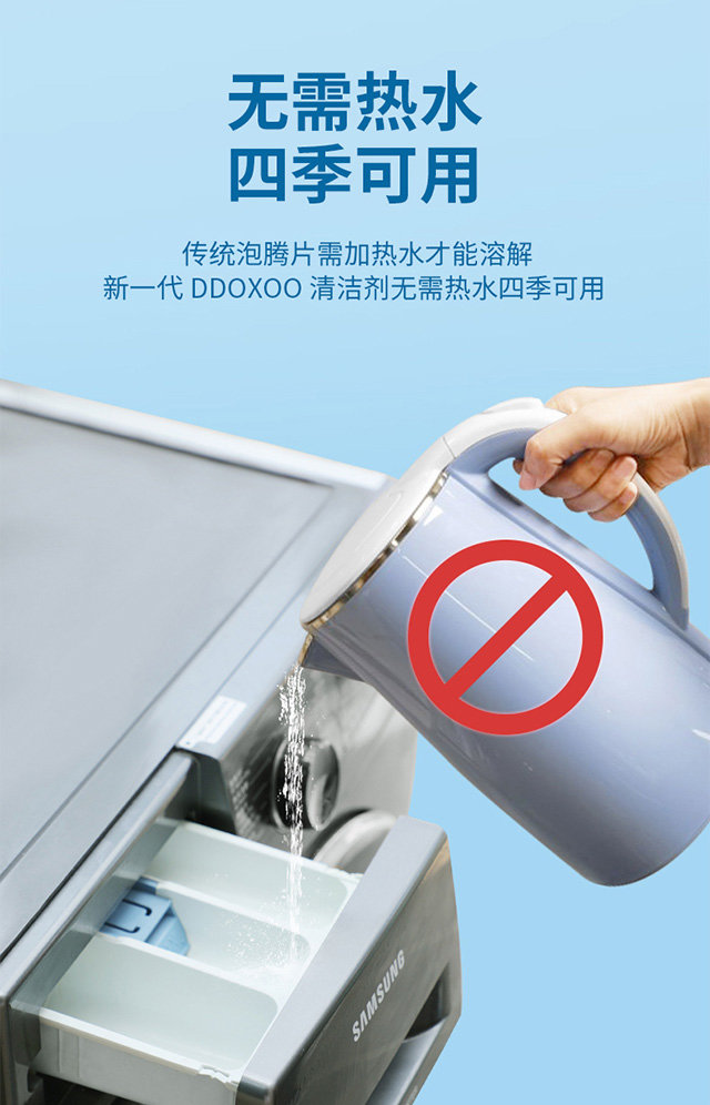 洗衣机的构造基本都是洗涤桶(外桶)+盛水桶(内桶),在中间的就是夹层。夹层我们平时是看不到的,但洗衣服时,夹层的水流很弱,污垢就会沉积下来。据央视报道:半年没洗过的洗衣机,细菌检出率达到99.99%+,污垢中的霉菌就会引发各种皮肤问题。很多洗衣机清洗剂都特别麻烦,对水温有要求,时间还特别长,但DDOXOO就很方便了,不用热水,也不用浸泡,直接倒几瓶盖进洗衣机,让洗衣机自己清洗就可以。
