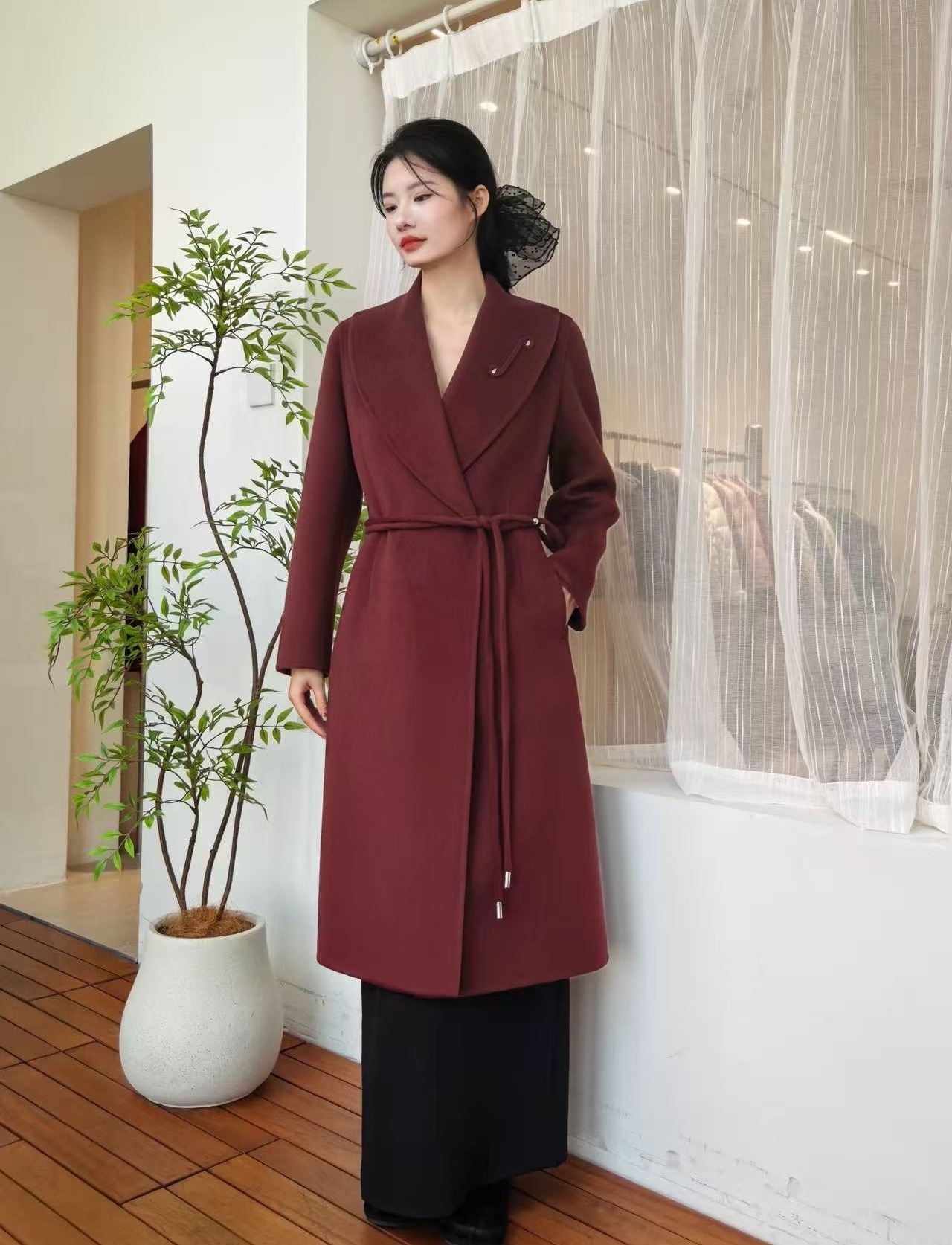 SZ6C07_朱红色_大衣_秋冬_大翻领系带收腰中长款双面呢_高级女装_BERNIEELEN 伯妮斯茵