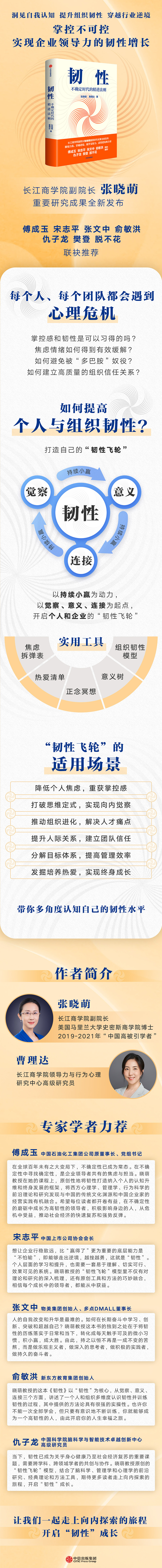 在全球百年未有之大变局下,不确定性已成为常态。在不确定性中寻找确定性,是企业领导者共有的焦虑与担当。晓萌教授在她的课程上,原创性地将韧性打造纳入个人的认知升维和终身发展的框架,将西方心理学、管理学、行为科学的前沿理论和研究发现与中国的传统文化渊源和中国企业家的经营实践有机融合。希望每位读者都开卷有益,在不确定性的磨砺中成长为高韧性的领导者,积极影响身边的人,从危机中受益,推动社会经济的快速复苏和强势反弹。