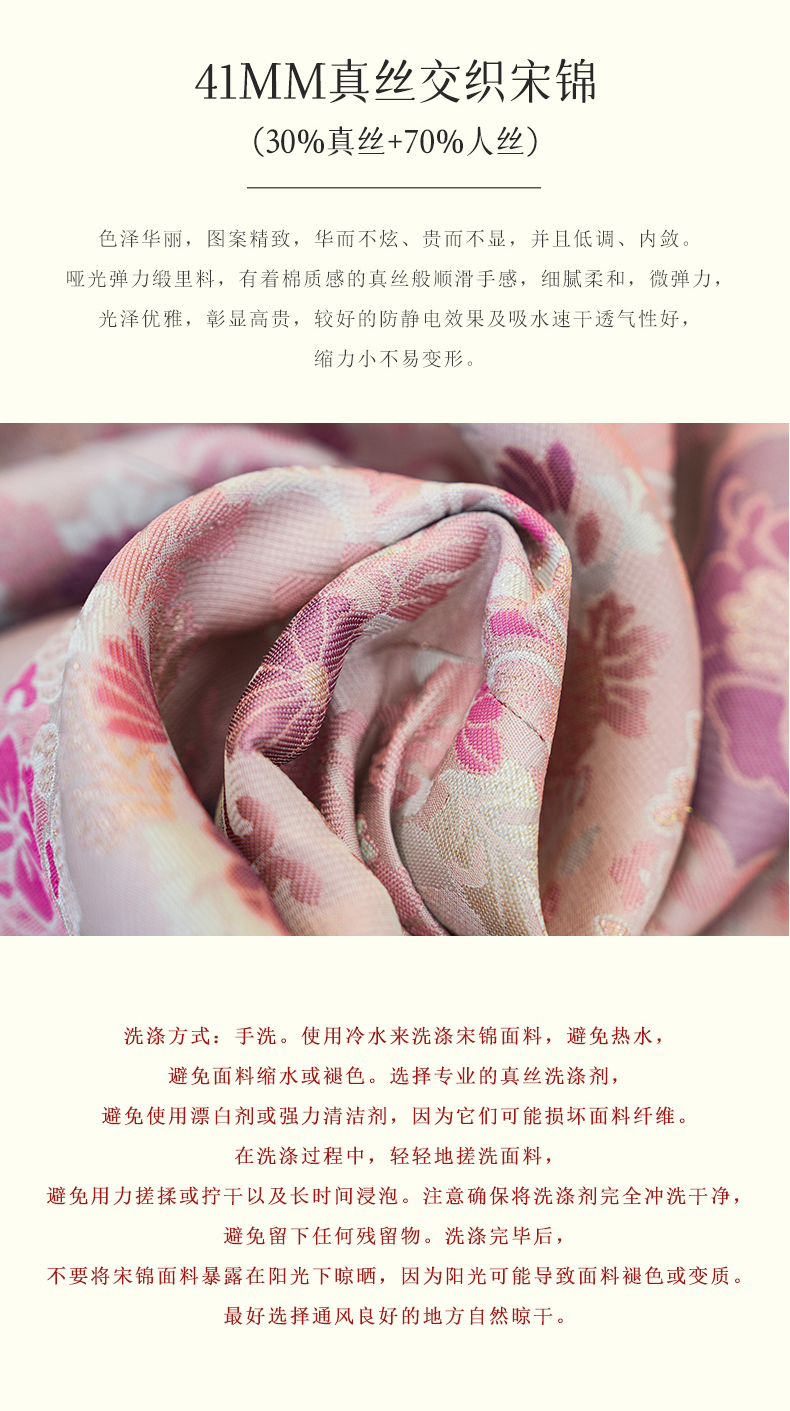宋锦被赋予中国“锦绣之冠”.它图案精美、色彩典雅、平整挺括、古色古香, 色彩层次分明,调和文雅,配色典雅和谐,充满富贵气息。