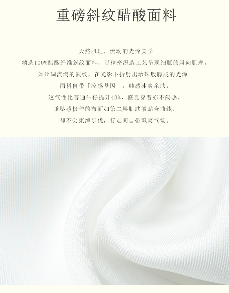 斜纹醋酸是很贵的面料,手感柔软而有挺括感,恰到好处的紧实度和垂度,穿着就是上千的品质!!!