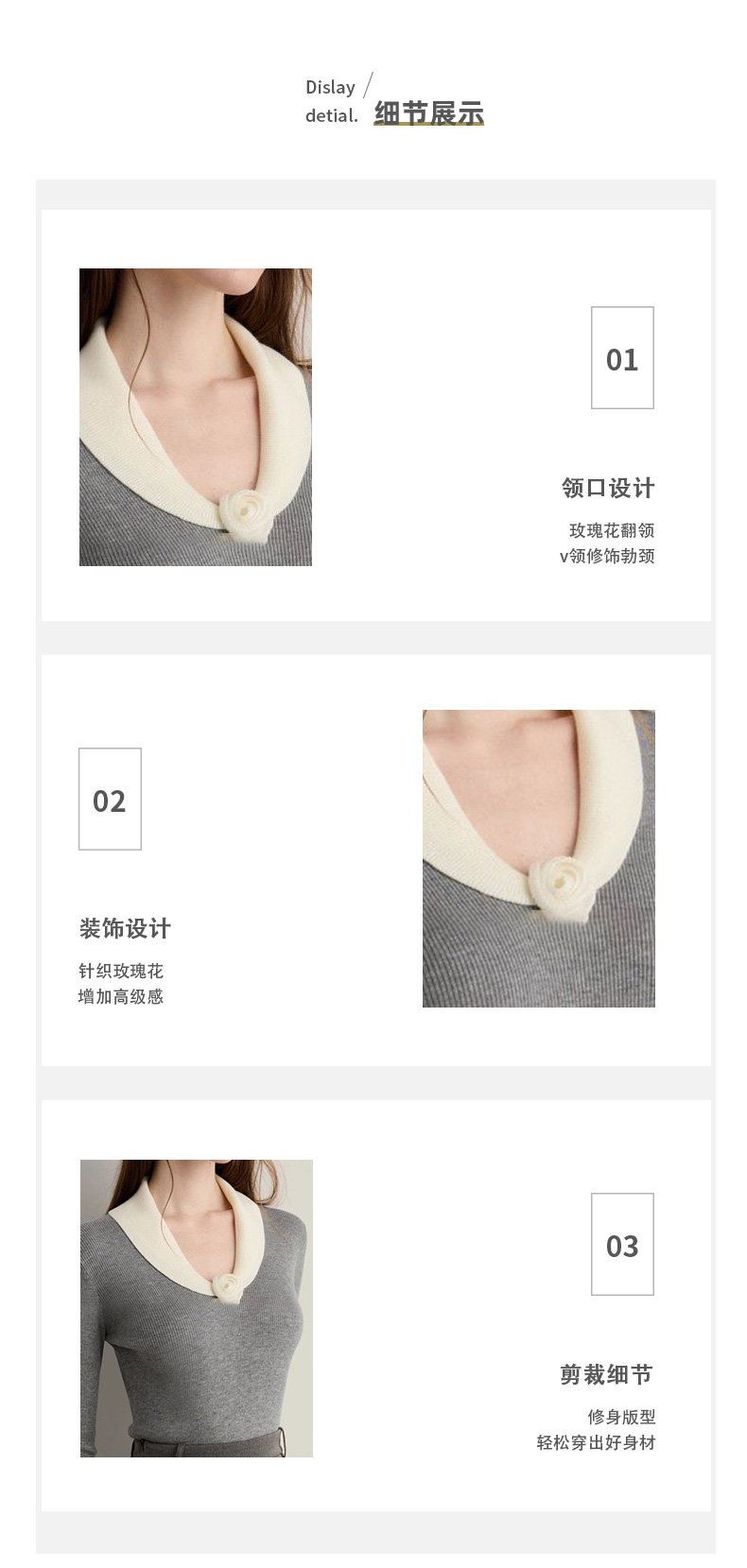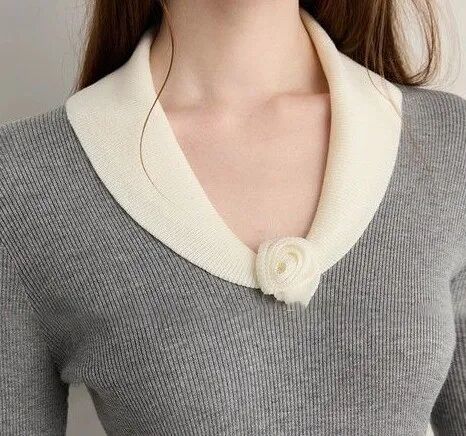 尤其令人惊艳的是它的玫瑰花翻领设计——米白色宽边V型领口,巧妙点缀一枚立体针织玫瑰花,宛如一束静谧绽放的白玫瑰,温柔却不失力量。