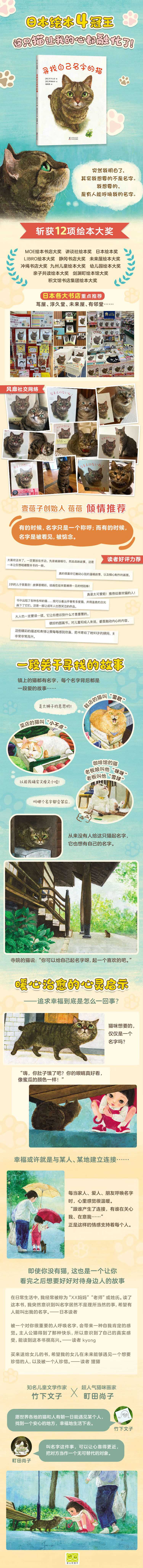 一段关于寻找的旅程。没有名字的猫踏上漫长旅途寻找自己的名字。旅途最后,它找到了只属于它的宝物,也让我们发现了一直被忽略的重要东西。