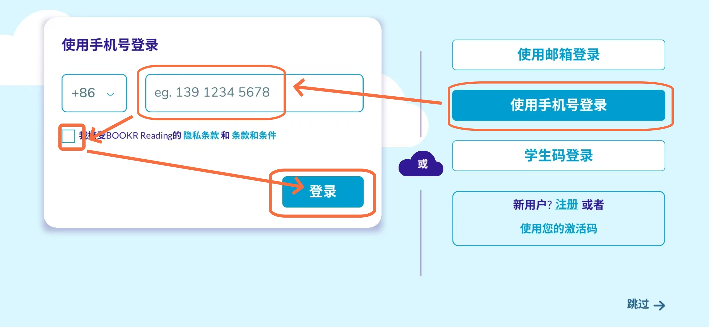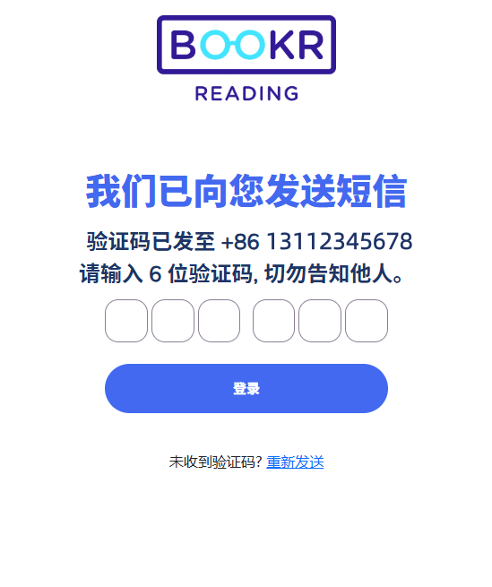打开BookR Reading选择刚刚注册的手机号进行登录,输入验证码