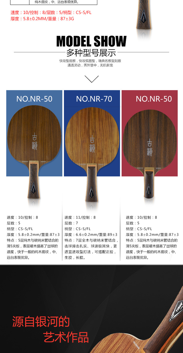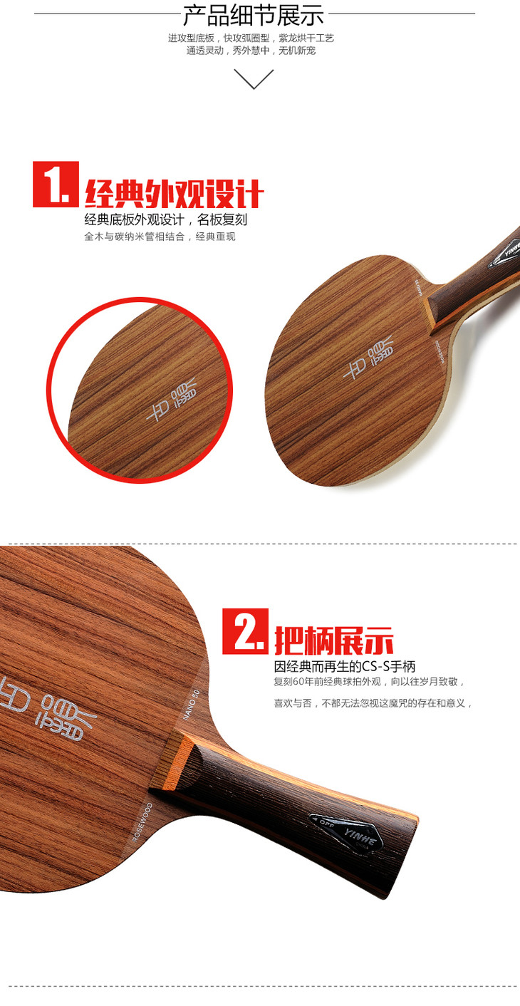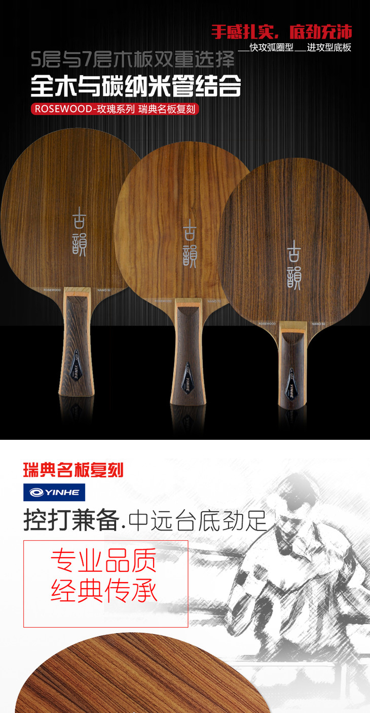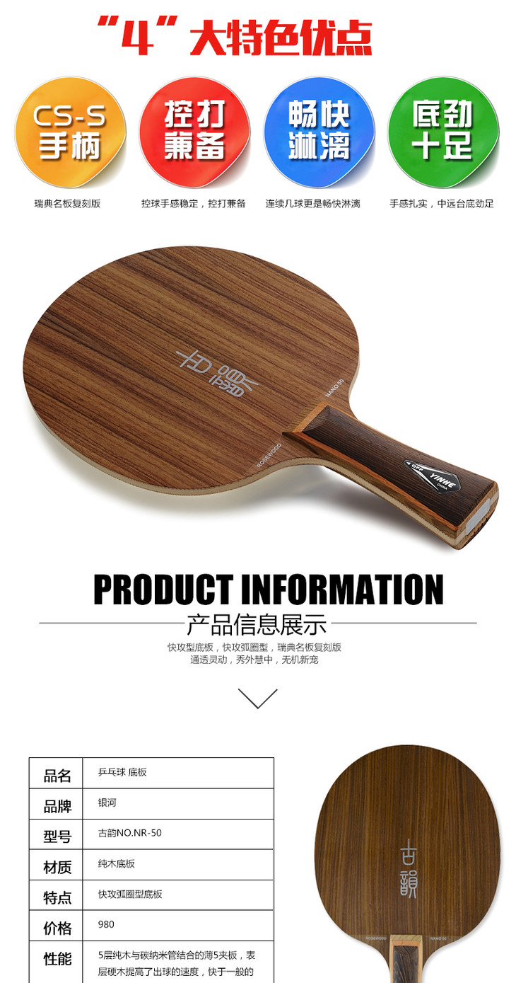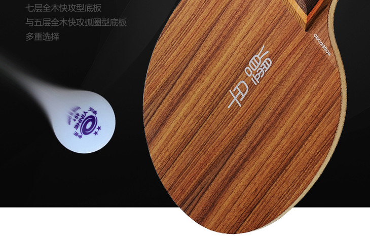 5层全木与碳纳米结合的薄5夹板,表层硬木提高了出球的速度,快于一般的纯木底板,中、远台表现优异。