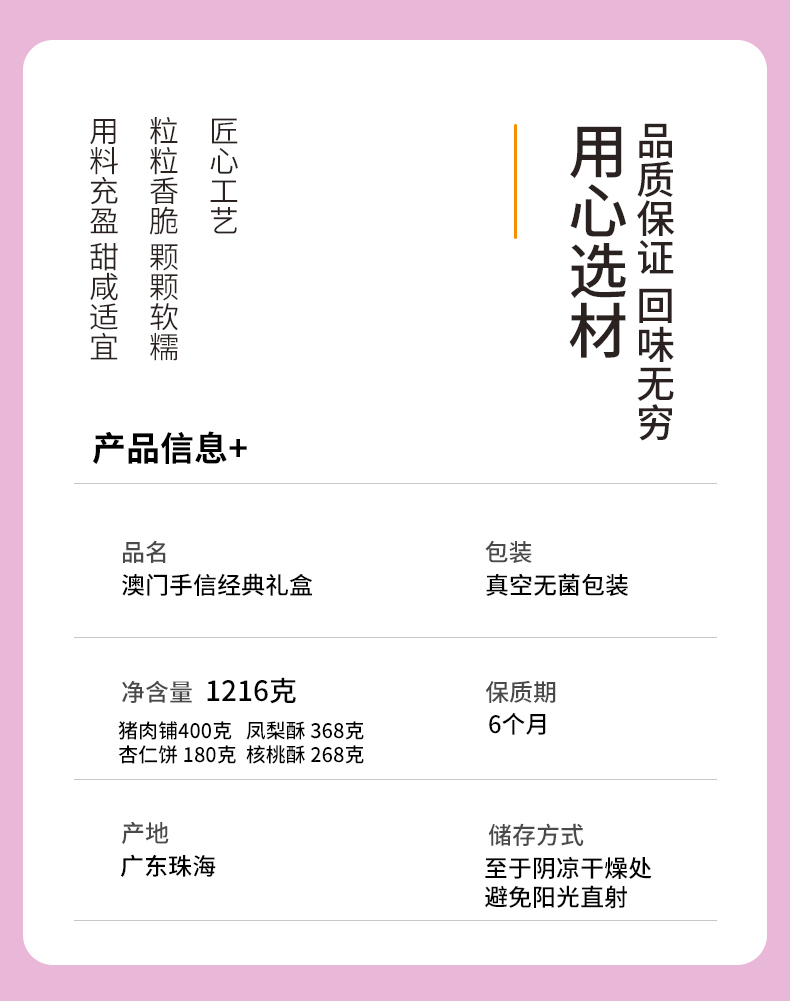 | 【品名】西点港南北盛宴国潮礼盒/经典手信礼盒 【规格】 南北盛宴国潮礼盒1229g(核桃酥+凤梨酥+雪花酥+鸡仔饼) 经典手信礼盒1216g(猪肉脯+凤梨酥+核桃酥+杏仁饼) 【保质期】 南北盛宴国潮礼盒9个月 经典手信礼盒6个月 【发货包装】纸箱 【产地/发货地】广东珠海 【发货快递】中通 【不发货区域】新疆、西藏、疫情地区、港澳台地区不发货 【补邮费地区】甘肃、宁夏、青海、内蒙+10 【发货时效】48小时,节假日顺延 |
