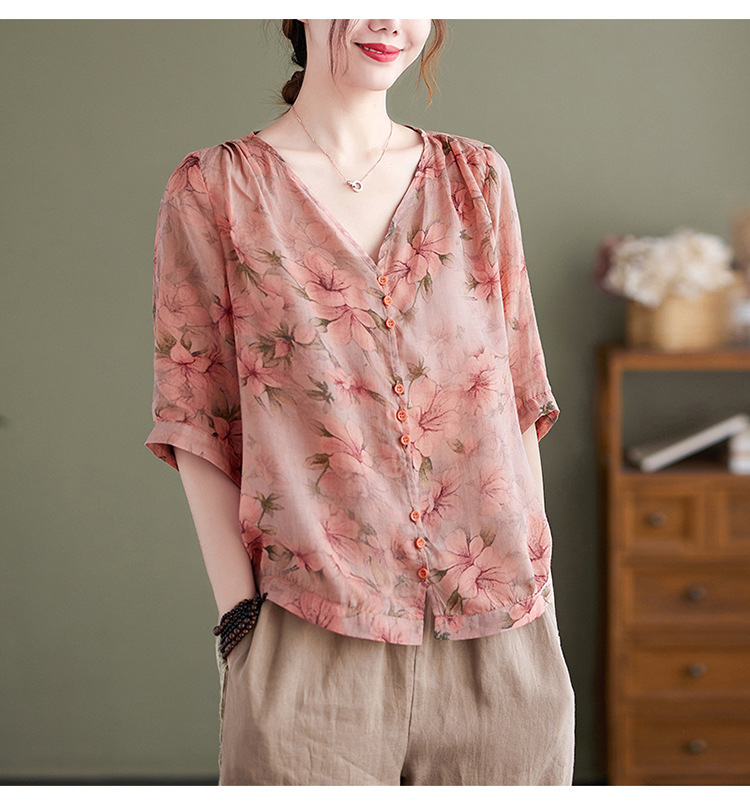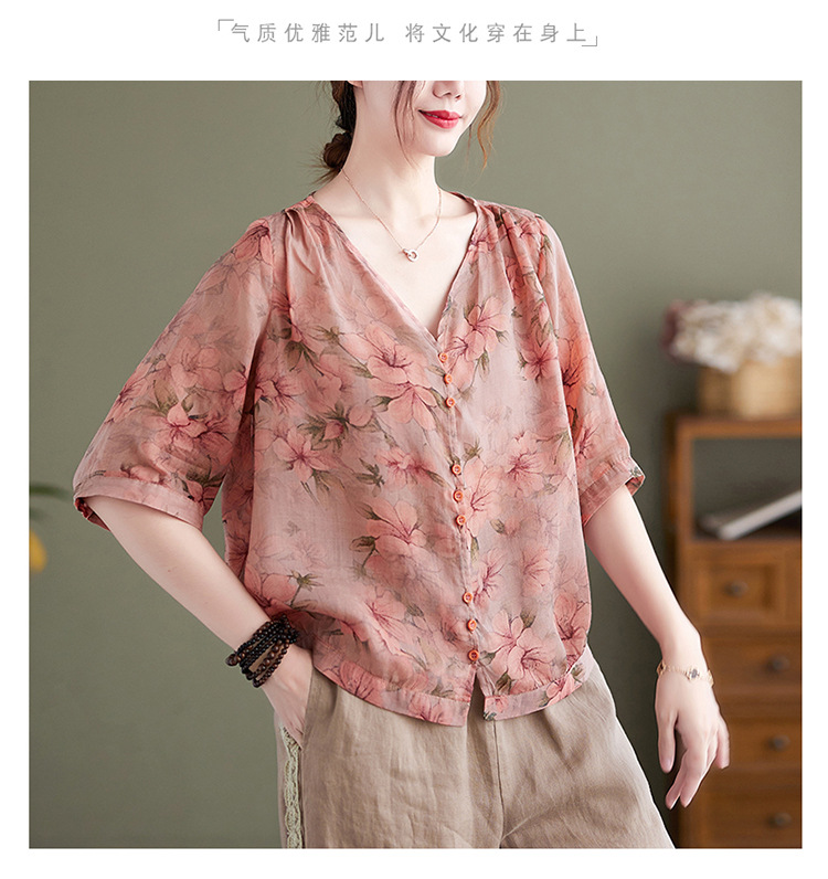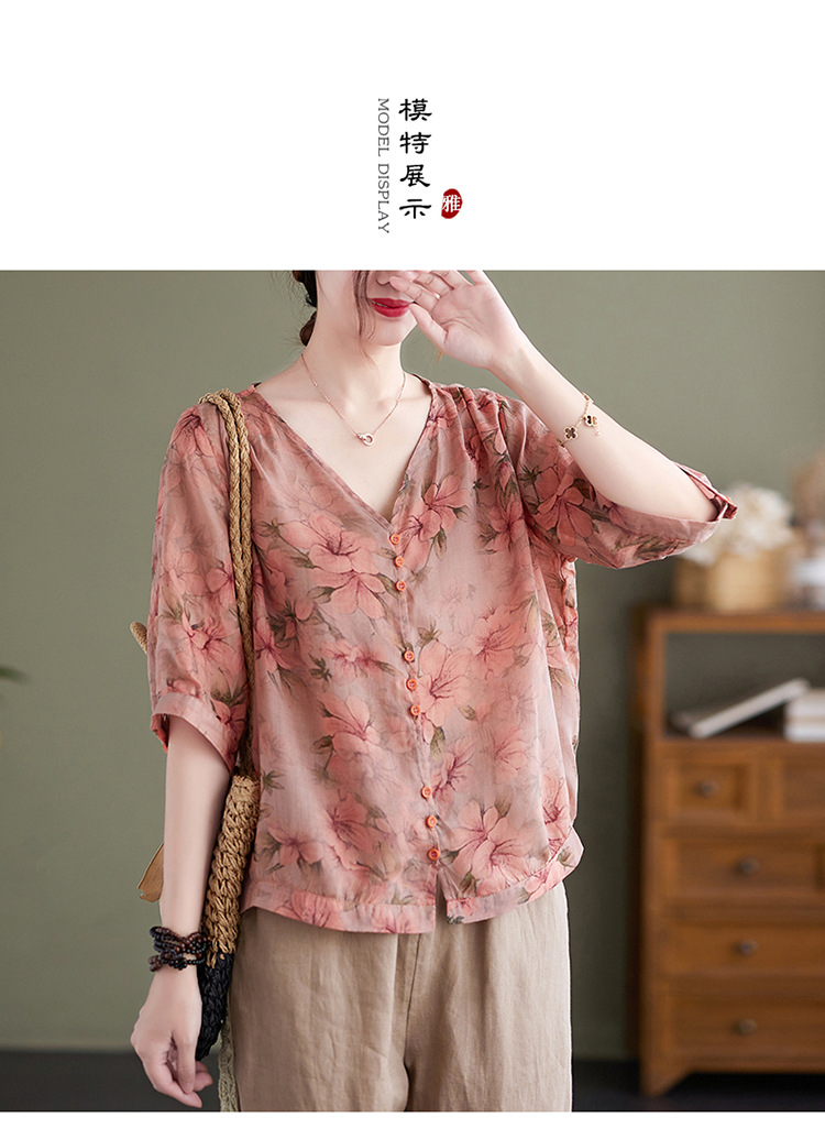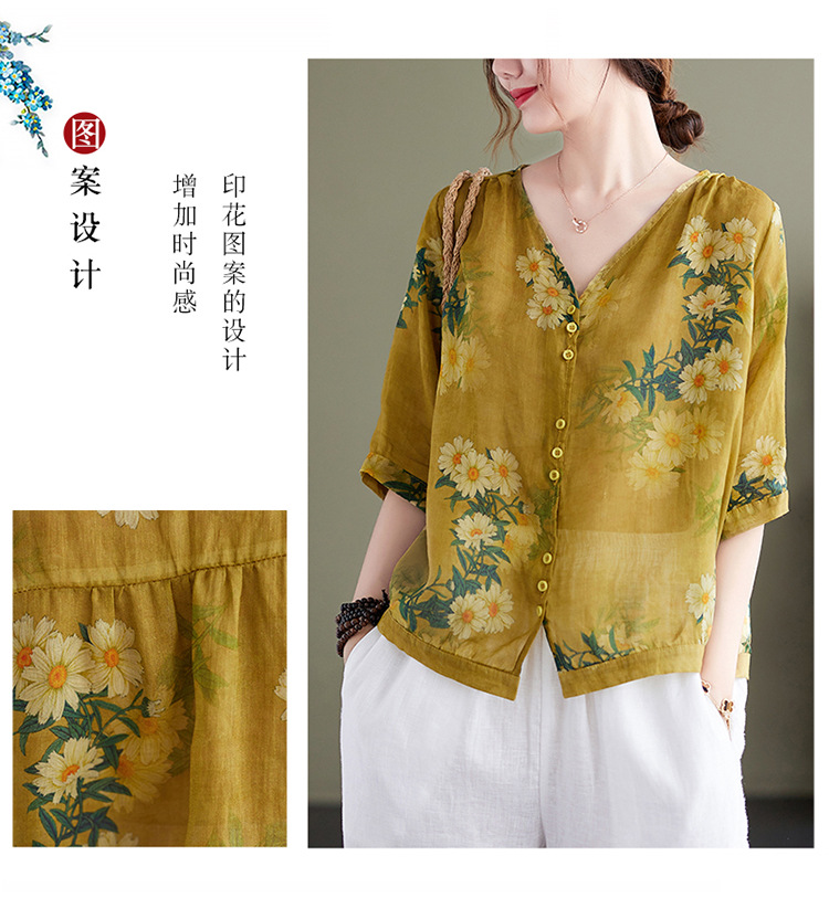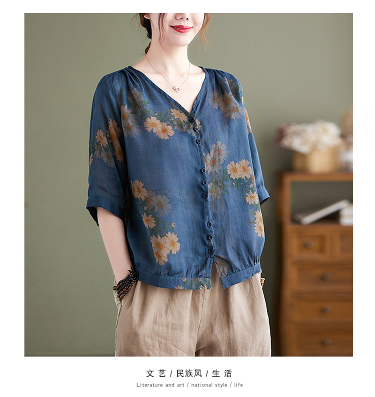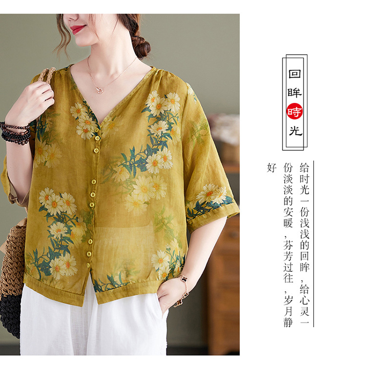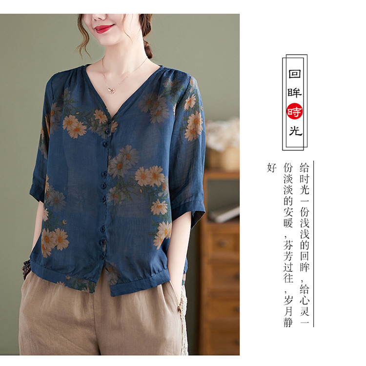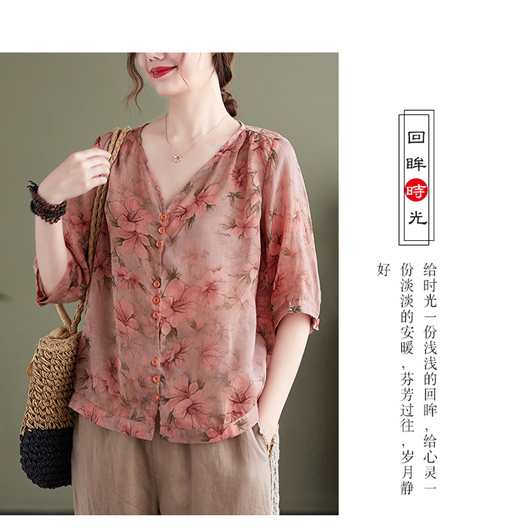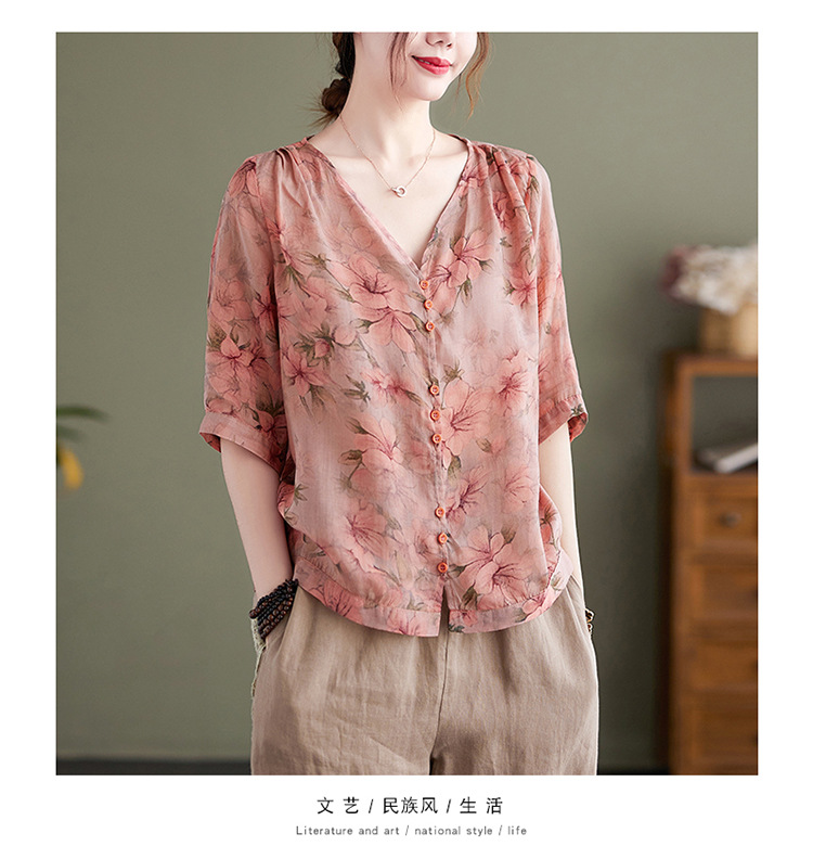 SMZ9167 复古文艺衬衫女2023夏装宽松大码显瘦V领印花中袖衬衣上衣小衫潮