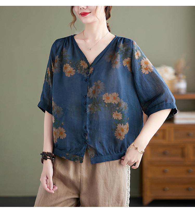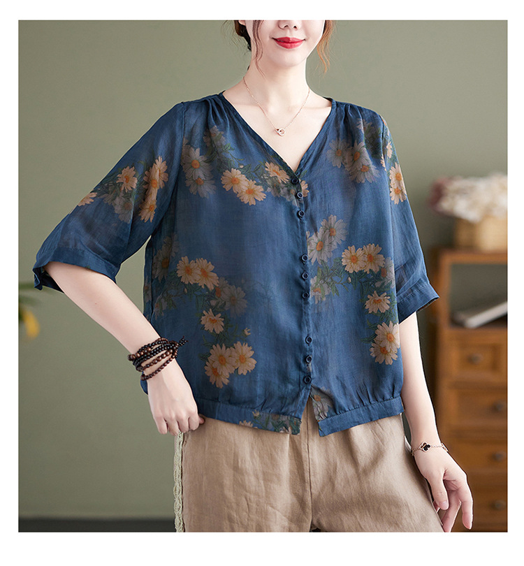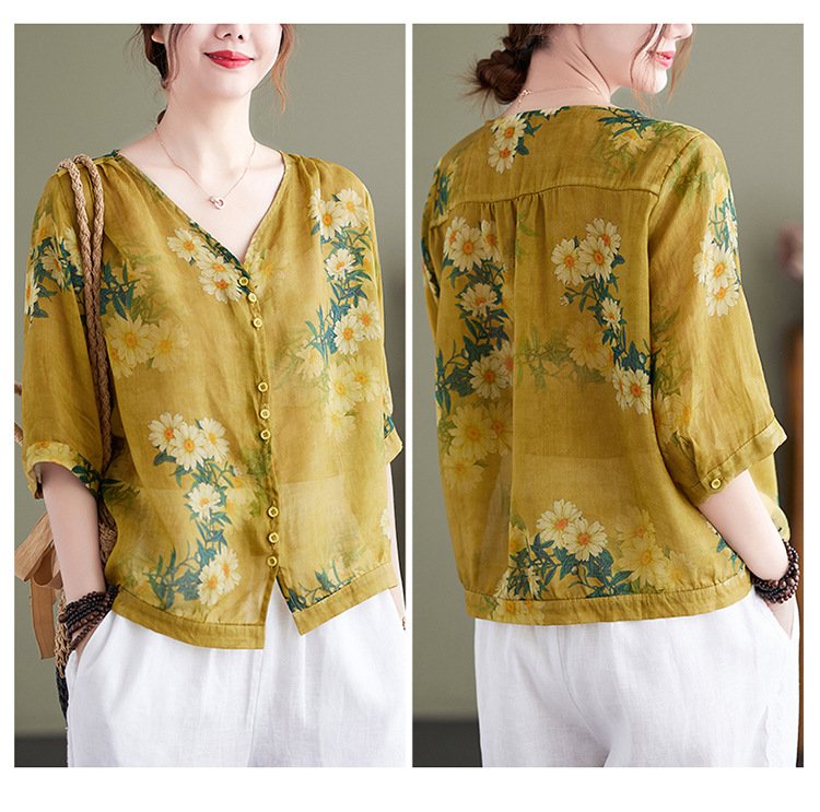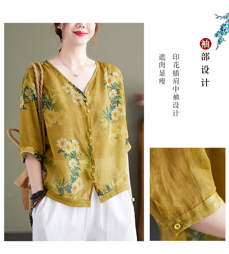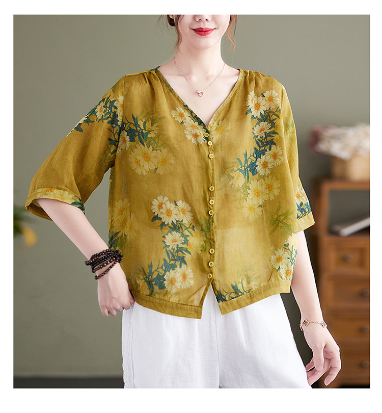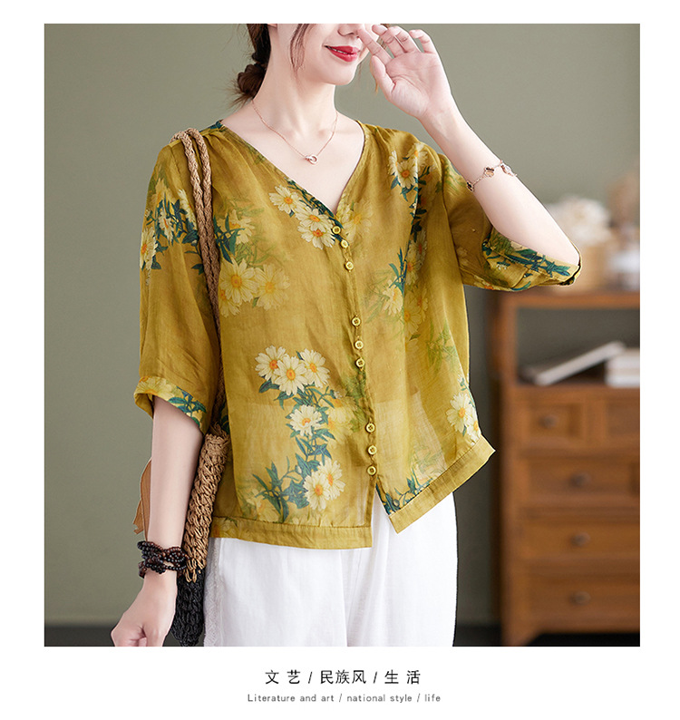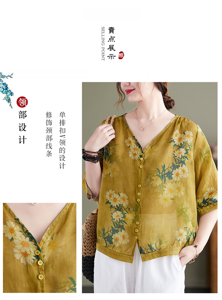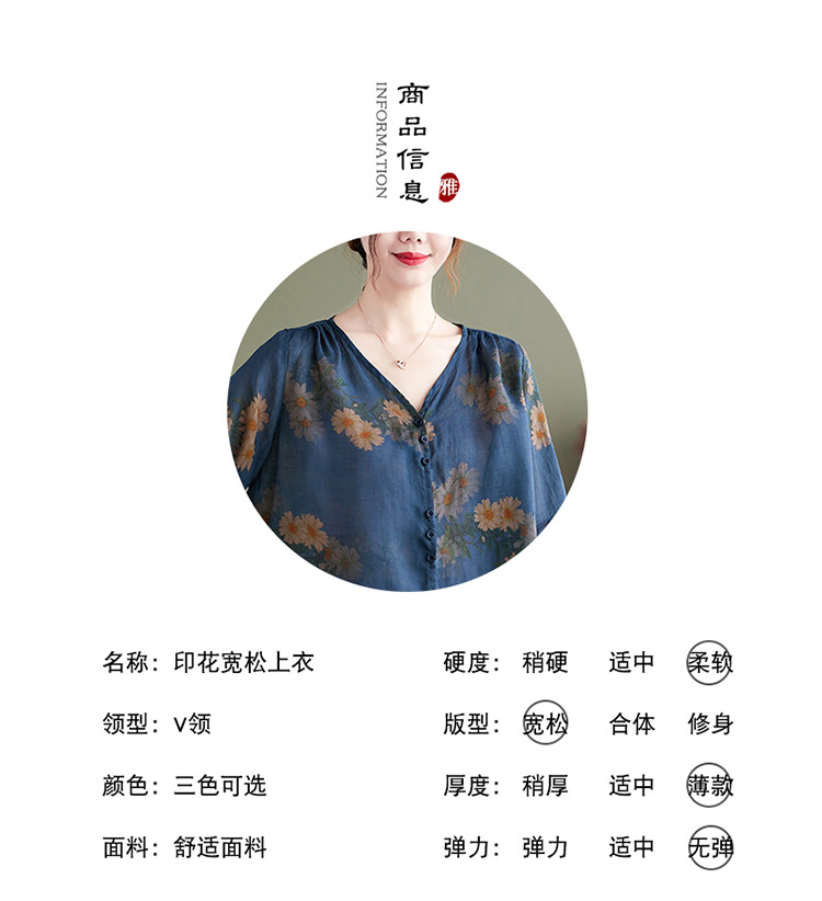 SMZ9167 复古文艺衬衫女2023夏装宽松大码显瘦V领印花中袖衬衣上衣小衫潮