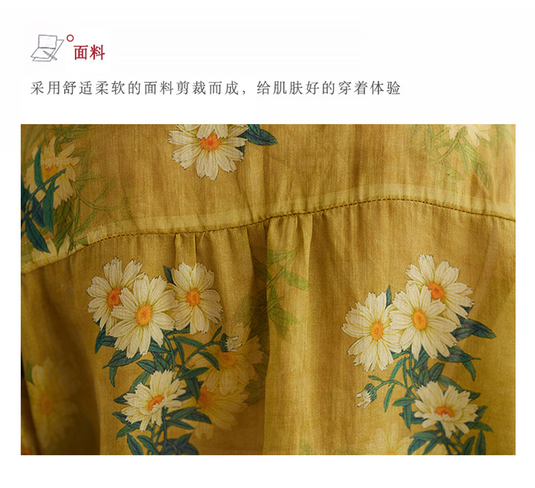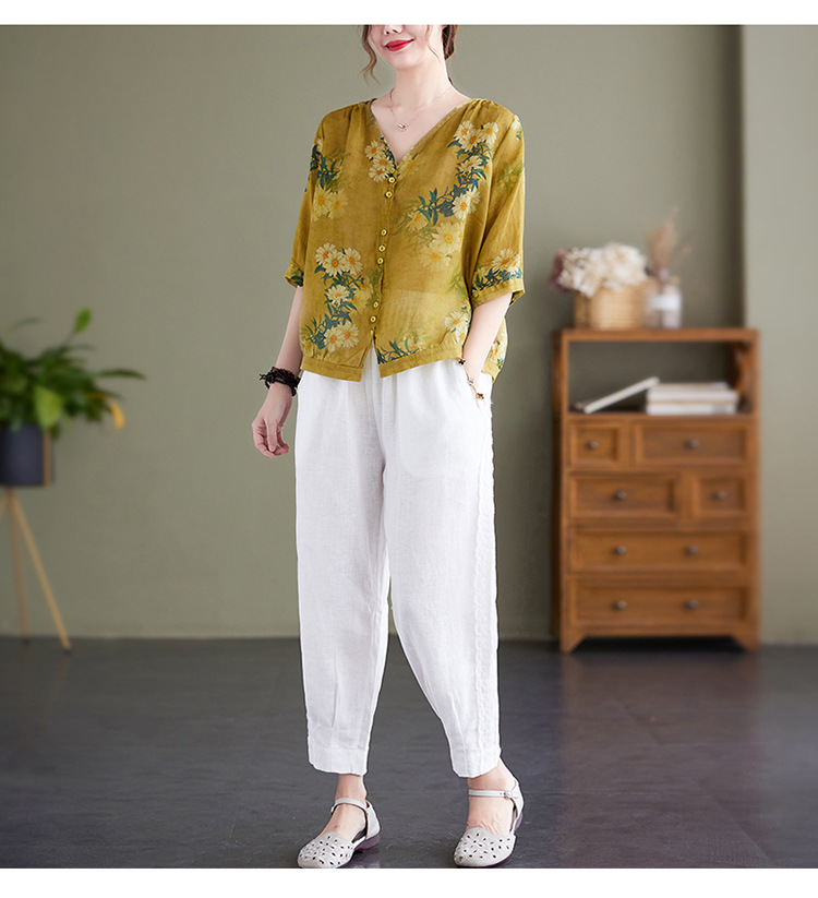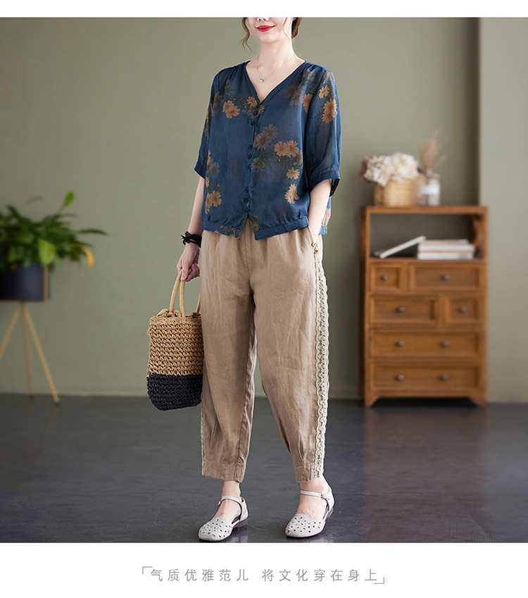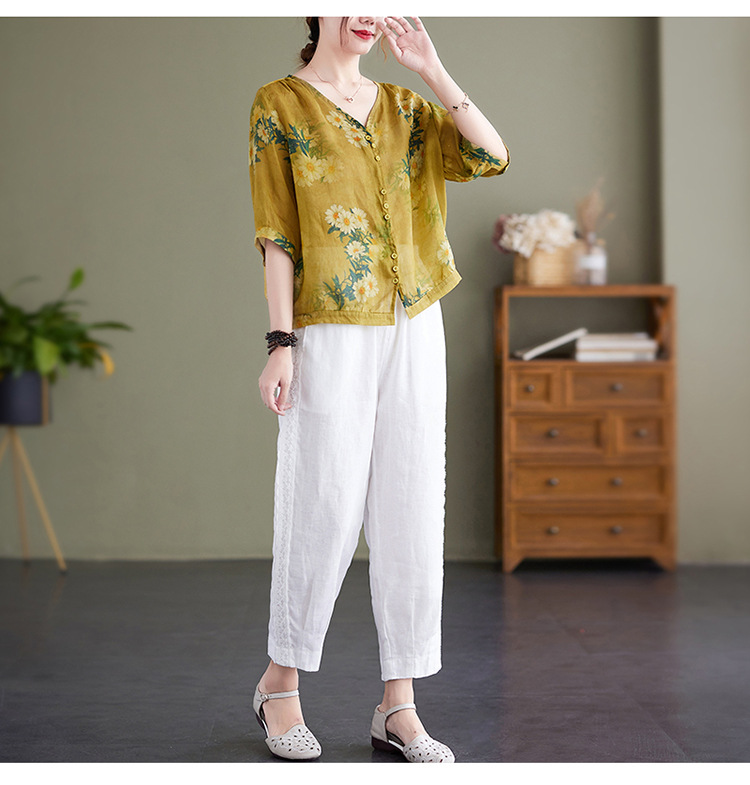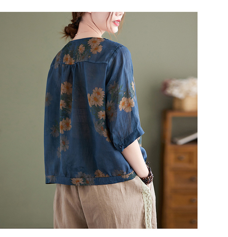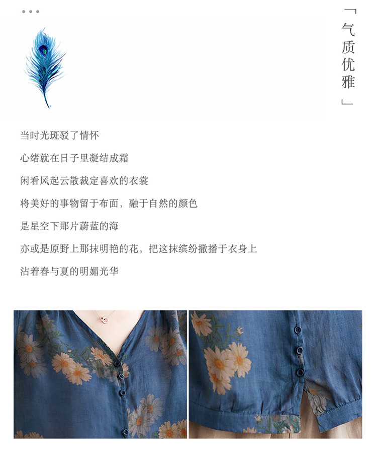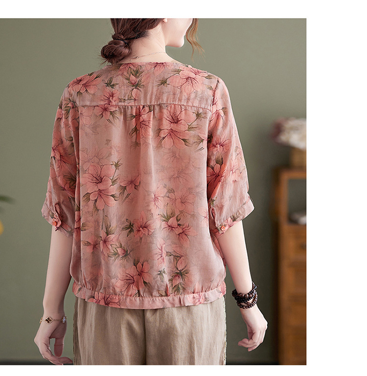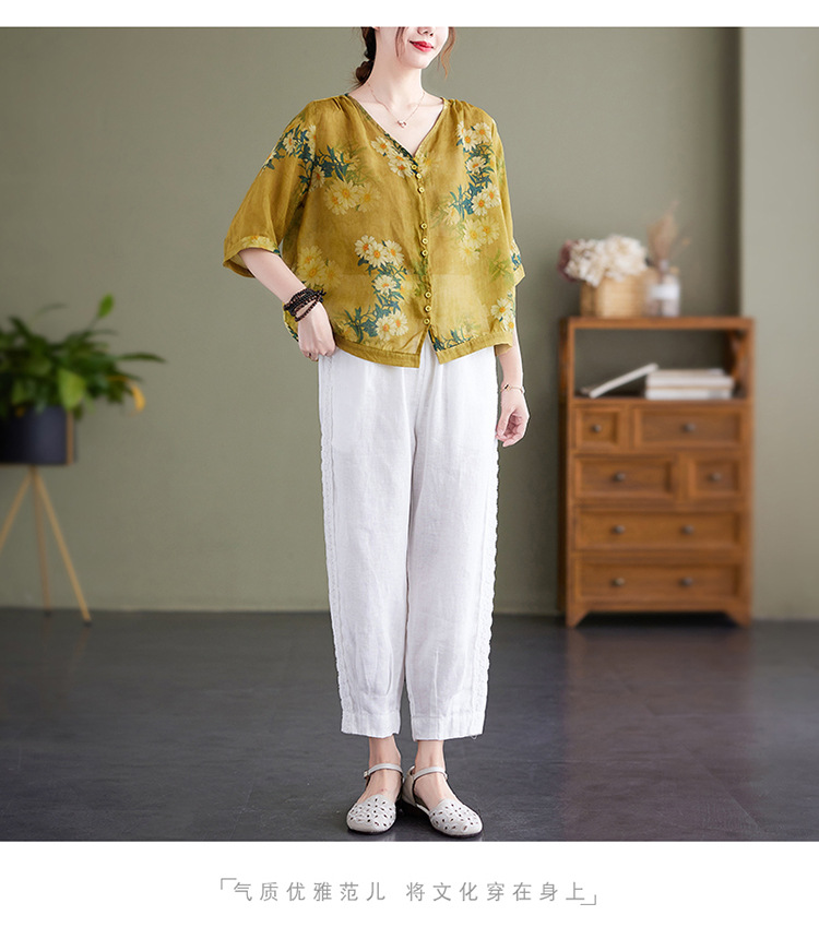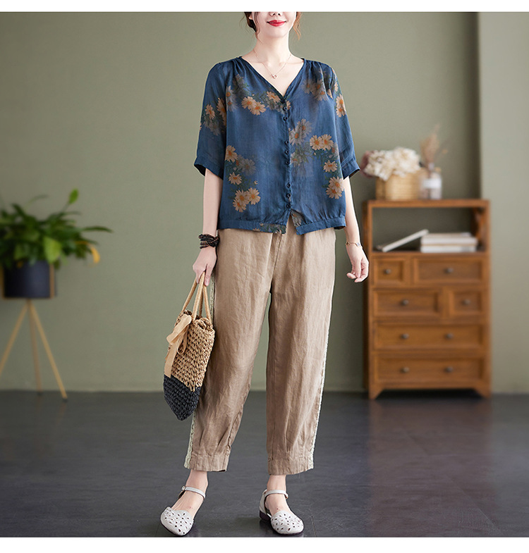 SMZ9167 复古文艺衬衫女2023夏装宽松大码显瘦V领印花中袖衬衣上衣小衫潮
