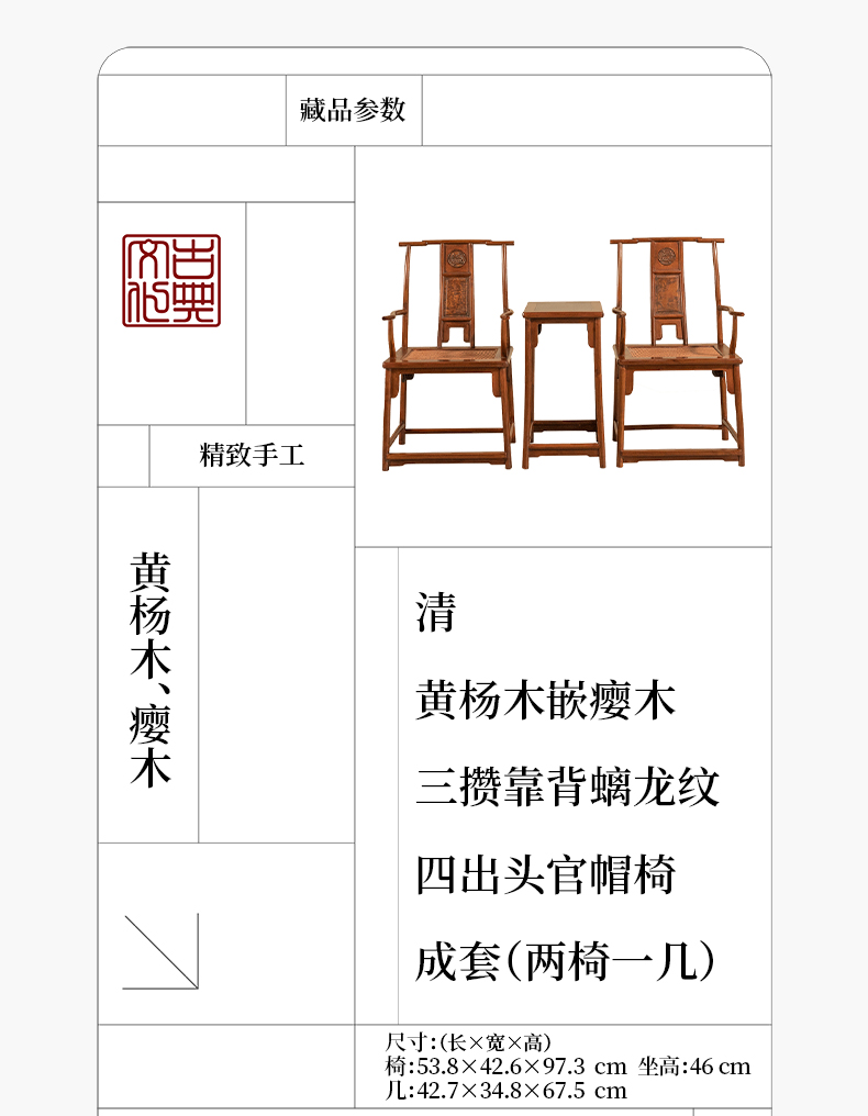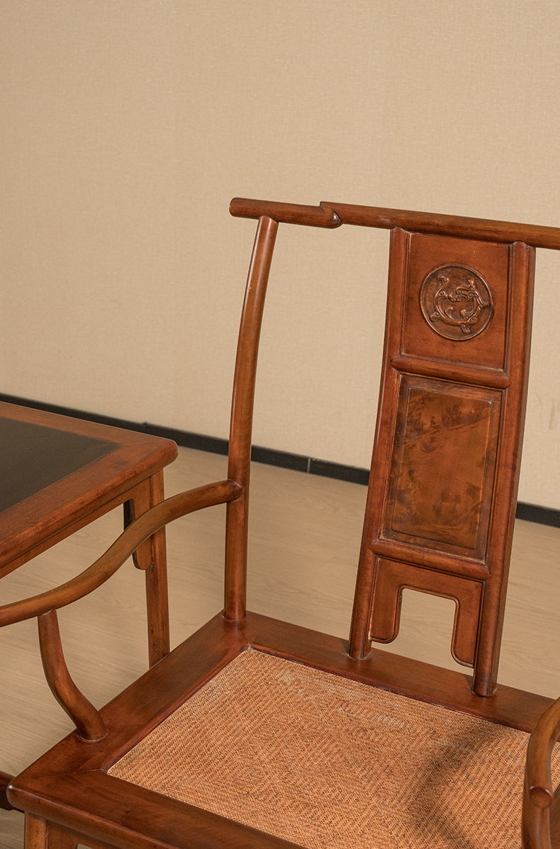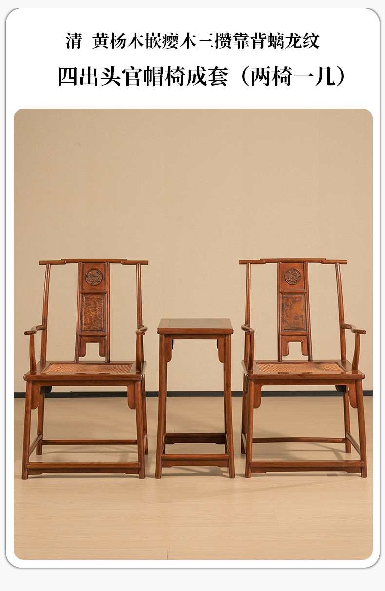 清 黄杨木嵌瘿木三攒靠背螭龙纹四出头官帽椅成套(两椅一几)
