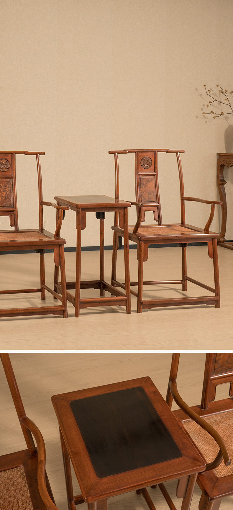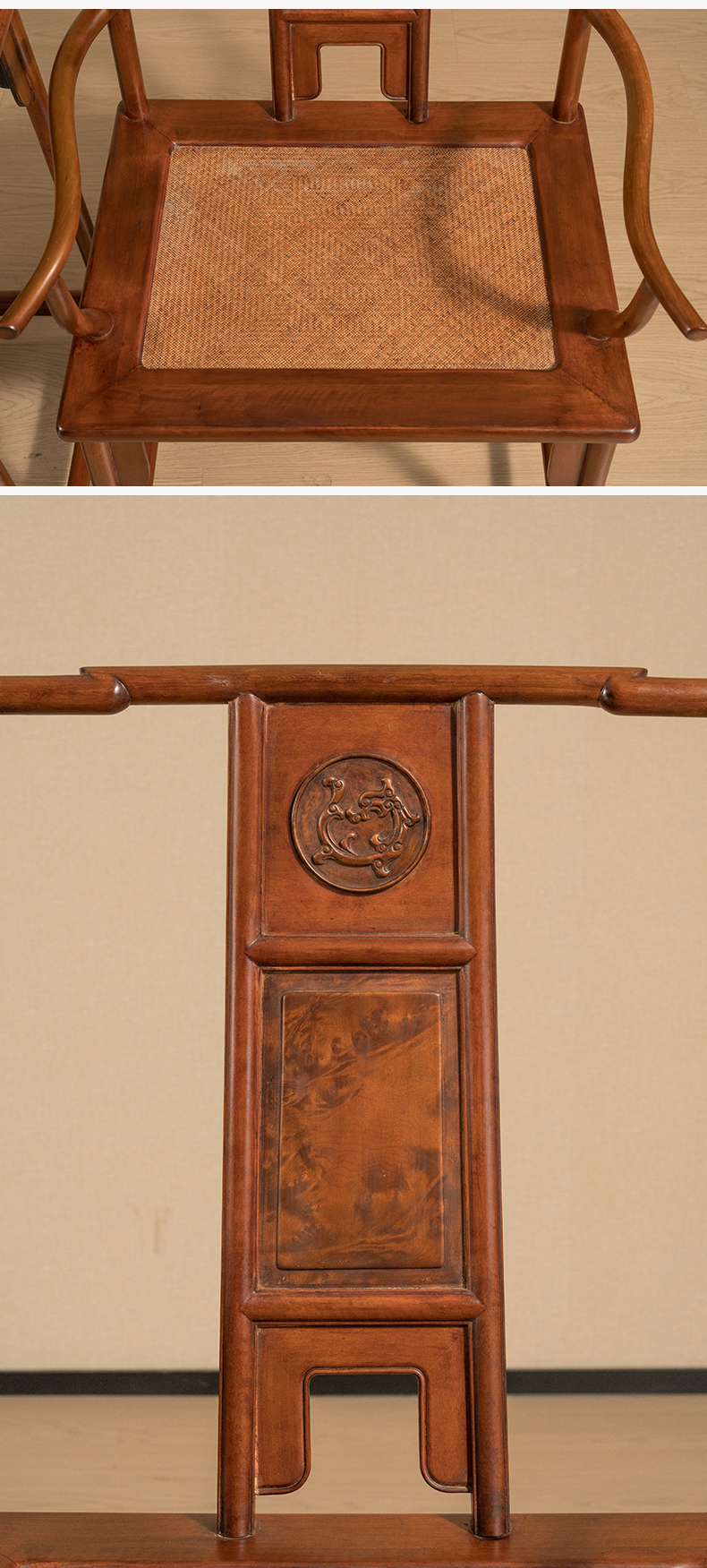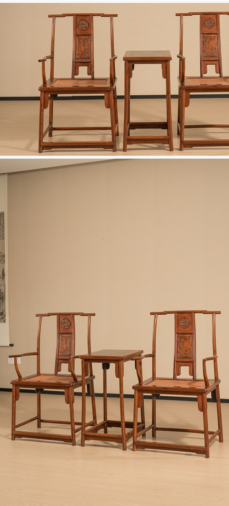 清 黄杨木嵌瘿木三攒靠背螭龙纹四出头官帽椅成套(两椅一几)