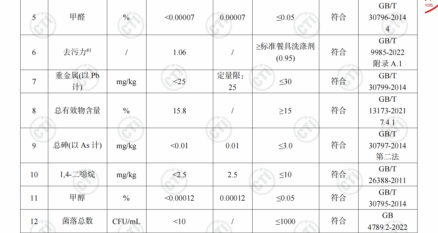 符合《食品安全国家标准洗涤剂》A类标准,可直接接触食品,甲醛、重金属、二恶烷等指标均符合