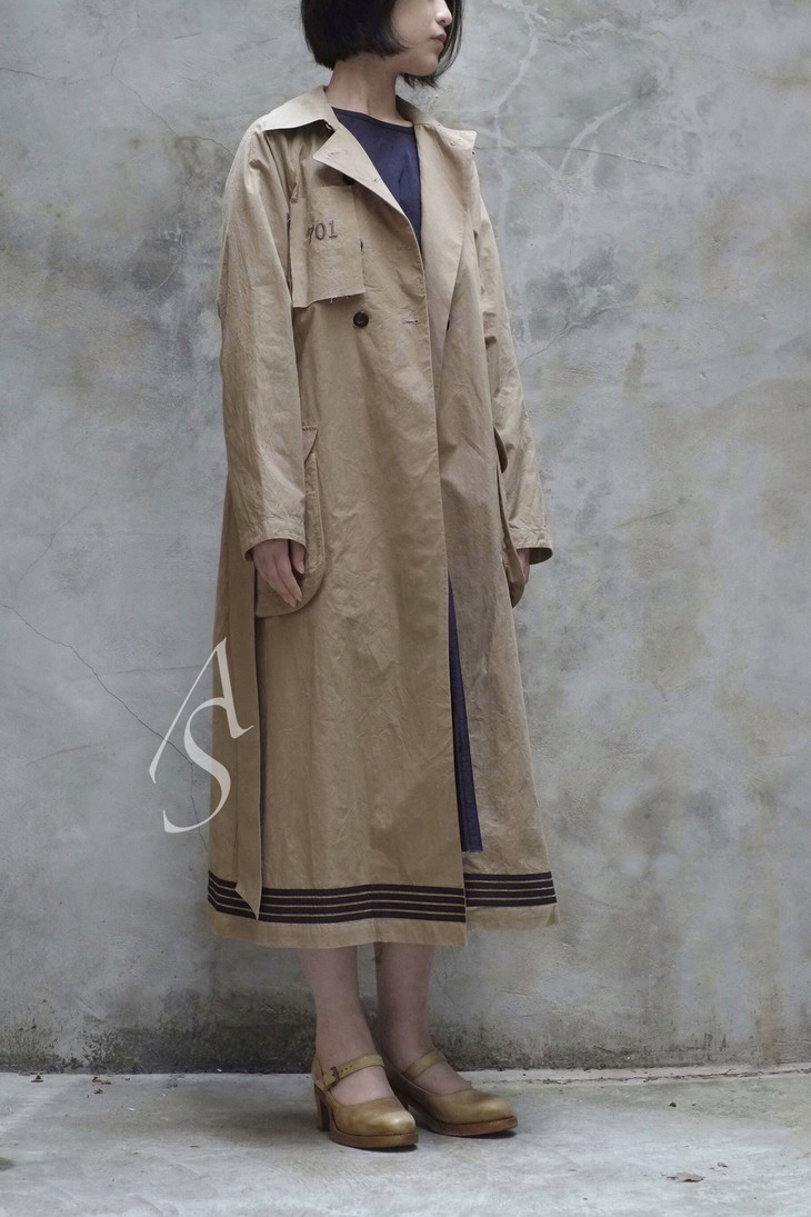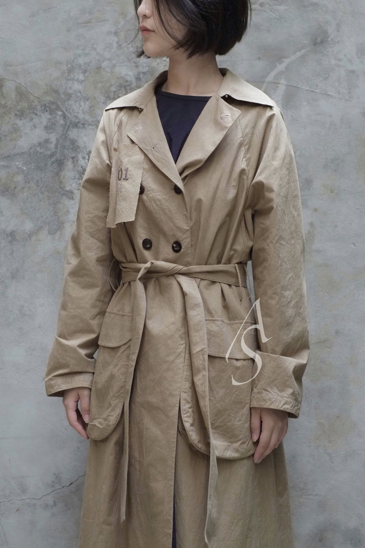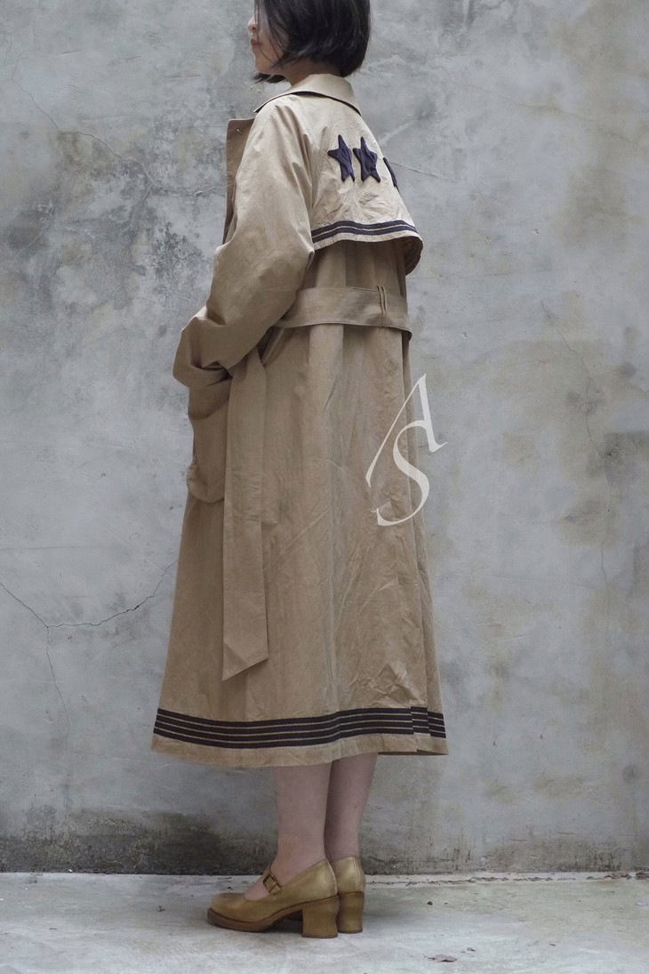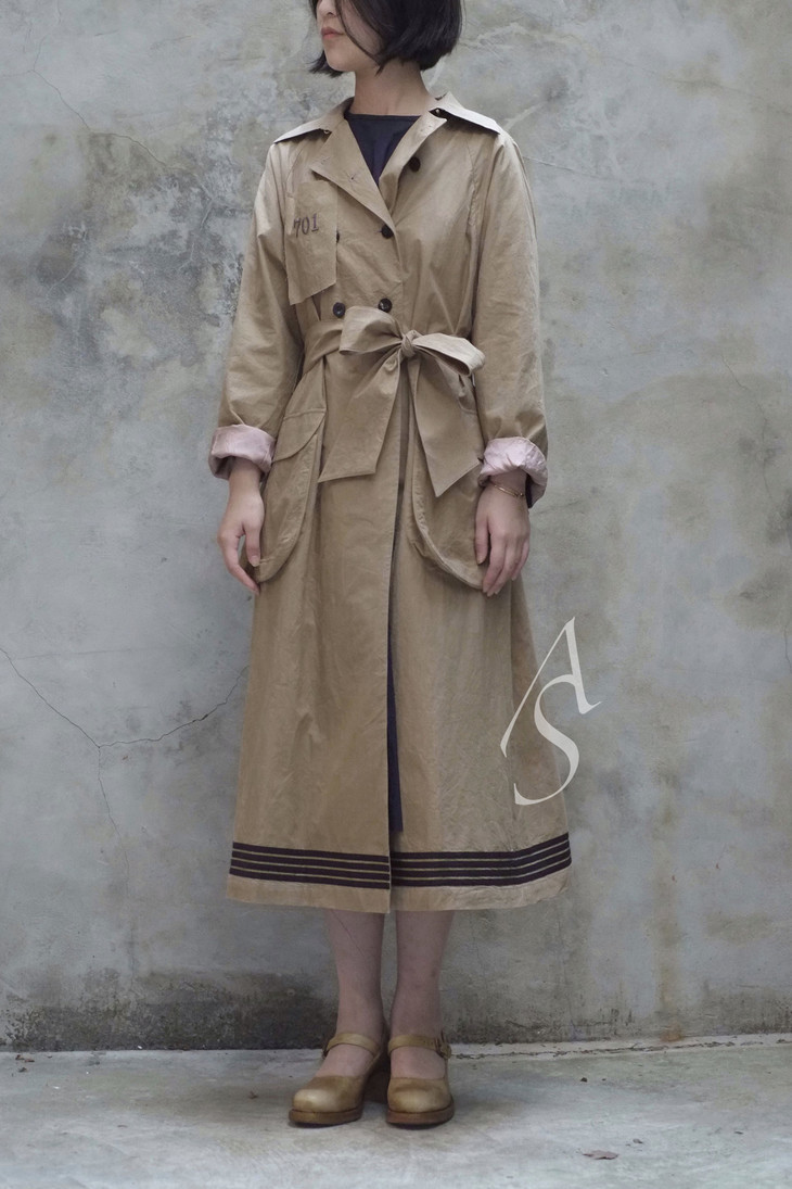 电影《光荣之路》中上校所穿的斗篷风衣是19世纪初的经典款式「Inverness」,具有外部斗篷长至手腕的特点,具备防风与保暖的功能。Liangxue的军装风衣将斗篷最简化仅留作装饰作用,绣有五角星的贴片形成立体效果。「701」的胸章裁片也源于电影。此外双排扣和宽腰带等经典风衣元素的使用,搭配以浅卡其色,呈现一种轻松与幽默的复古感。