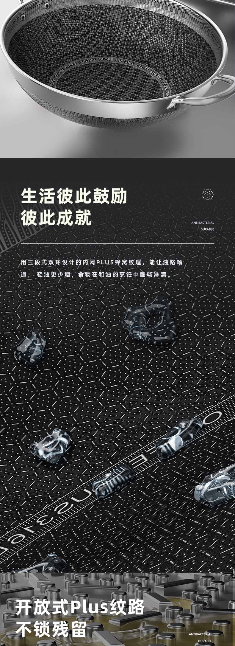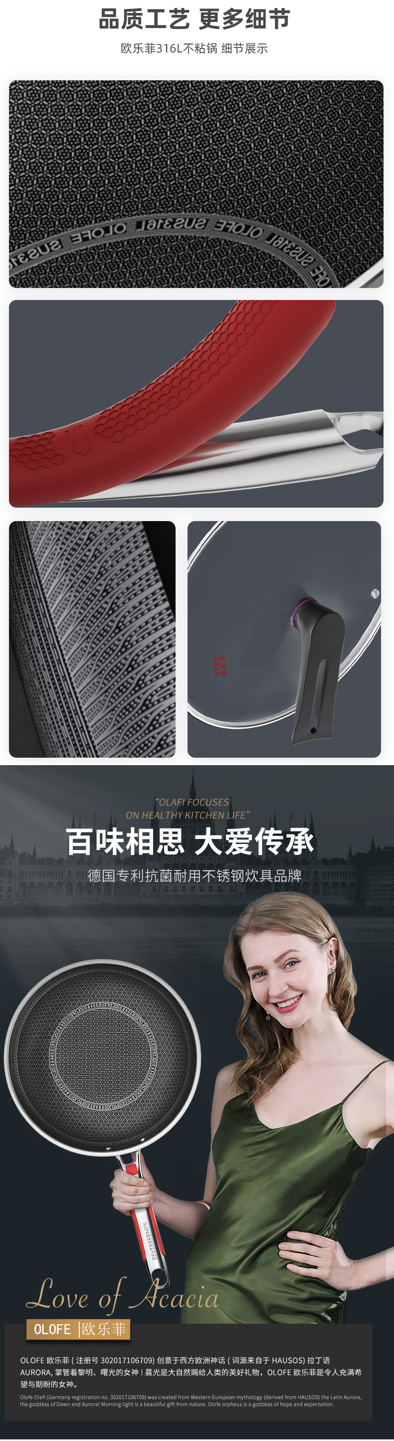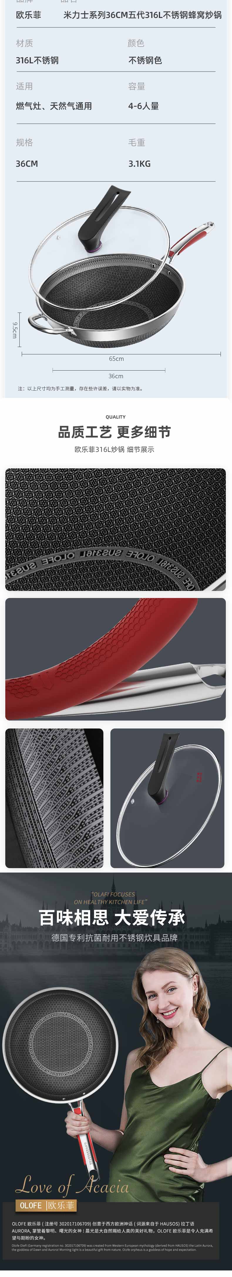 【官方正品保证】 欧乐菲第五代不粘锅不锈钢炒锅少油烟双面花纹蜂窝炒菜蜂巢锅具电磁炉天然气明火通用36cm OLOFC36B1