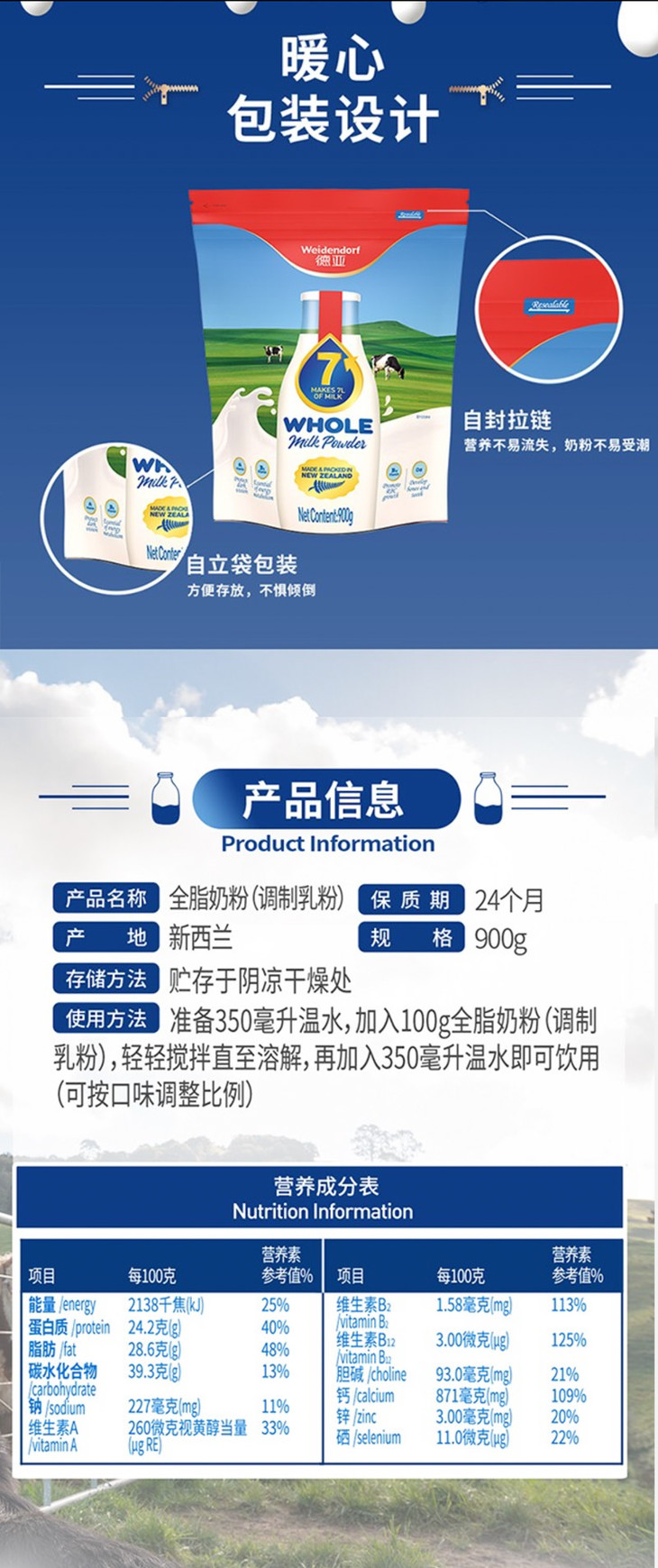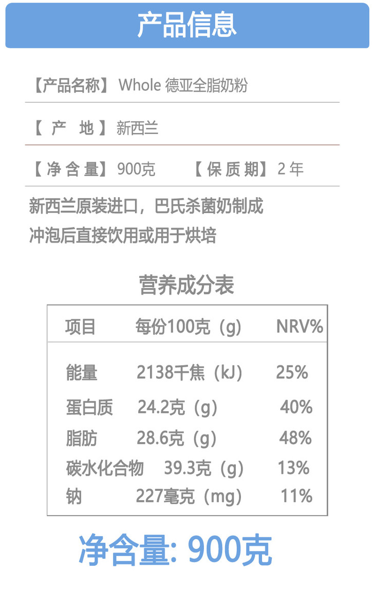 【9.3直播】900g*2德亚全脂奶粉(调制乳粉)