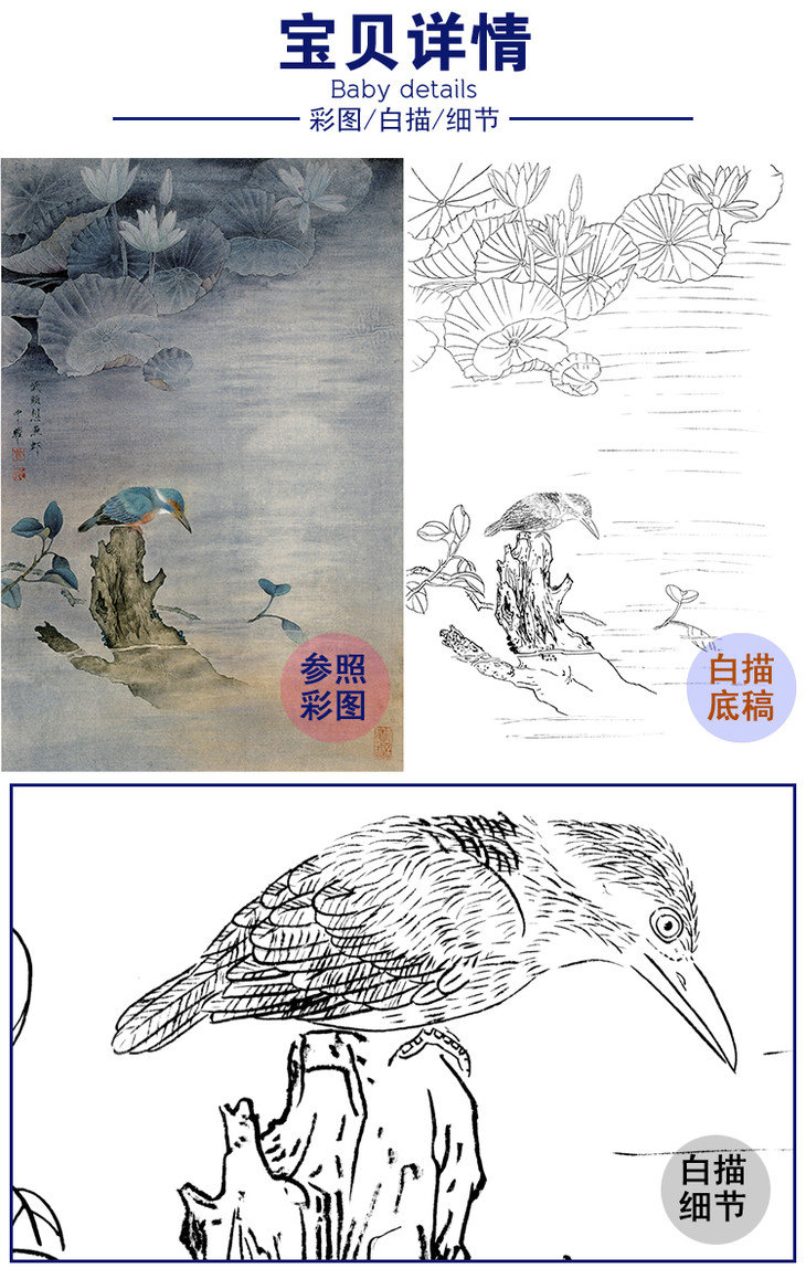 竖幅工笔花鸟白描底稿-周中耀《低头想鱼虾》-多种白描尺寸可选-ZT02