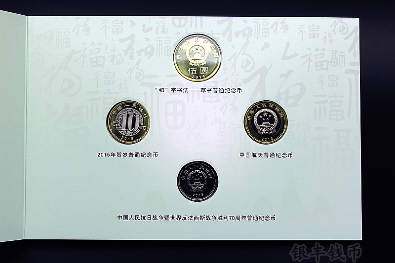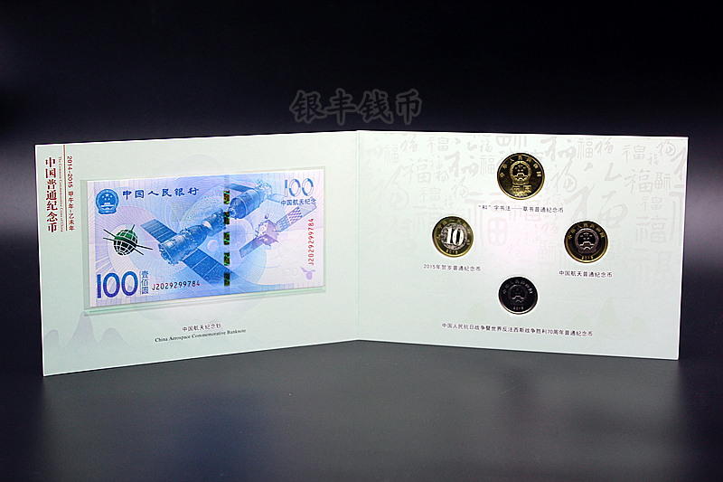 | 产品组成 | 和字书法-草书普通纪念币(面值5元)、2015年贺岁普通纪念币(面值10元)、中国人民抗日战争暨世界反法西斯战争胜利70周年普通纪念币(面值1元)、中国航天普通纪念币(面值10元)、中国航天纪念钞(面值100元) |