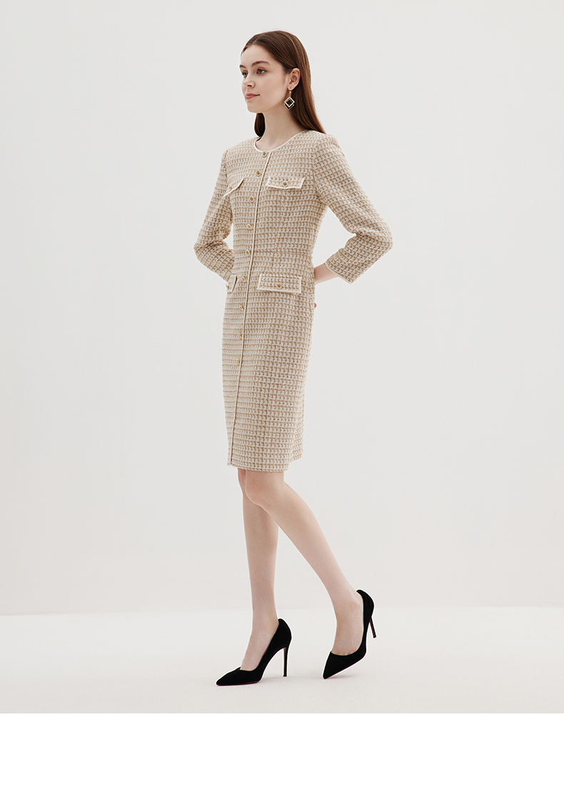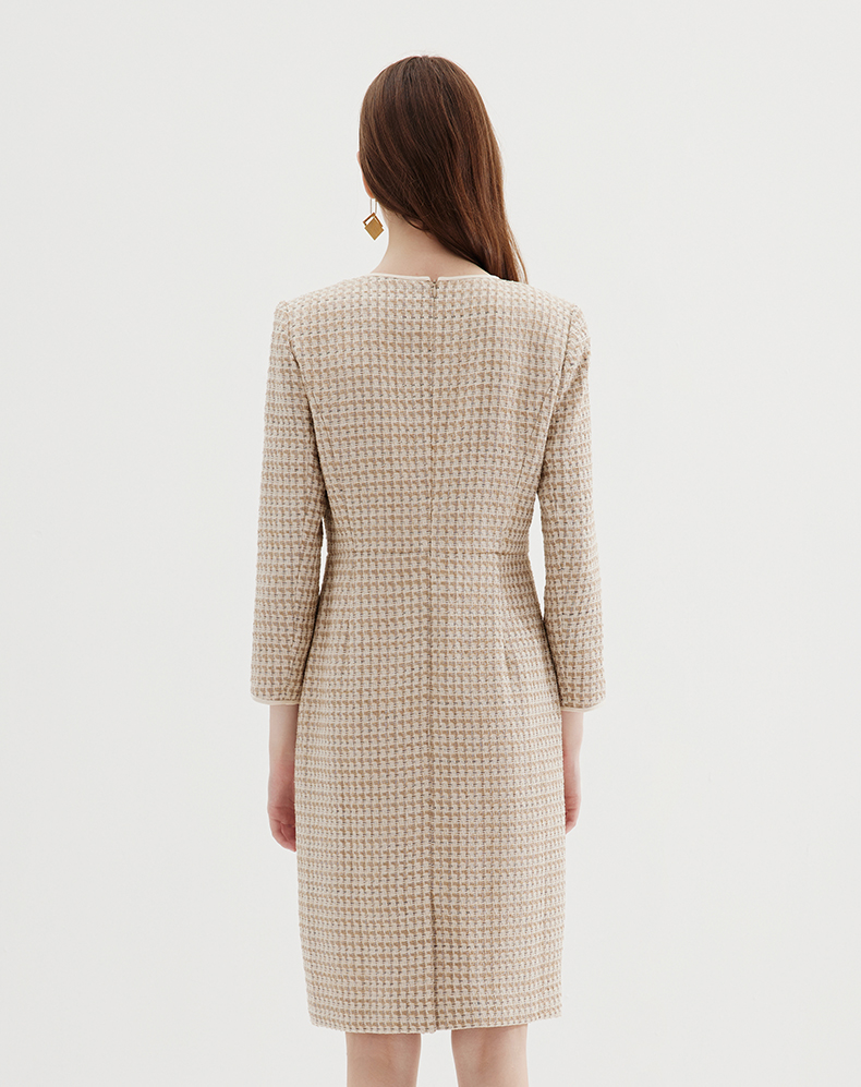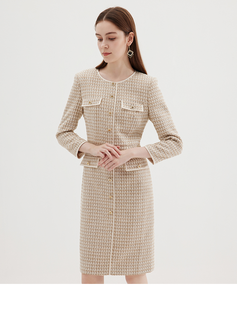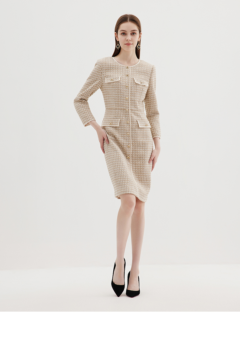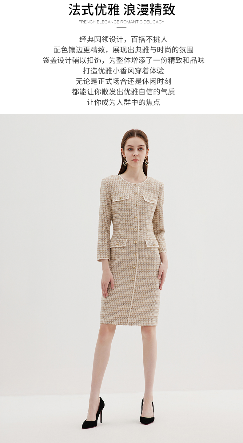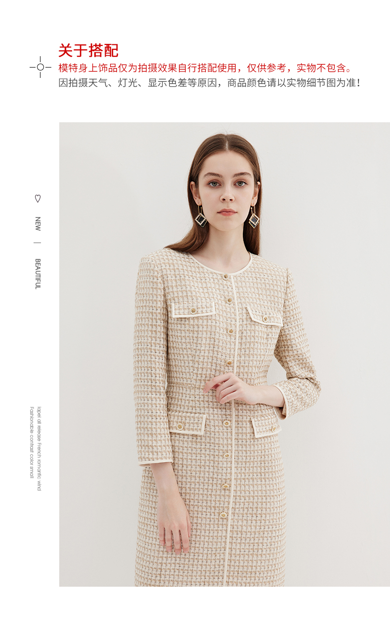 EITIE爱特爱冬季新款粗花呢气质圆领修身高腰显瘦时尚格子连衣裙7207933