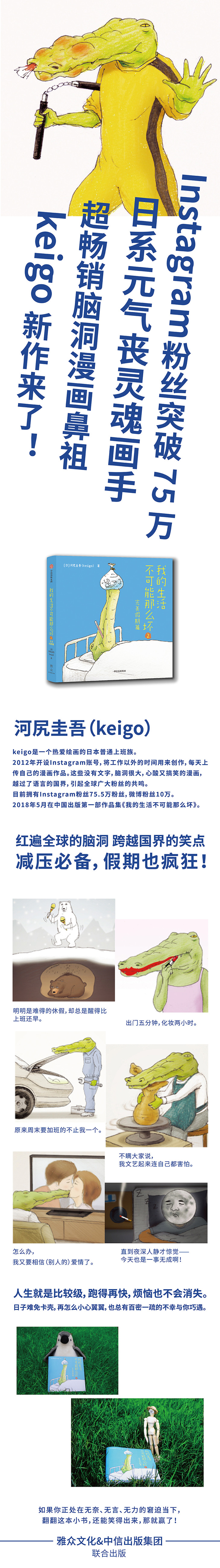 Keigo是以Ins为创作分享平台的插画创作者,平时是一个普通上班族。2012年开设了Ins账号,将工作以外的时间用来创作。这些没有文字,脑洞很大,心酸又搞笑的插画,越过了语言的国界,引起了全球广大粉丝的共鸣。目前拥有Ins粉丝70万。2018年5月在日本和中国出版首部漫画集《我的生活不可能那么坏》