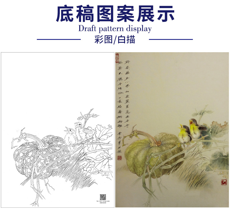 【大彩图】龚雪青工笔画白描底稿南瓜小鸟临摹勾线花鸟线稿XQ55