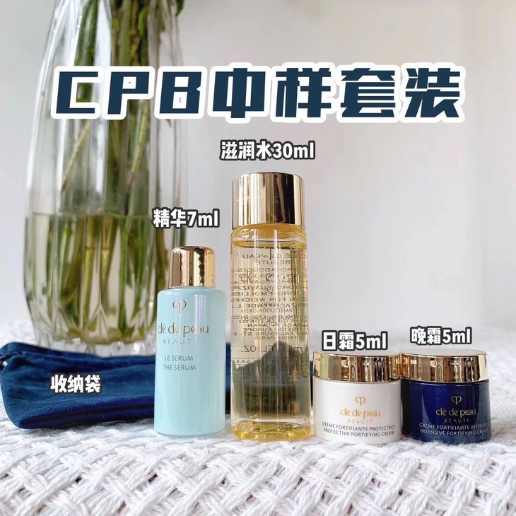 CDP 4件中样套装 👍超值旅行中样四件套。滋润水补水保湿舒缓💦,解决细胞因压力而造成肌肤凹凸不平、粗糙、小粉刺、毛孔粗大等等问题✔。让肌肤恢复水嫩、滋润、光滑、有弹性〽。精华有深入渗透唤醒赋能,促进后续吸收,焕现光透感初生肌。日霜含SPF25/PA+++的防晒指数☀,提升肌肤自我修复,抵御光老化、对抗松弛,锁水紧致。🌙夜霜夜间修护肌肤,使肌肤恢复柔软细腻。套装包括:滋润水30ml➕精华7ml➕日霜5ml➕夜霜5ml➕化妆包一个。