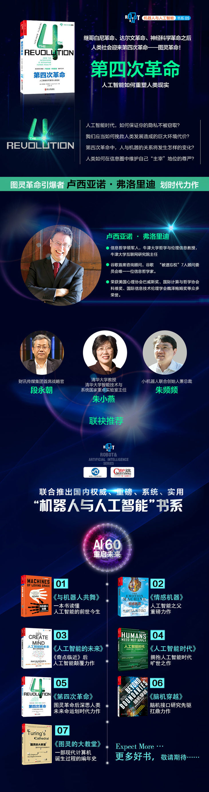 l 湛庐文化联合权威机构中国人工智能学会特设专家委员会!该专家委员会包括中国工程院院士李德毅、驭势科技(北京)有限公司创始人兼CEO驭势科技(北京)有限公司创始人兼CEO驭势科技(北京)有限公司创始人兼CEO驭势科技(北京)有限公司联合创始人兼CEO吴甘沙、地平线机器人技术创始人余凯、IBM中国研究院院长沈晓卫、国际人工智能大会(IJCAI)常务理事杨强、科大讯飞研究院院长胡郁、中国人工智能学会秘书长王卫宁、微软亚洲研究院常务副院长芮勇、达闼科技创始人兼CEO黄晓庆、清华大学智能技术与系统国家重点实验室主任朱小燕、《纽约时报》高级科技记者约翰·马尔科夫、斯坦福大学人工智能与伦理学教授杰瑞·卡普兰等国内外专家学者,他们将以自身深厚的专业实力、卓越的洞察力和深远的影响力,对这些优秀图书进行深度点评。