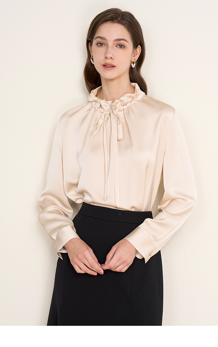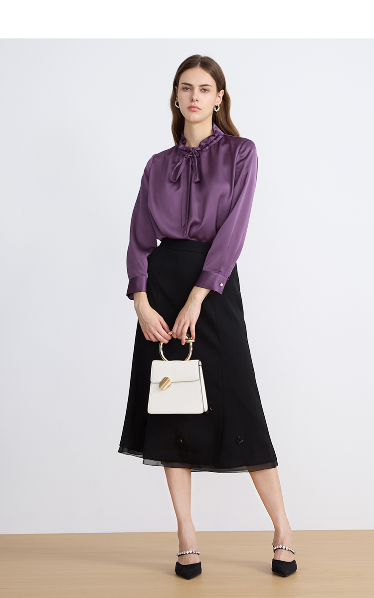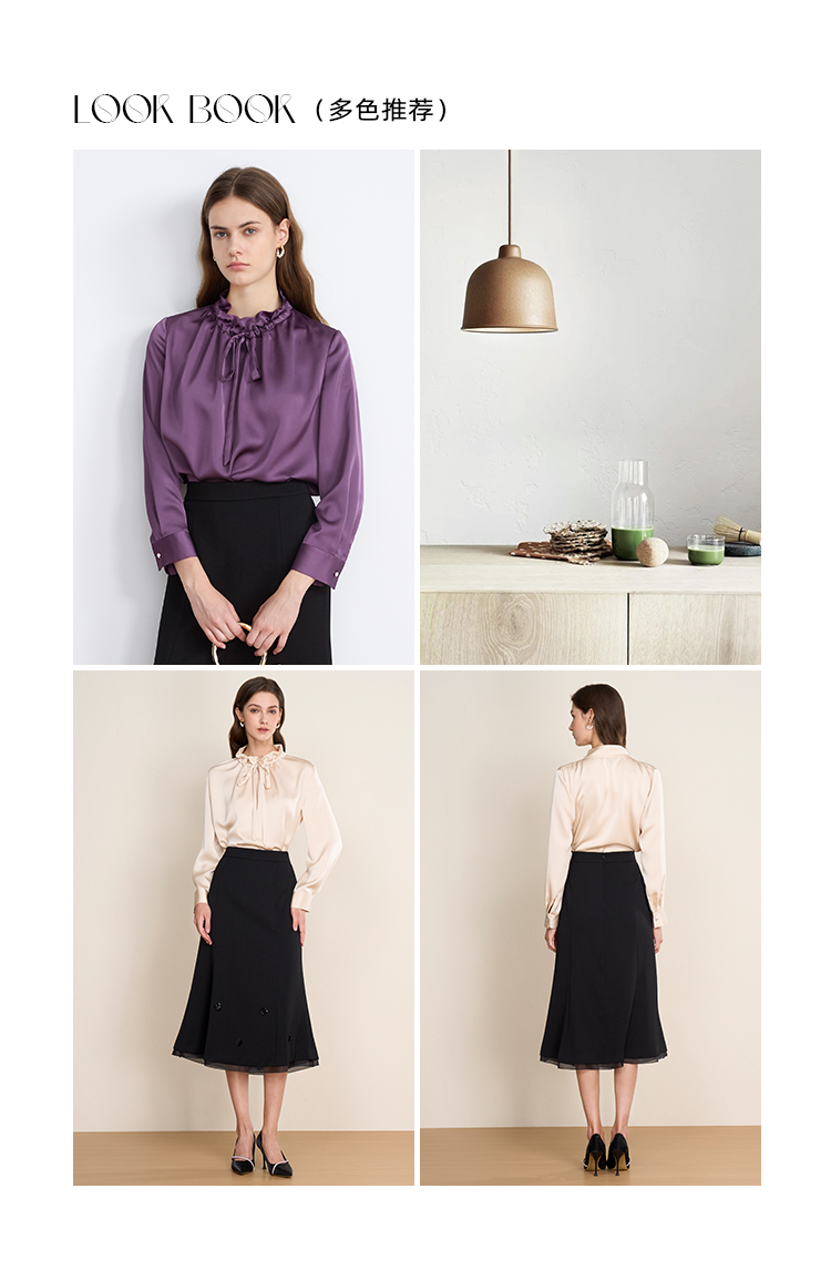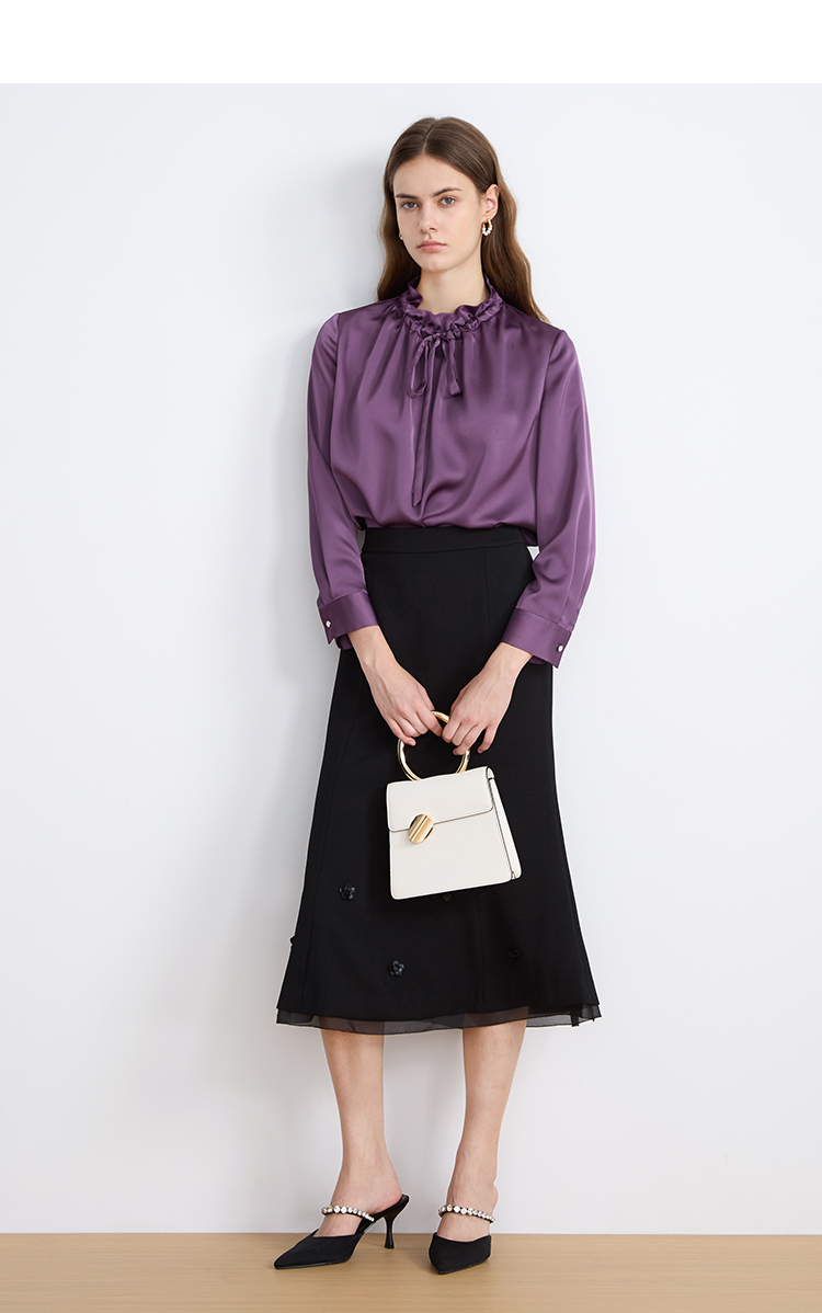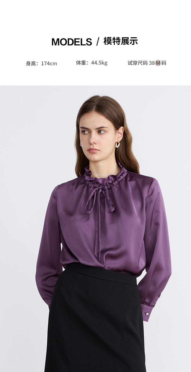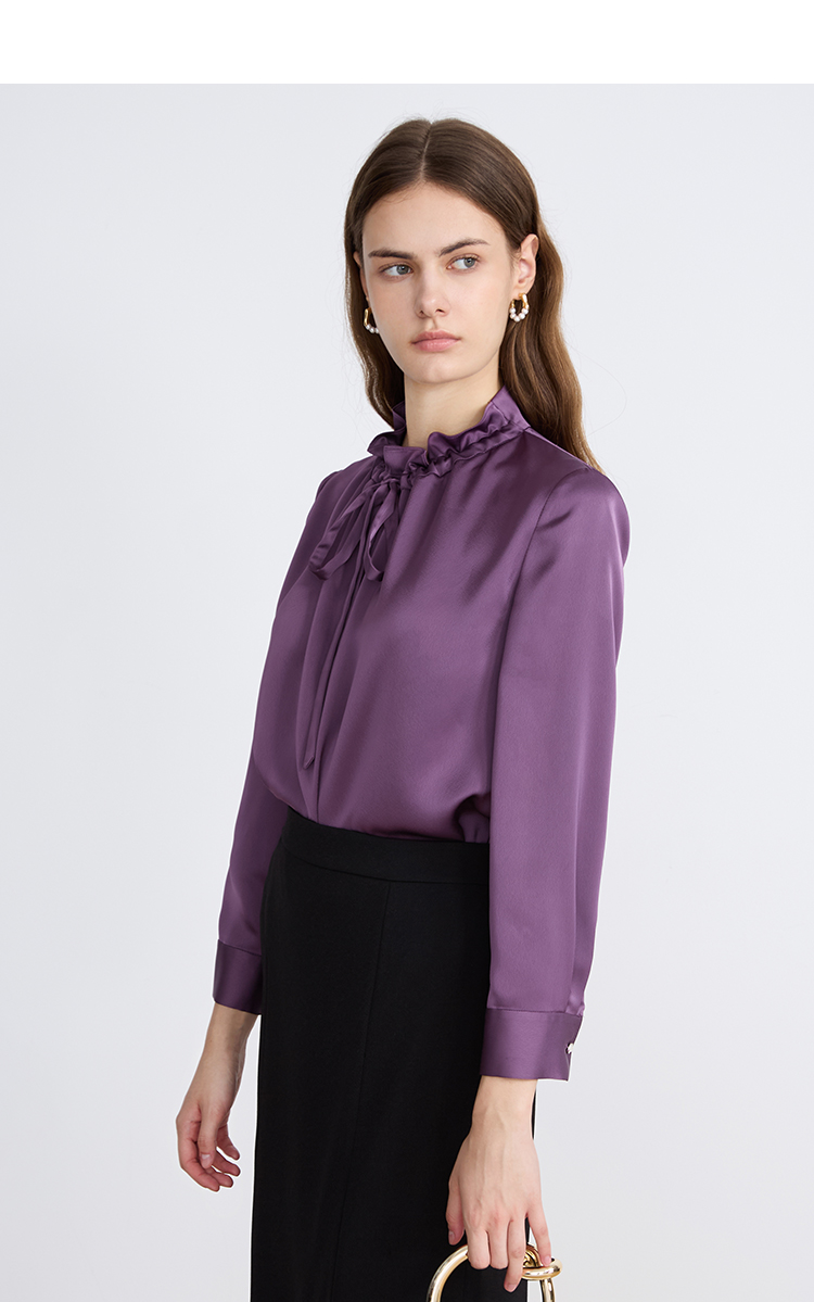 【紫色缎面衬衫】EITIE爱特爱气质抽绳木耳领直筒显瘦2025秋新款上衣C2513826