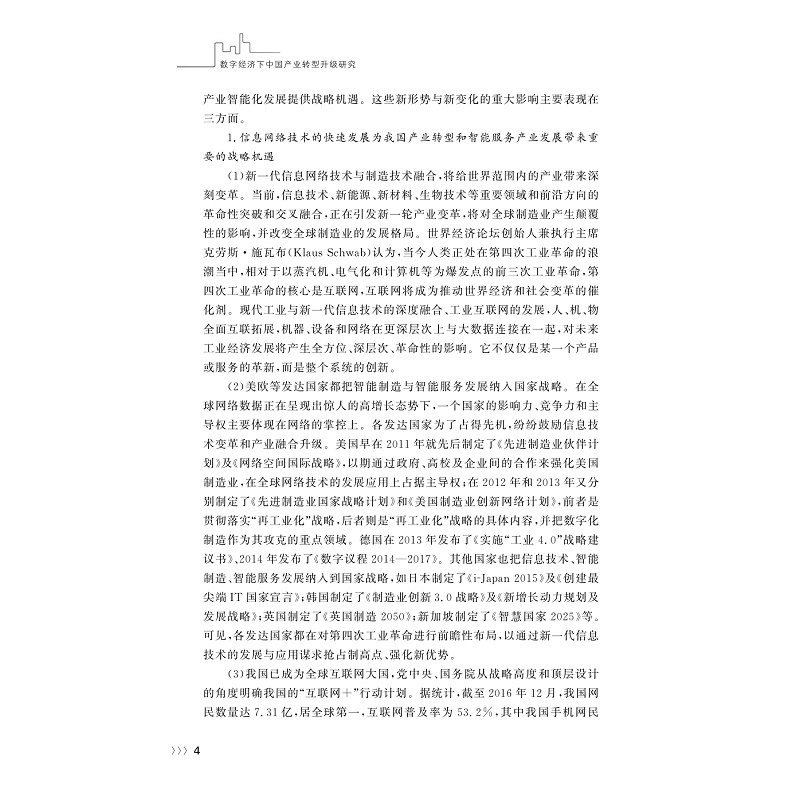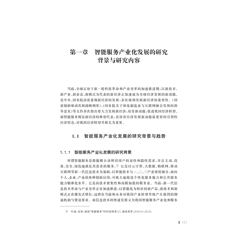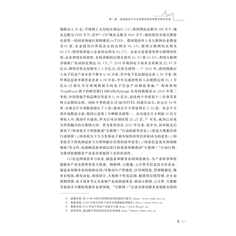人类社会已经历了农业化、工业化、信息化阶段,正在跨越智能化时代的门槛。物联网、移动互联网、云计算方兴未艾,面向个人、家庭、集团用户的各种创新应用层出不穷,代表各行业服务发展趋势的“智能服务”因此应运而生。智能服务与传统服务有所不同,生产厂商不仅要向服务型企业转型,而且还必须提供“智能服务”。智能服务业融现代技术——网络技术与人的智能于一身,是知识高度密集性的、高附加值的服务业。大力发展物联网产业、互联网+、智能服务产业必将给我国国民经济的高速发展带来新的机遇。 本专著以物联网产业协同发展与竞争力提升为研究对象,通过定性与定量分析相结合的方法,分析研究了我国物联网产业发展协同度、物联网发展的驱动因素、竞争力及其政府补贴的作用效应。以信息化、两化融合与产业转型升级为研究对象,通过定性与定量分析相结合的方法,研究了我国信息化与产业转型升级耦合发展、信息产业与制造业融合的绩效、汽车产业与电子信息产业耦合发展、纺织产业与电子信息产业融合发展、农业信息化就绪度及其区域差异。以智能服务产业化为研究对象,以智能服务理论体系构建、智能服务发展规律揭示、智能服务产业化发展模式分析、智能服务产业化路径选择、智能服务产业化支撑体系构架、智能服务发展政策为主要研究内容,采用跨学科的综合集成研究方法,运用多学科技术方法,对智能服务产业化路径进行了创新性探索。