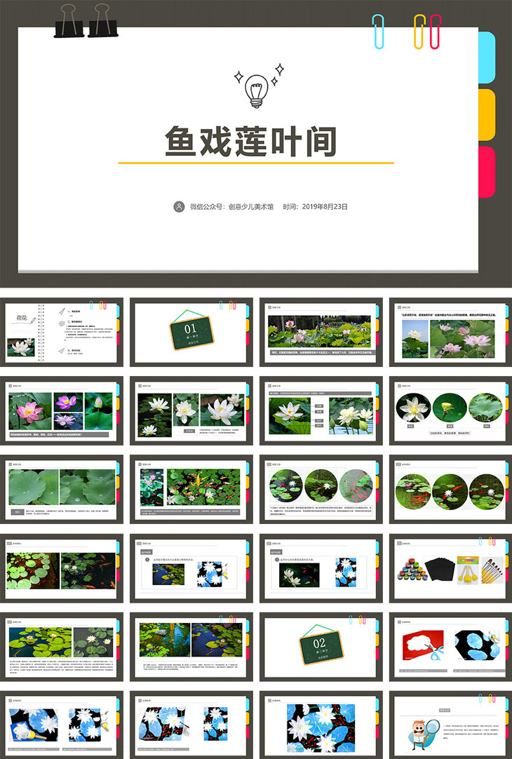 参考荷花、荷叶的相关素材,仔细观察它的外形特征,感受画面的意境美,运用拓印镂空的方法表现出荷花、荷叶、锦鲤的造型,注意画面物体的大小变化,让画面的层次感更加强烈。