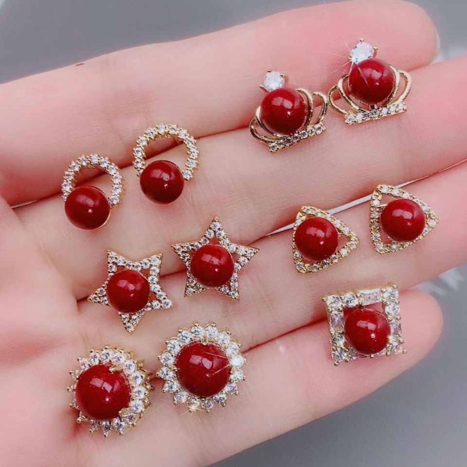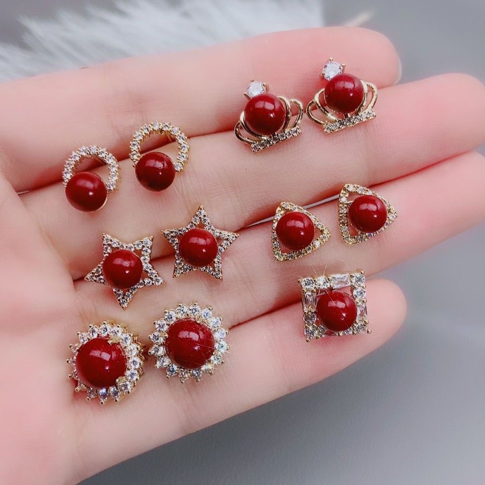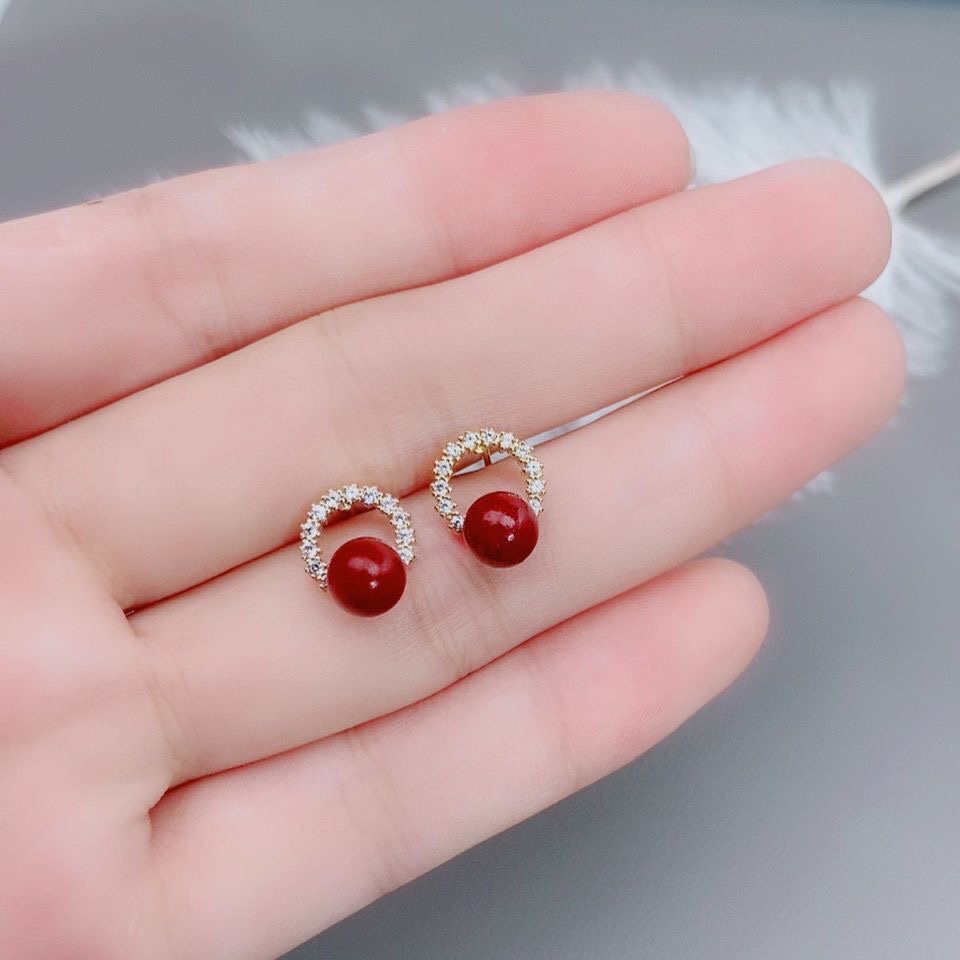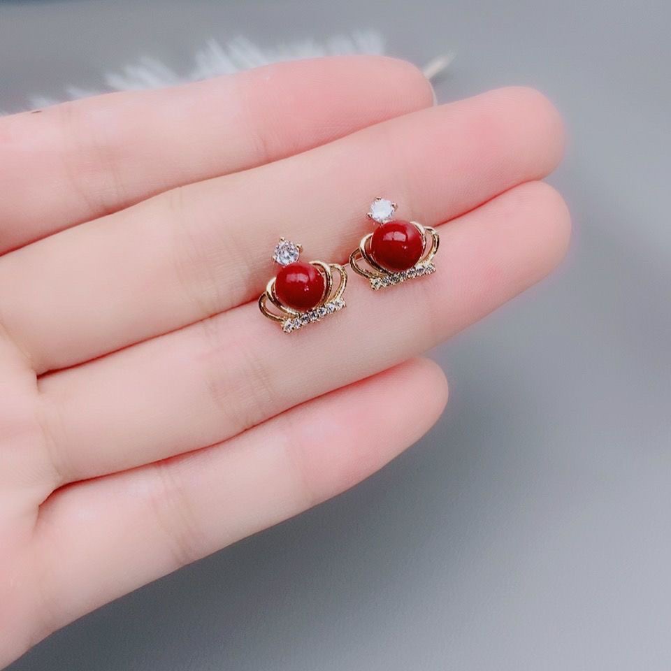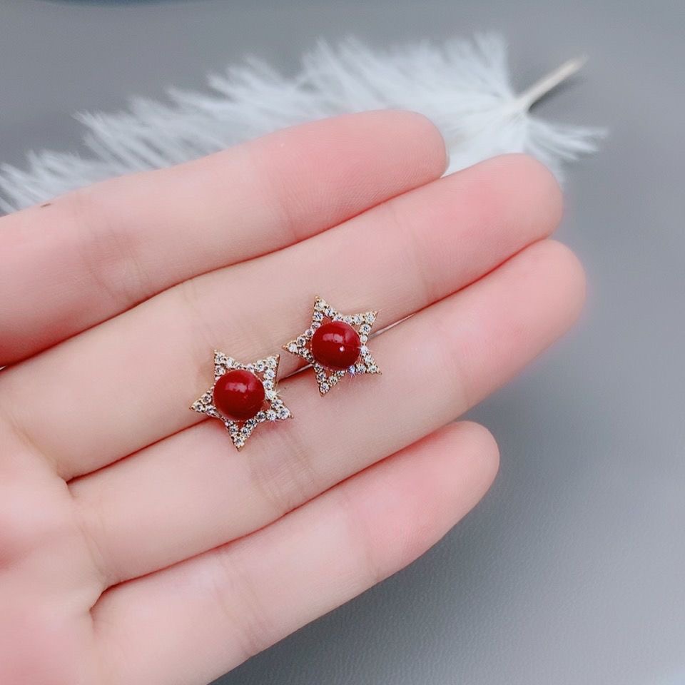 丁摩 天然原矿朱砂耳钉s925银招财转运本命年百搭喜庆耳饰女4ZF-123001