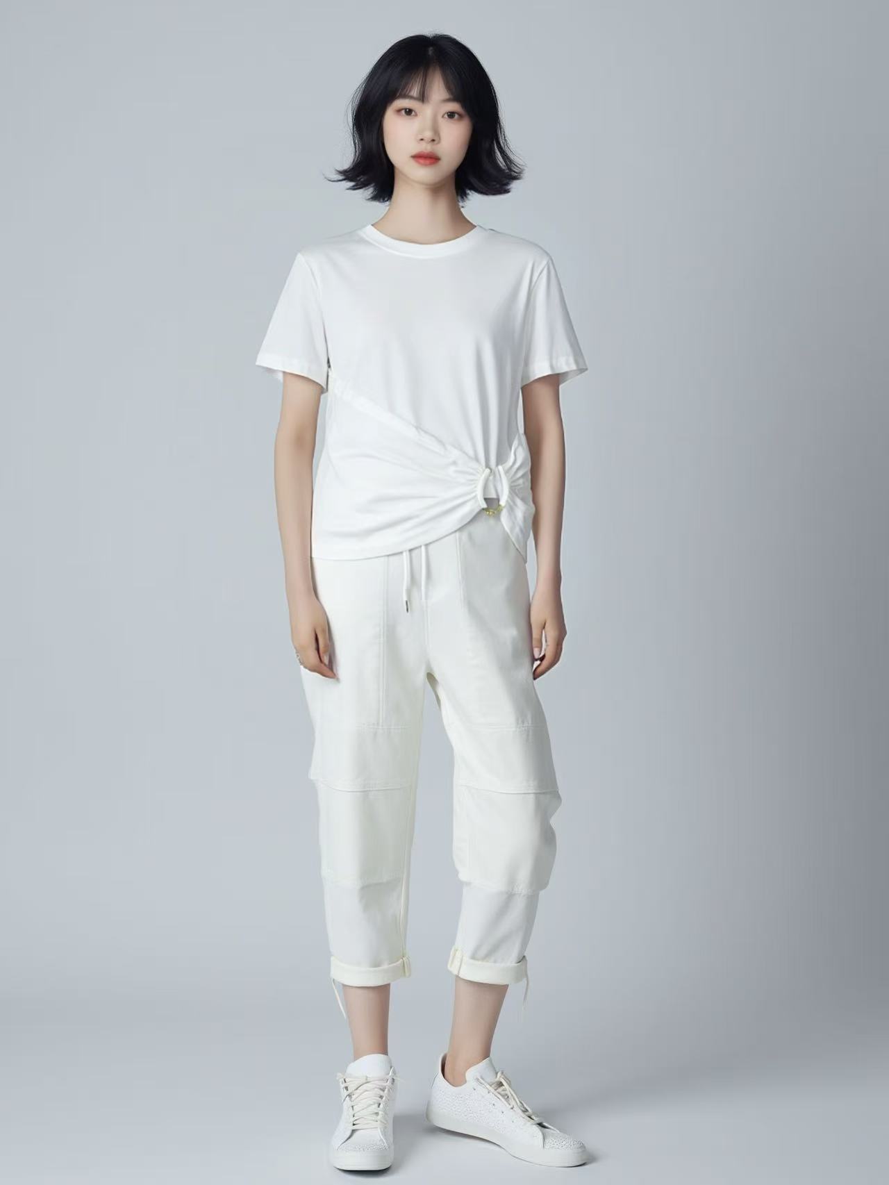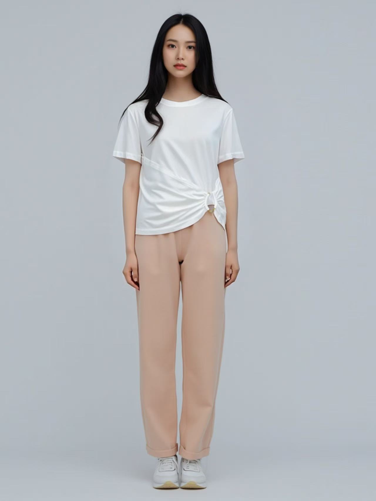 清仓价2025~9926金色装饰扣压褶短款短袖T恤-喜出