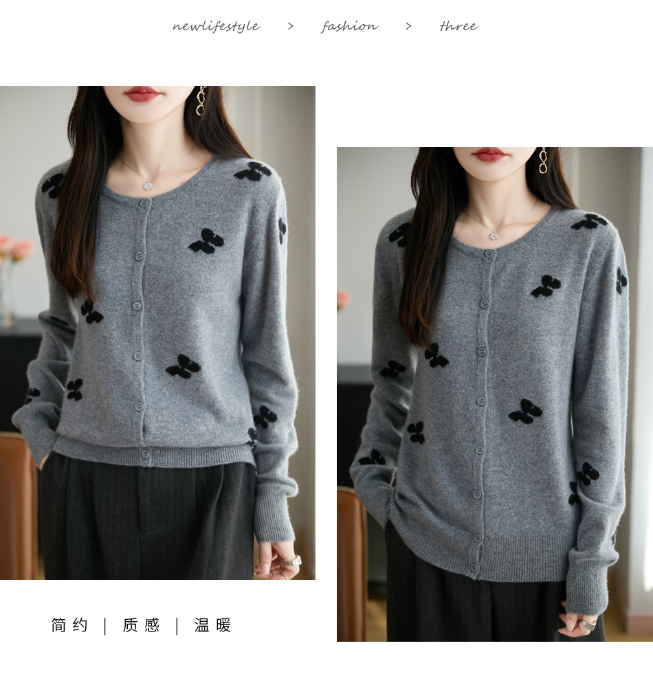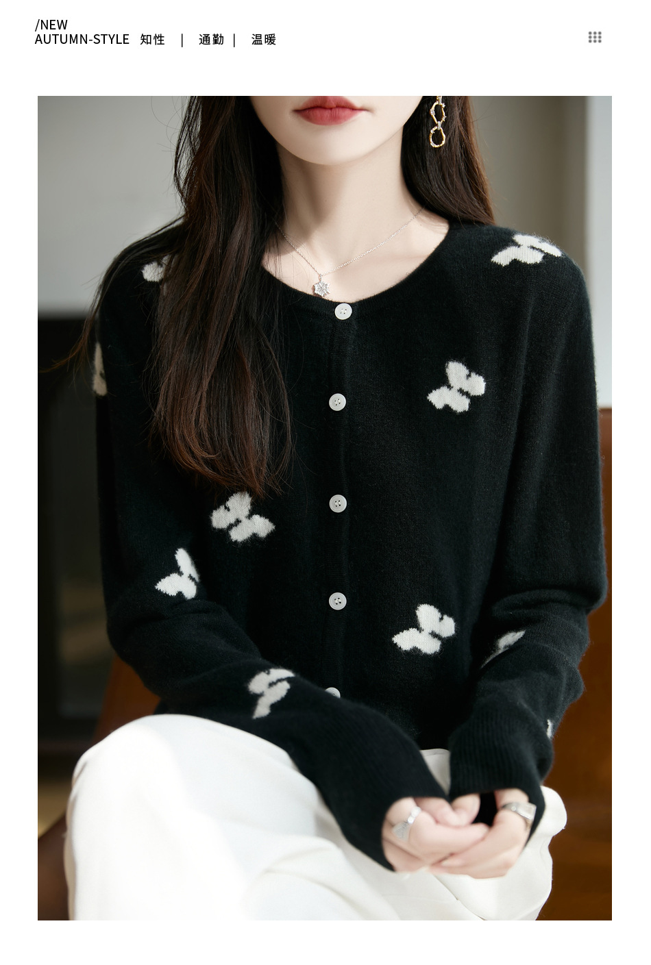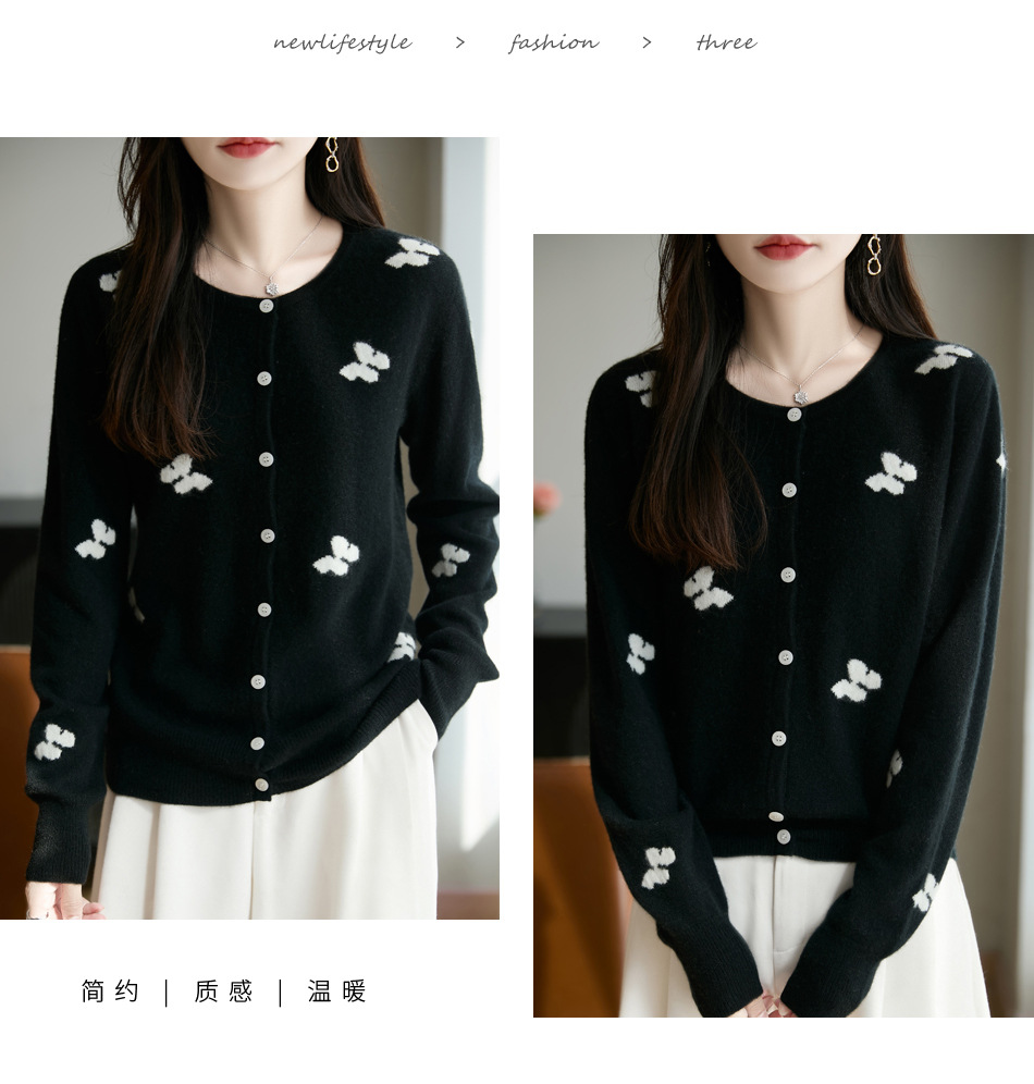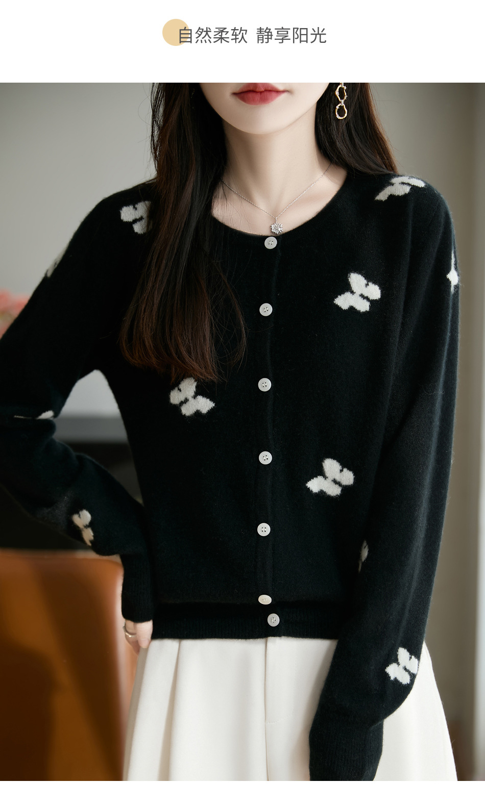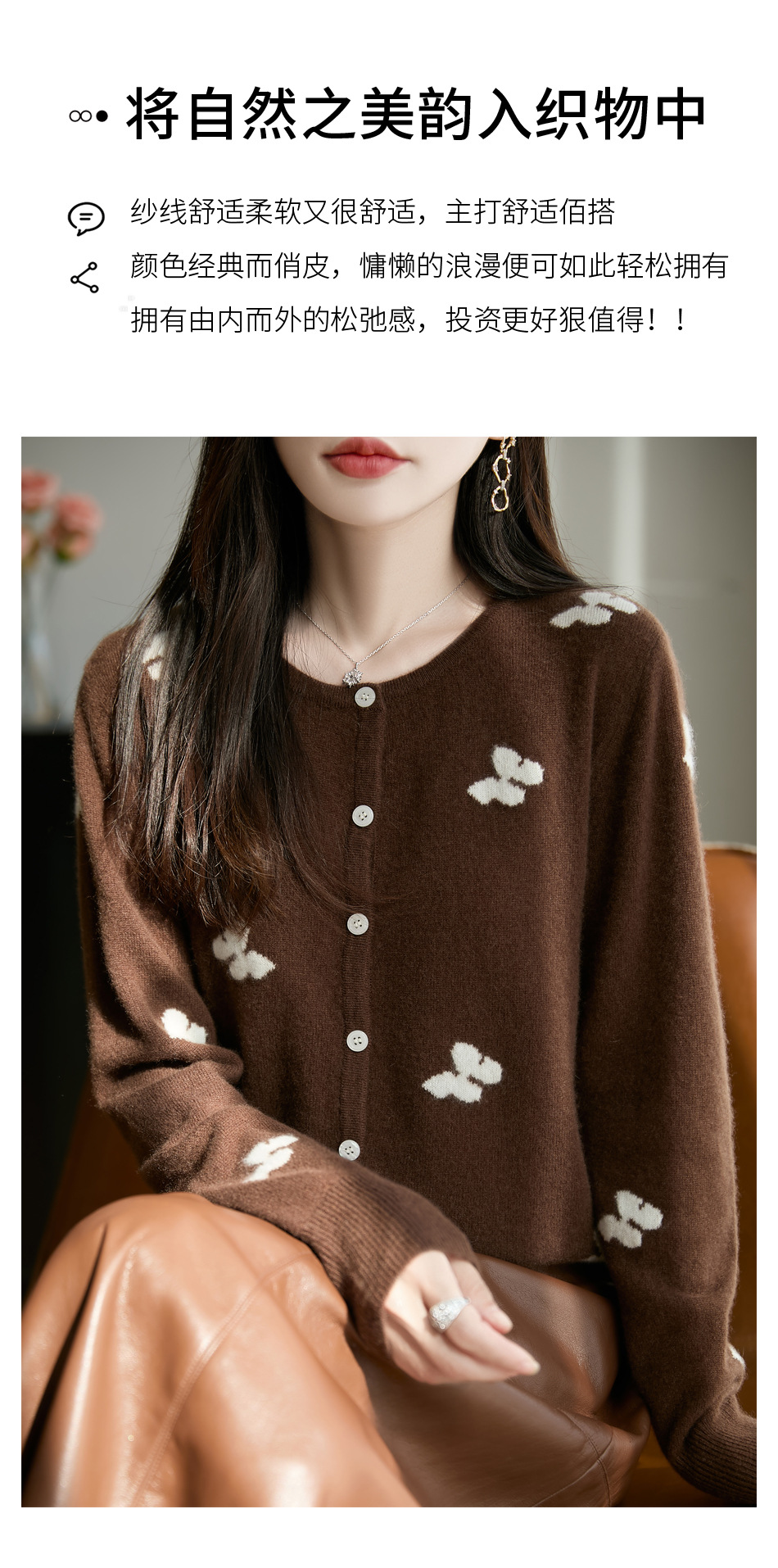 丁摩 气质蝴蝶提花100%纯羊毛开衫女圆领软糯毛衣外套QS-263-90