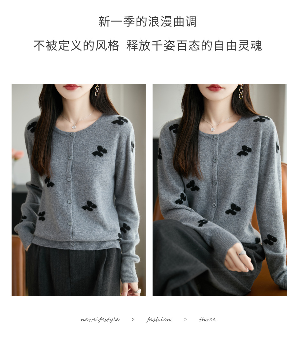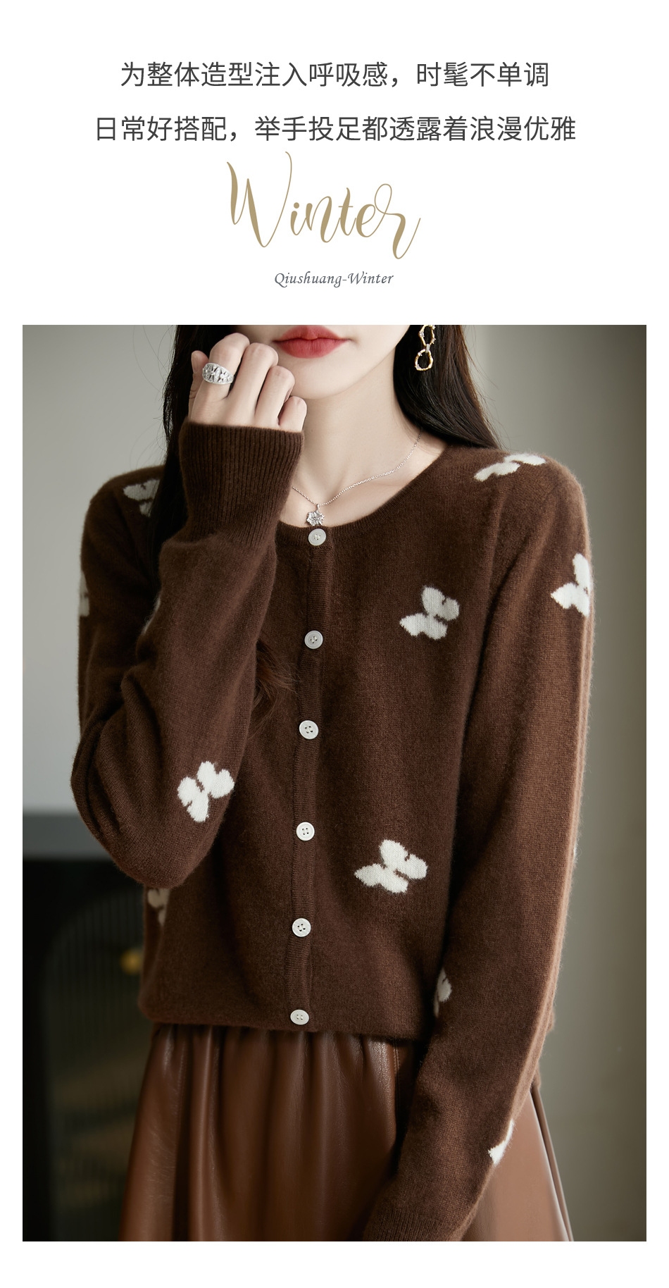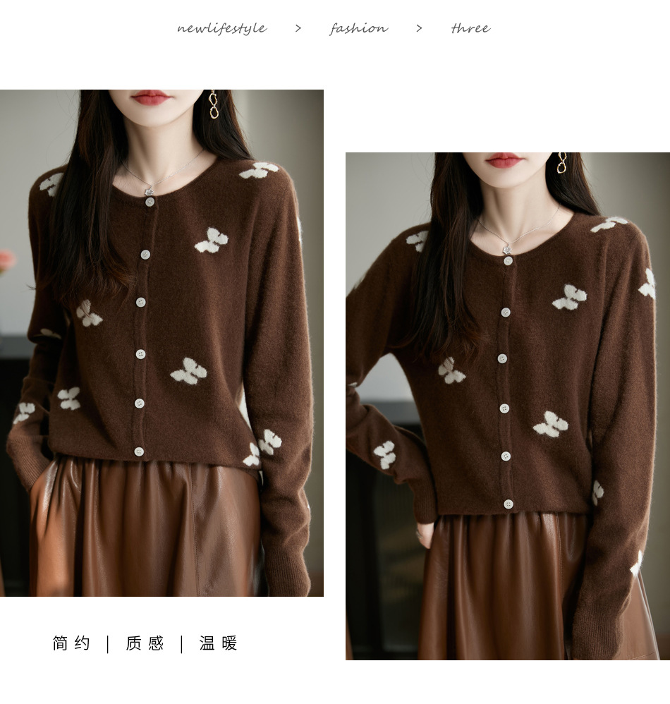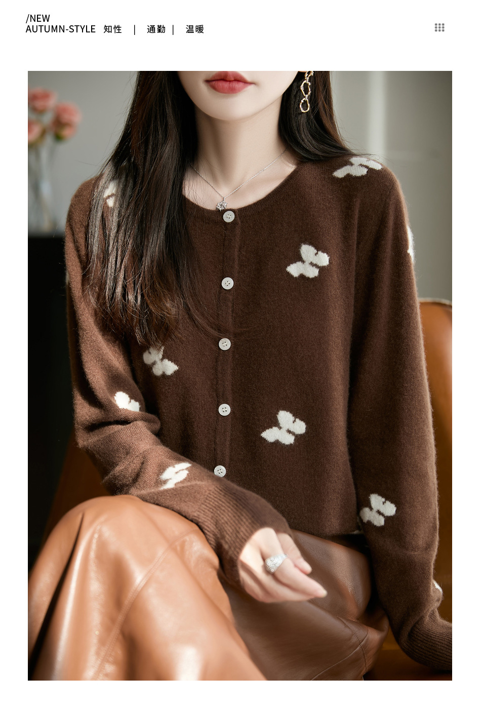 丁摩 气质蝴蝶提花100%纯羊毛开衫女圆领软糯毛衣外套QS-263-90