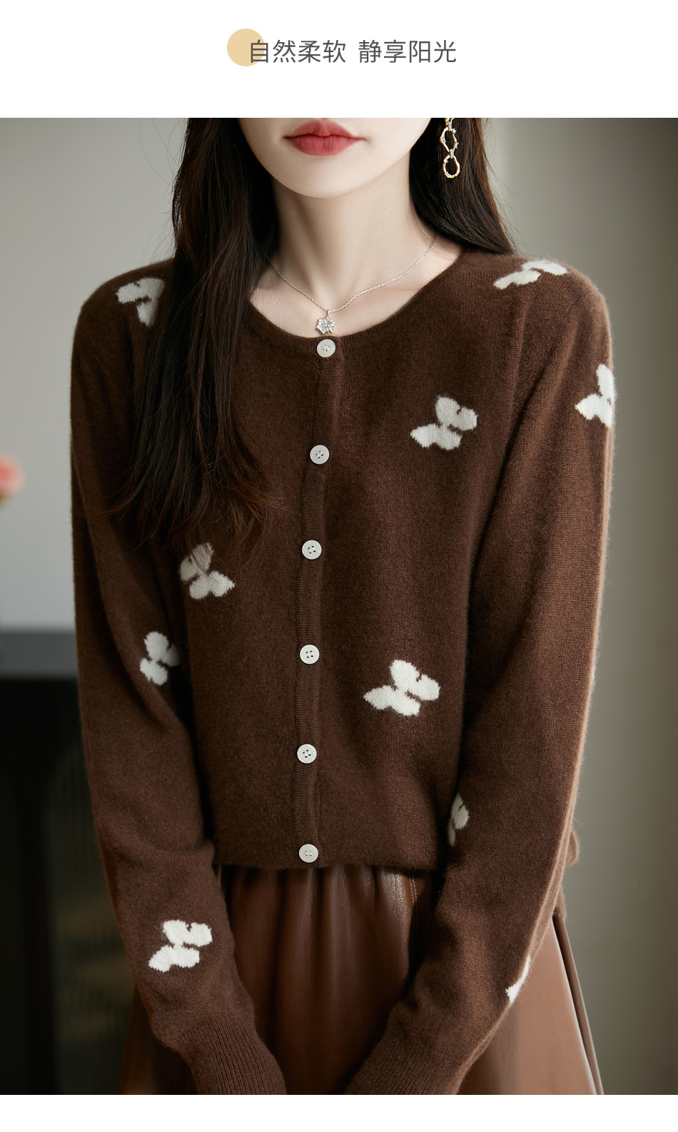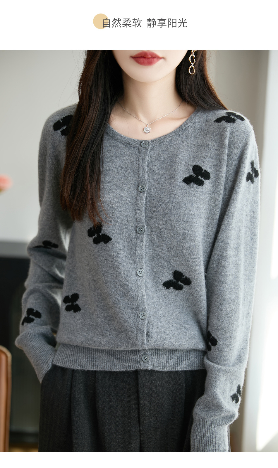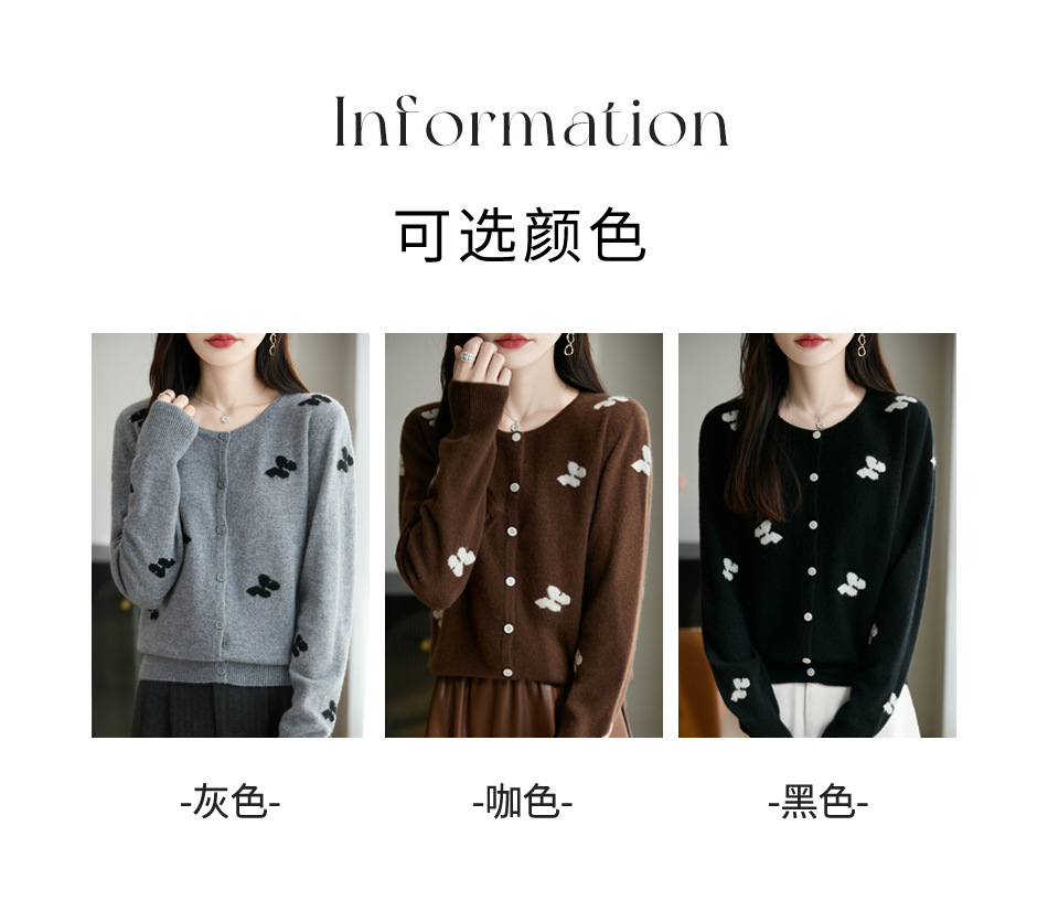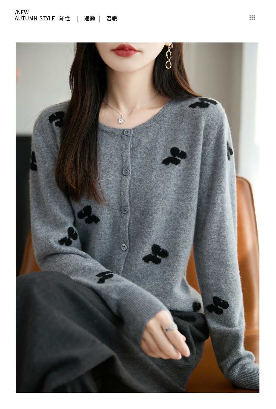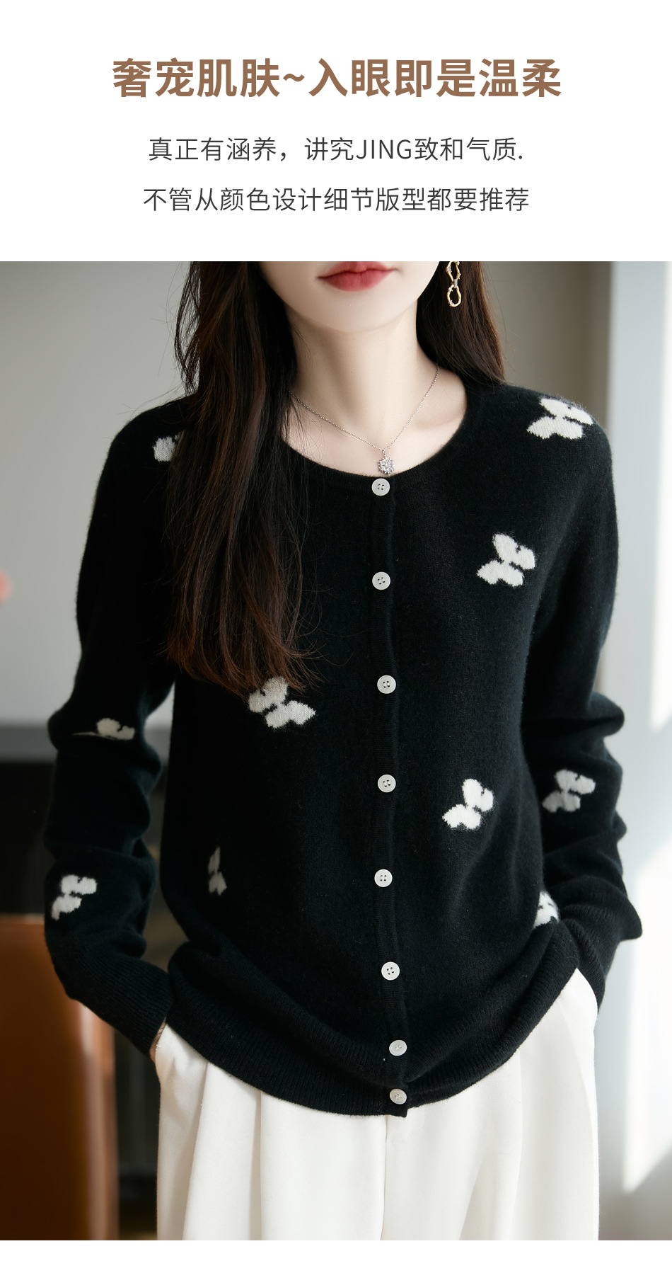 丁摩 气质蝴蝶提花100%纯羊毛开衫女圆领软糯毛衣外套QS-263-90