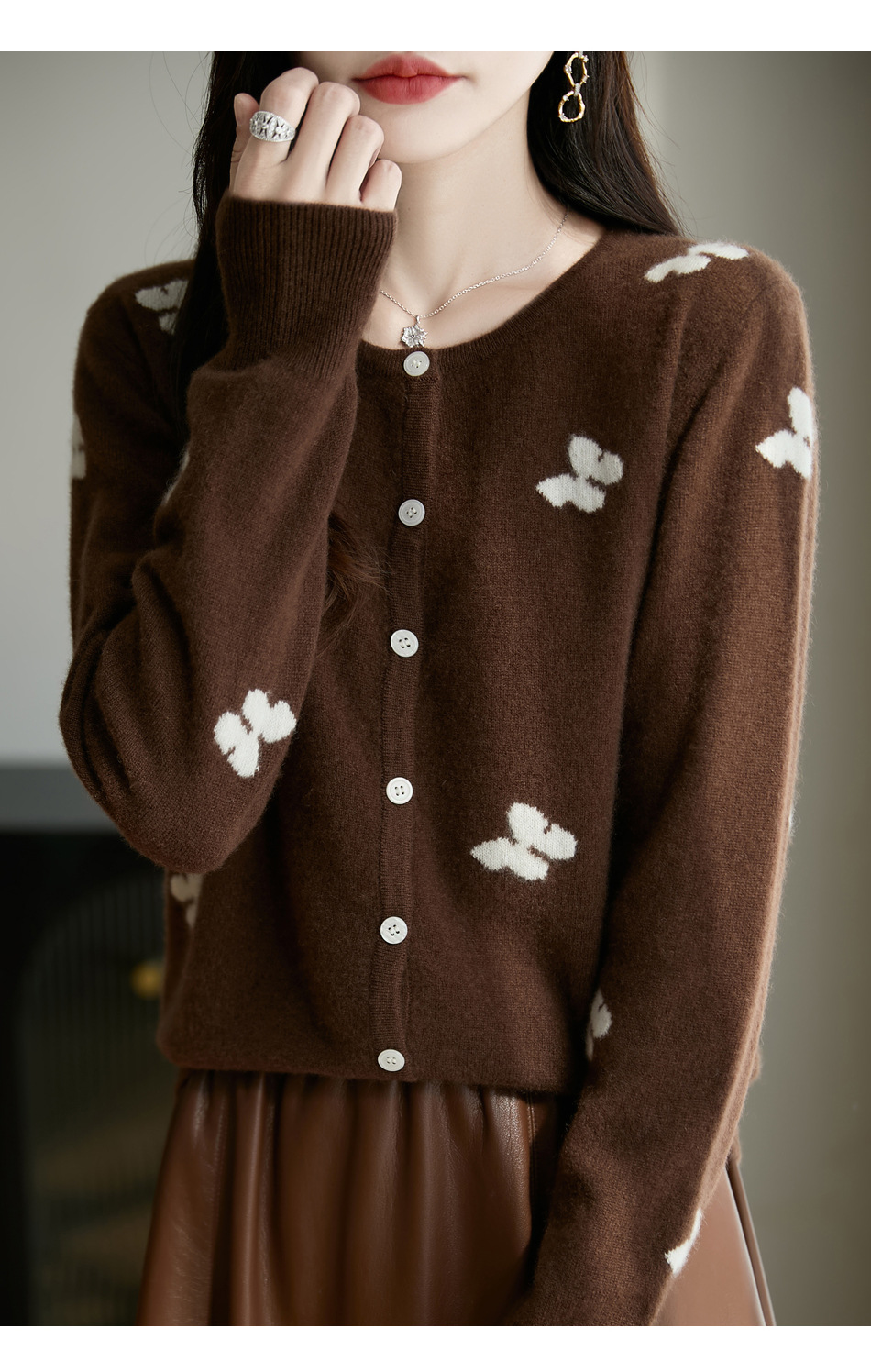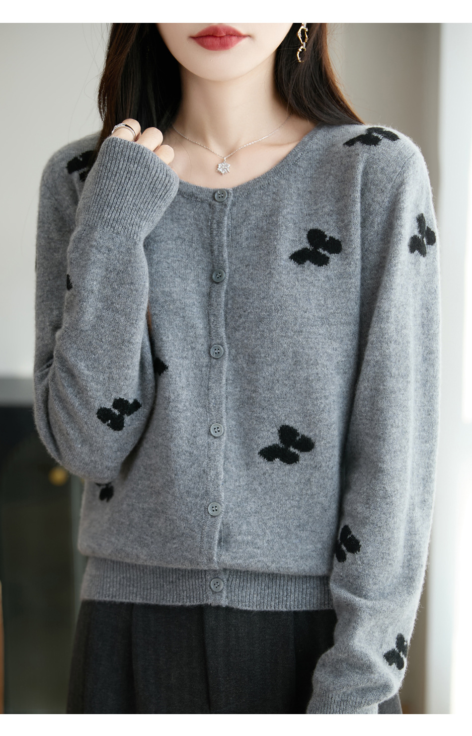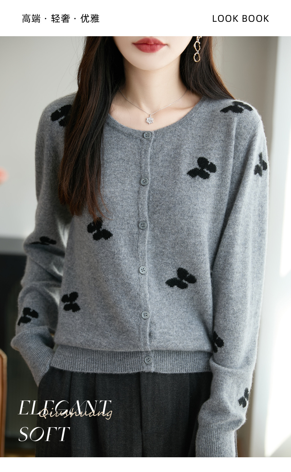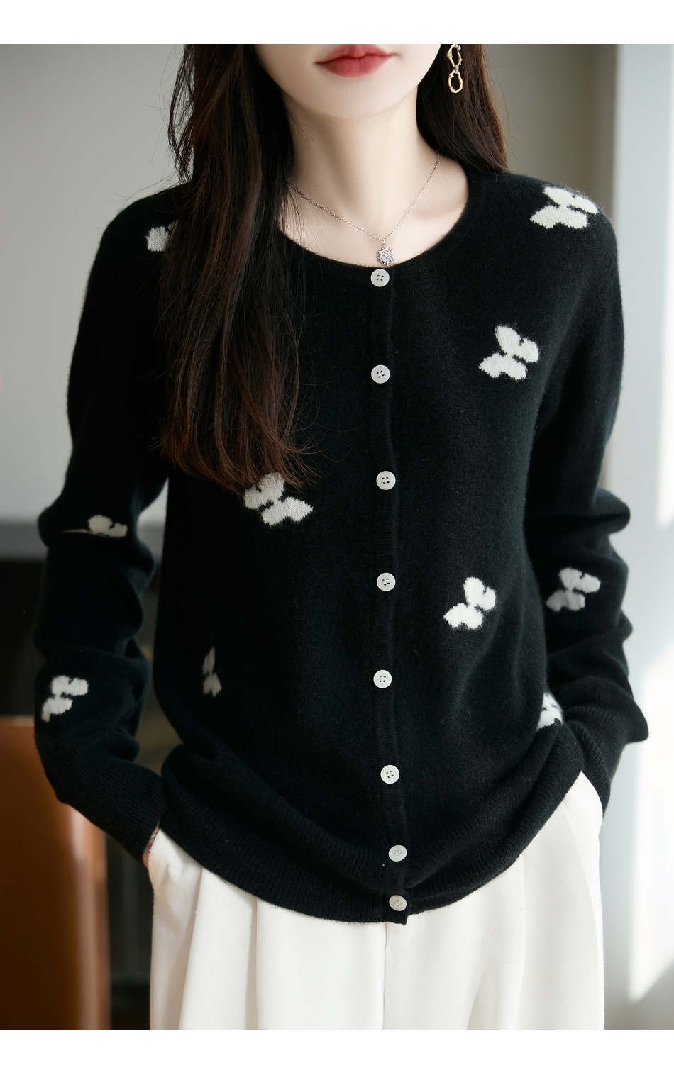 丁摩 气质蝴蝶提花100%纯羊毛开衫女圆领软糯毛衣外套QS-263-90
