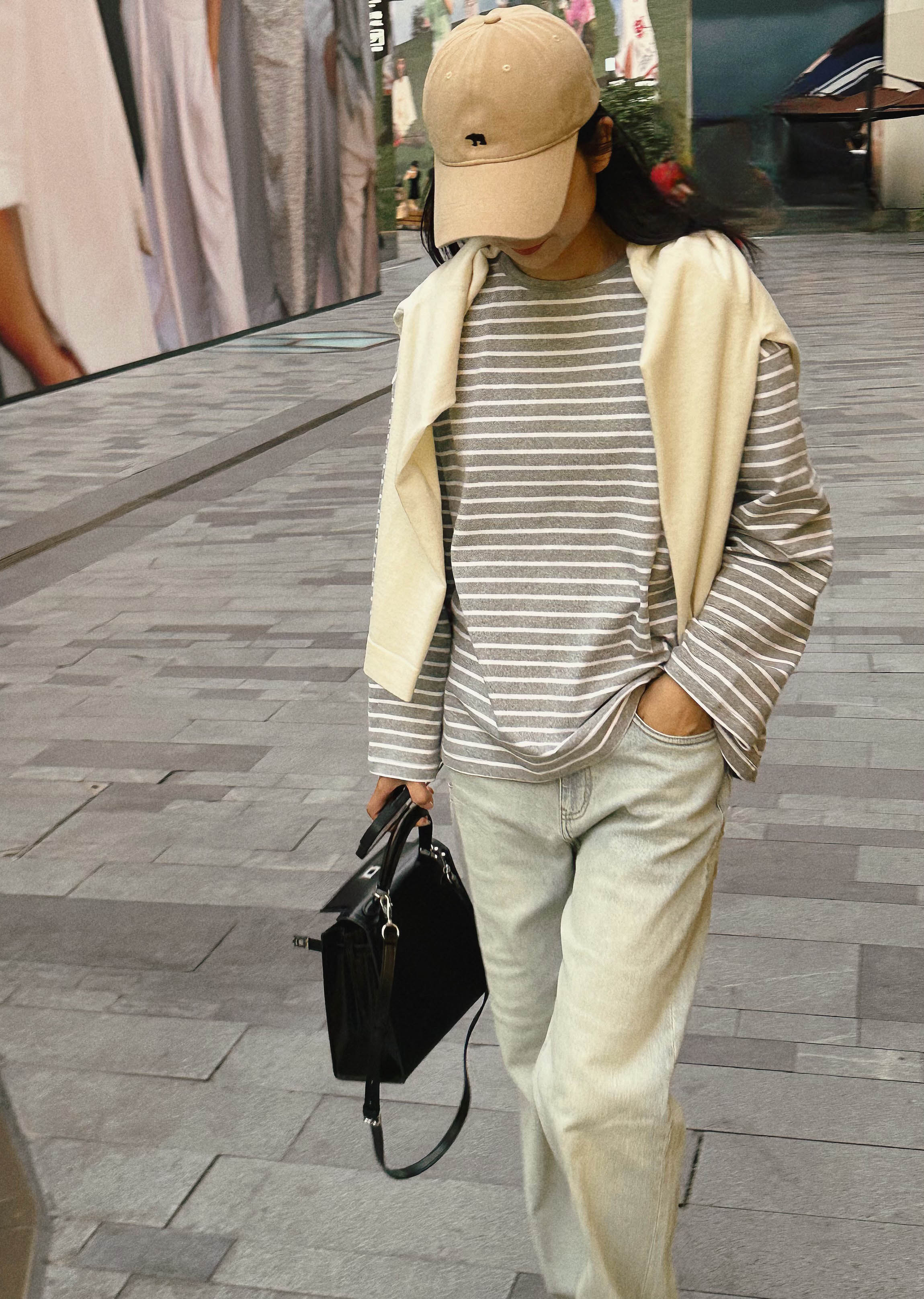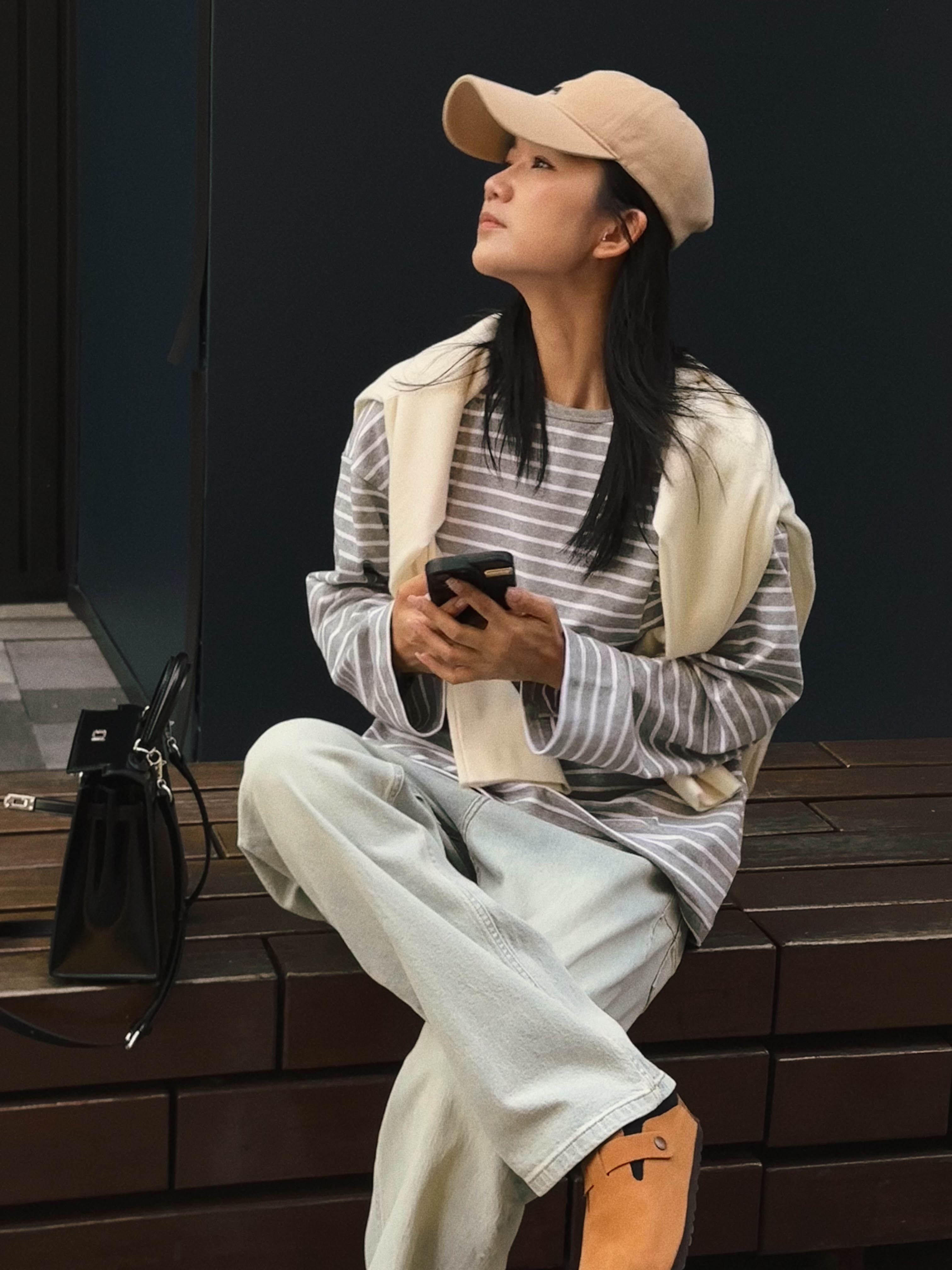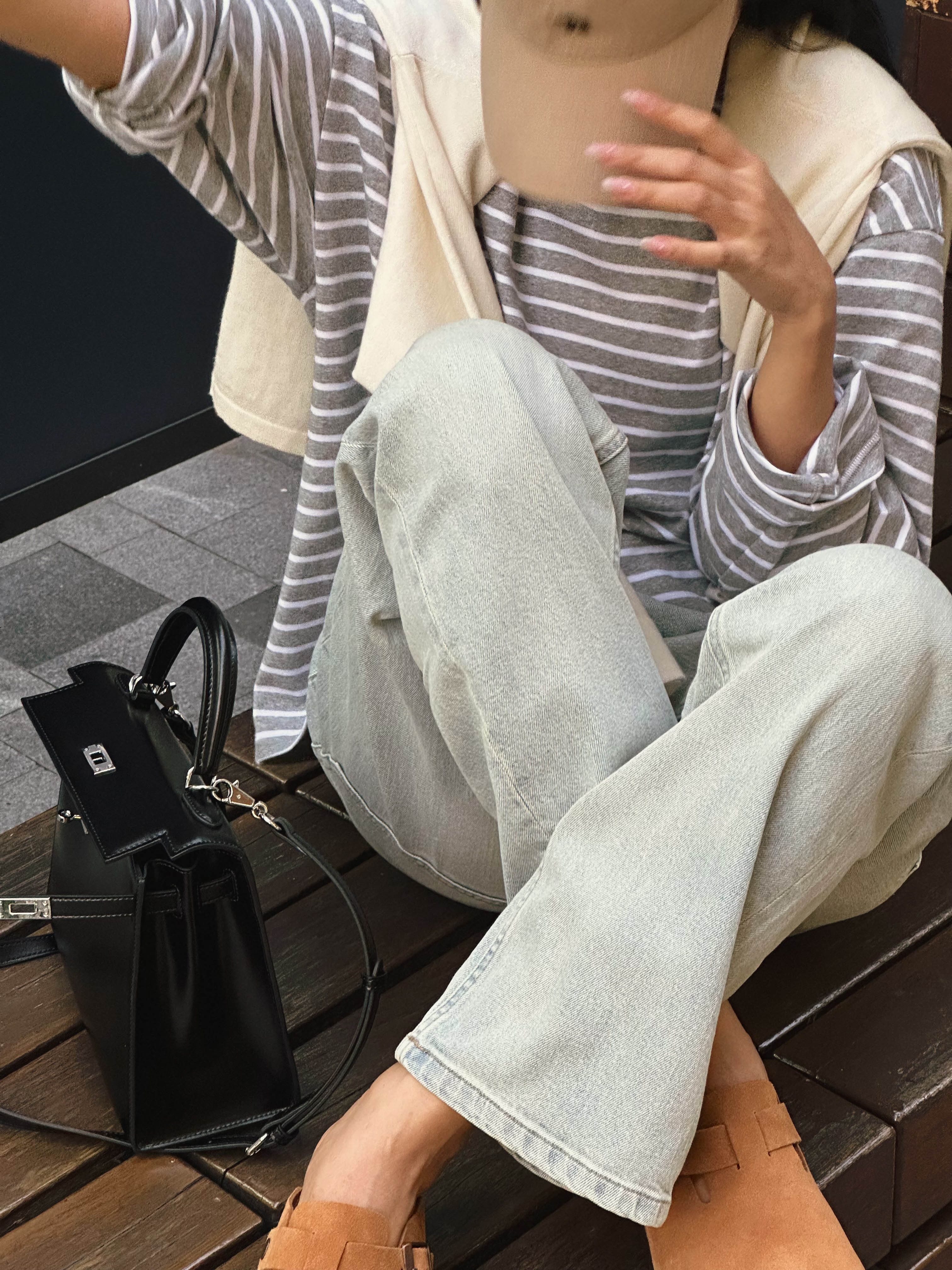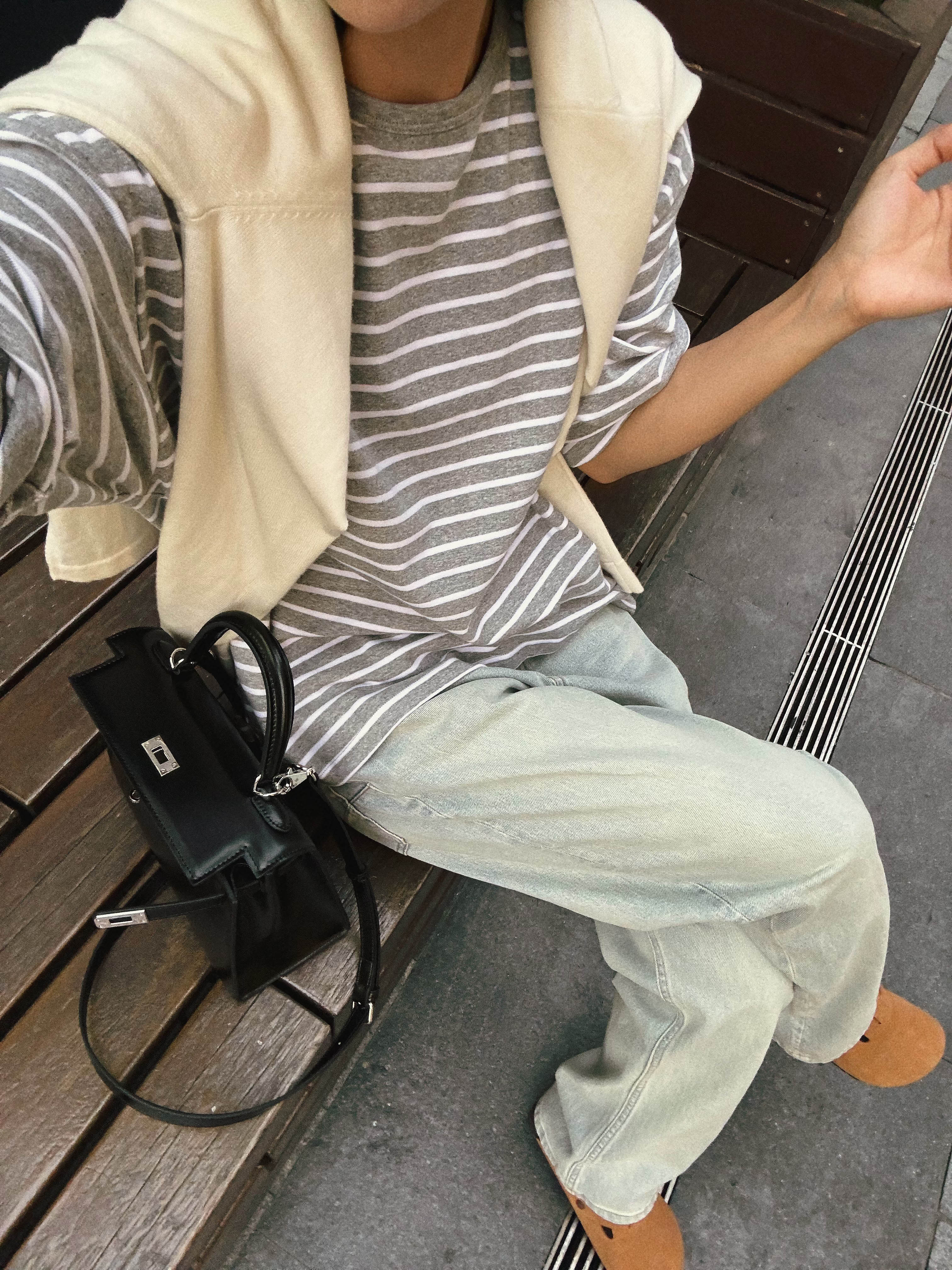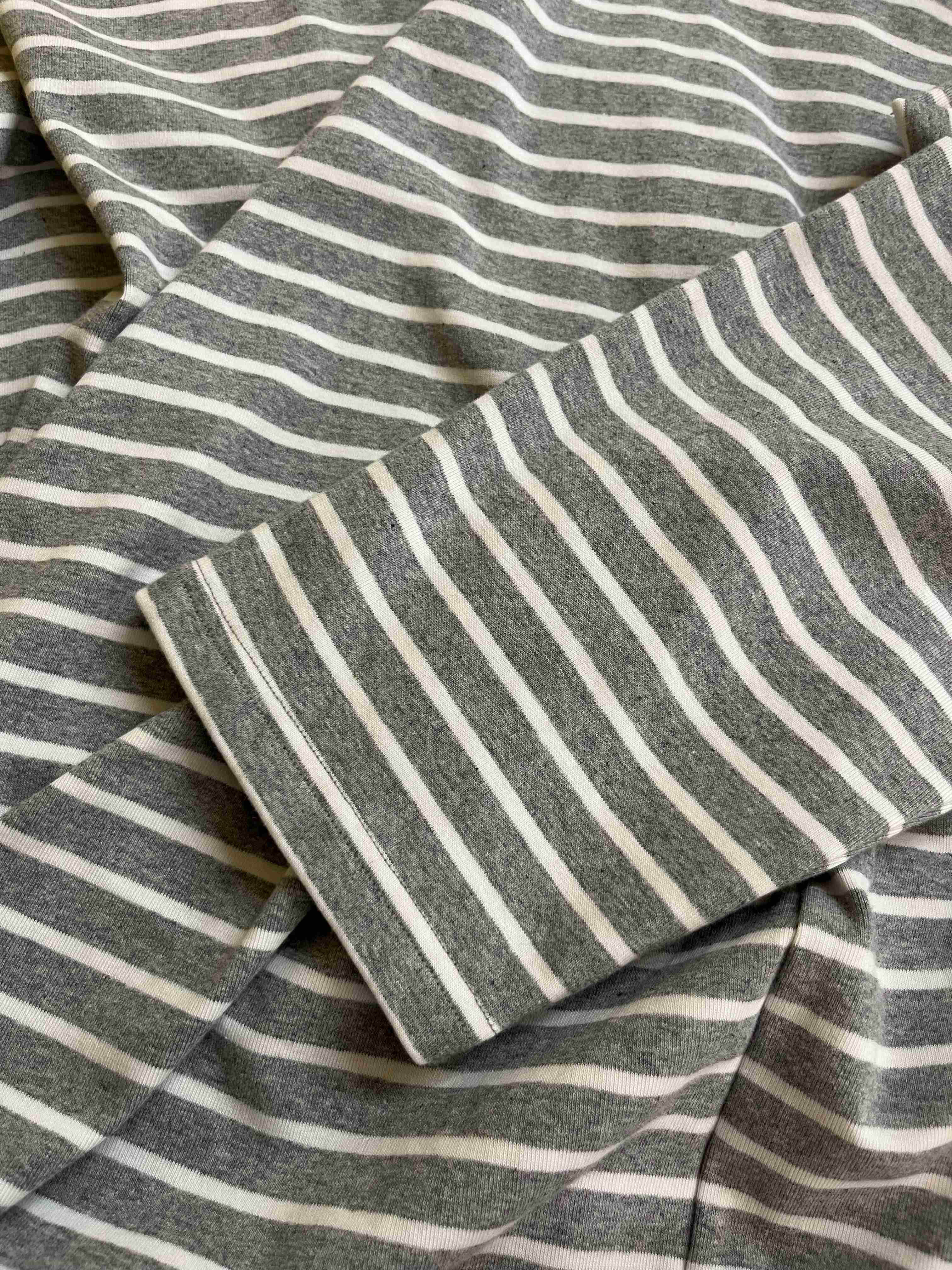 洛诗琳34842经典简约条纹打底衫2025新款极简主义灰白条纹上衣325