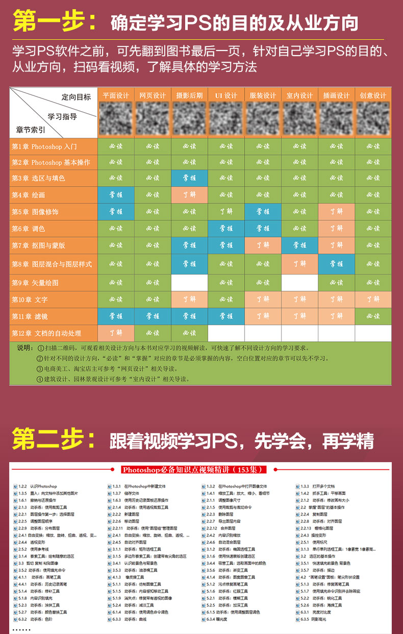 Photoshop功能强大、命令繁多,全部掌握需要较长时间。如想在短期内学会并使用 Photoshop进行修图、数码照片处理、网页设计、平面设计等,不必耗时费力学习Photoshop 全部功能,只须根据本书的建议学习部分内容即可。
