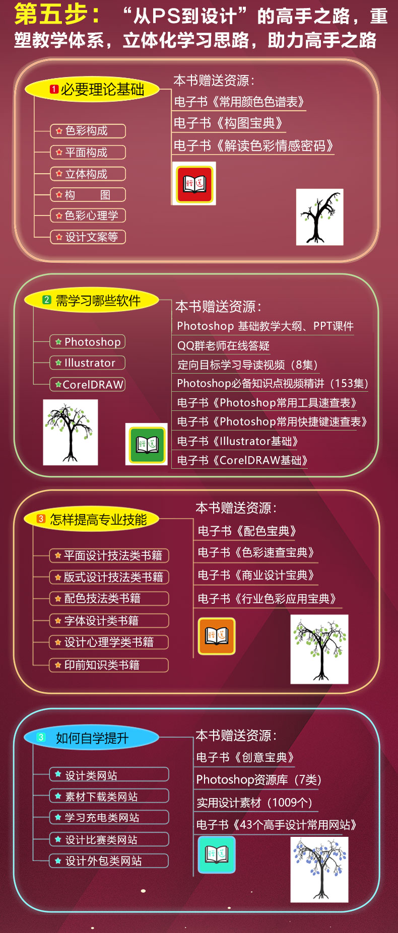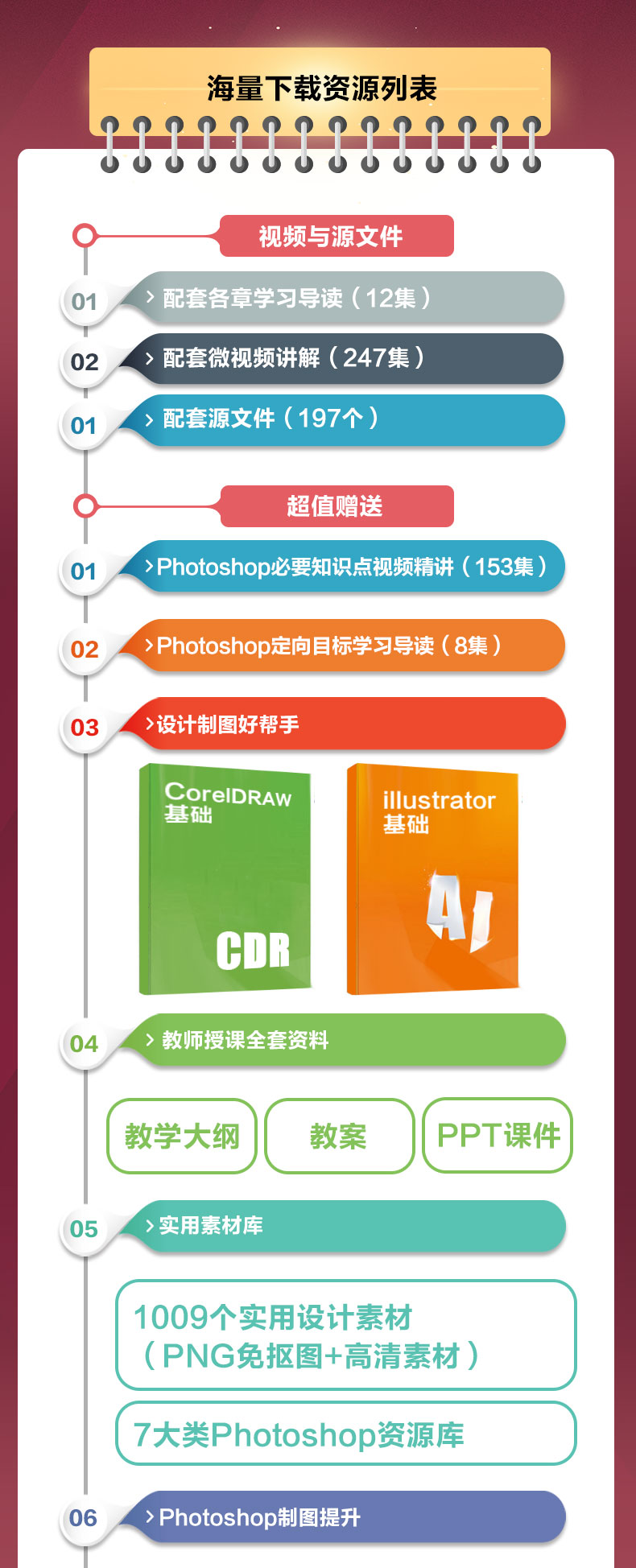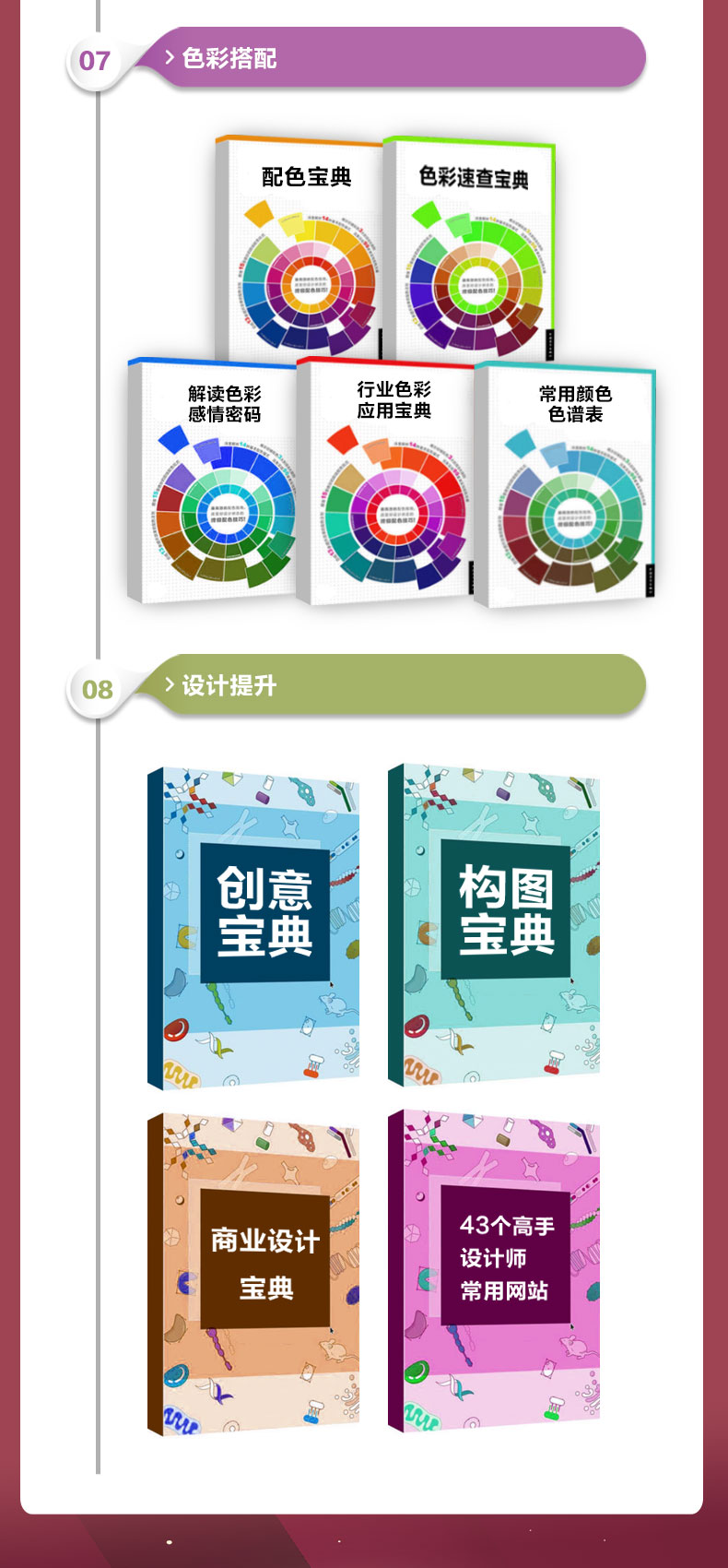 为了便于深度和广度拓展,每种书还附赠了大量的学习资源,如本书赠送了配色宝典、构图宝典、创意宝典、商业设计宝典、各种设计素材、色谱表和资源库等。