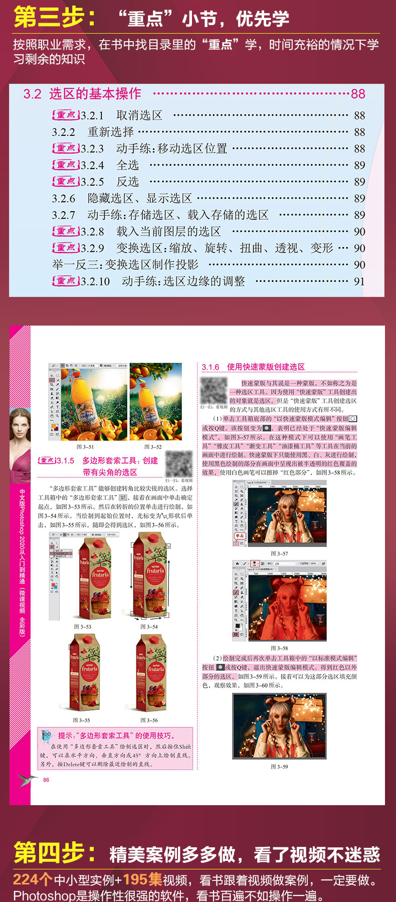 该书实例案例效果精美、内容全面、由浅入深、讲解详尽,从基础知识、中小实例到实战案例,逐层深入,逐步拓展,零基础的读者也能够轻松学会。