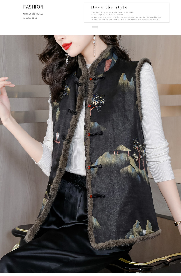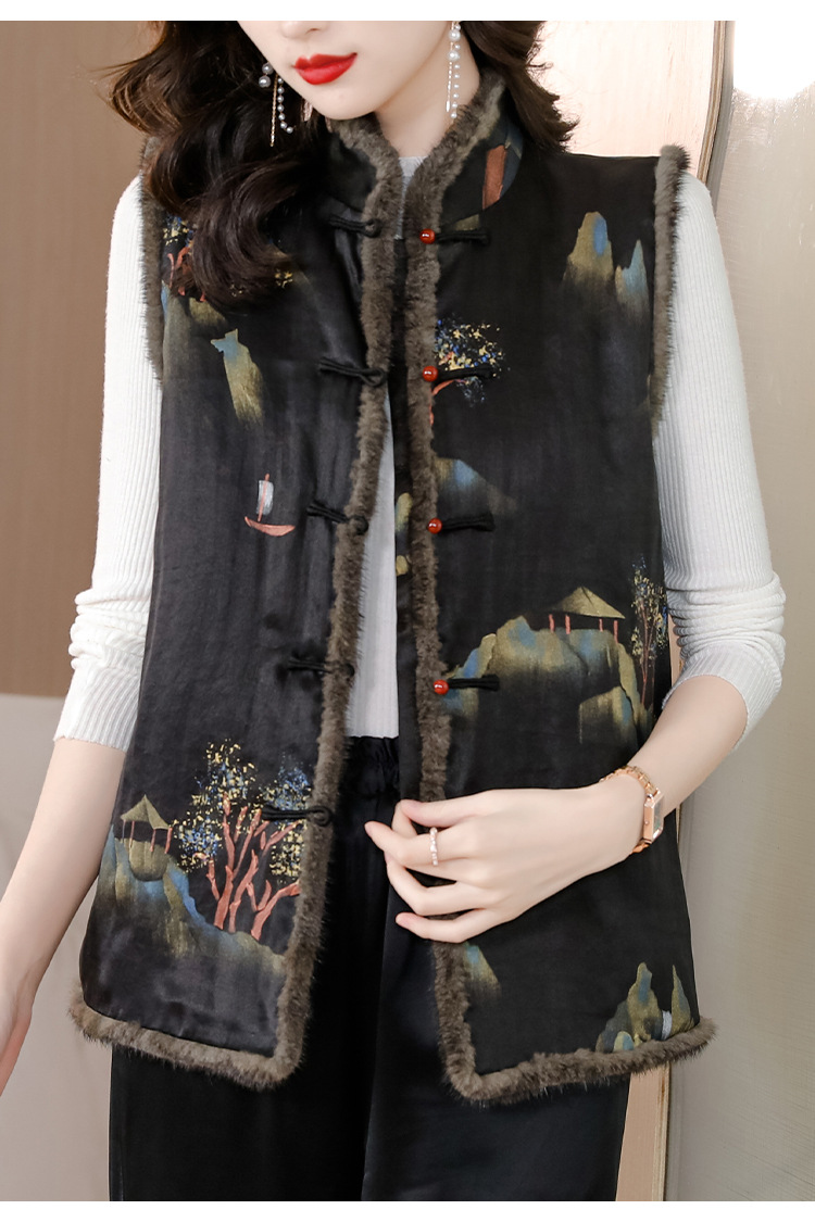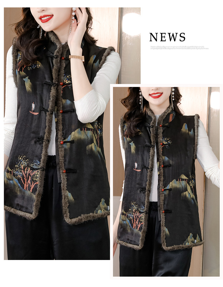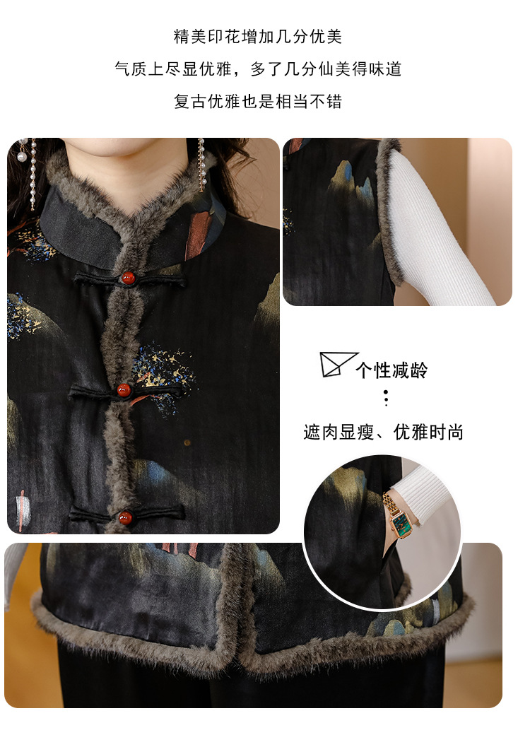 AHMolz1138 新中式复古仿水貂毛马甲女2023秋冬新款国风水墨印花盘扣背心外套