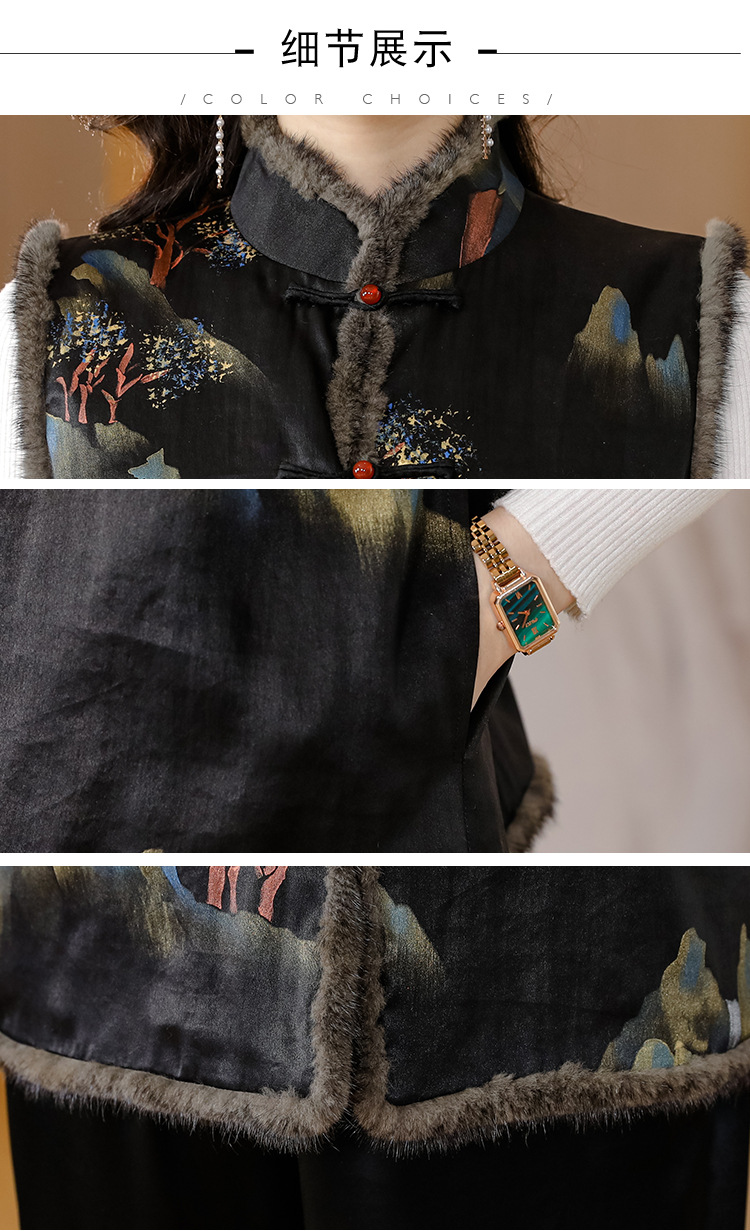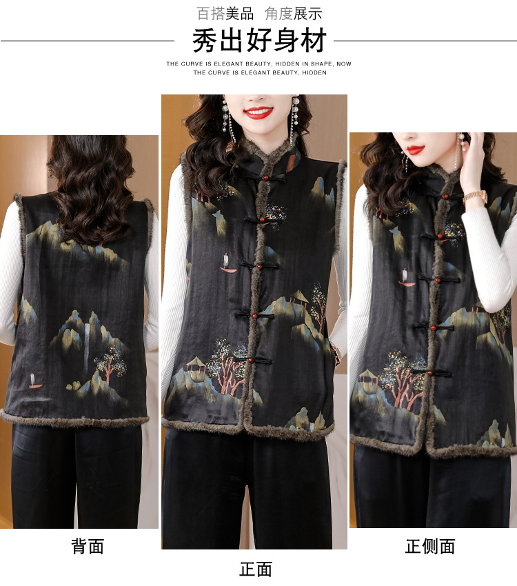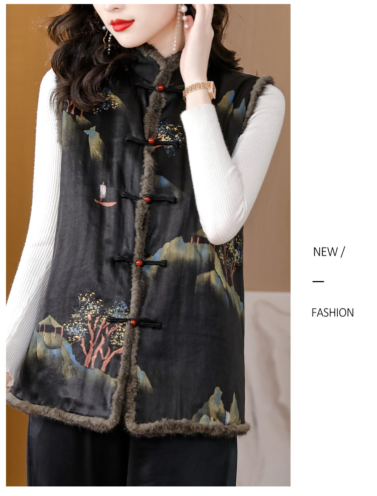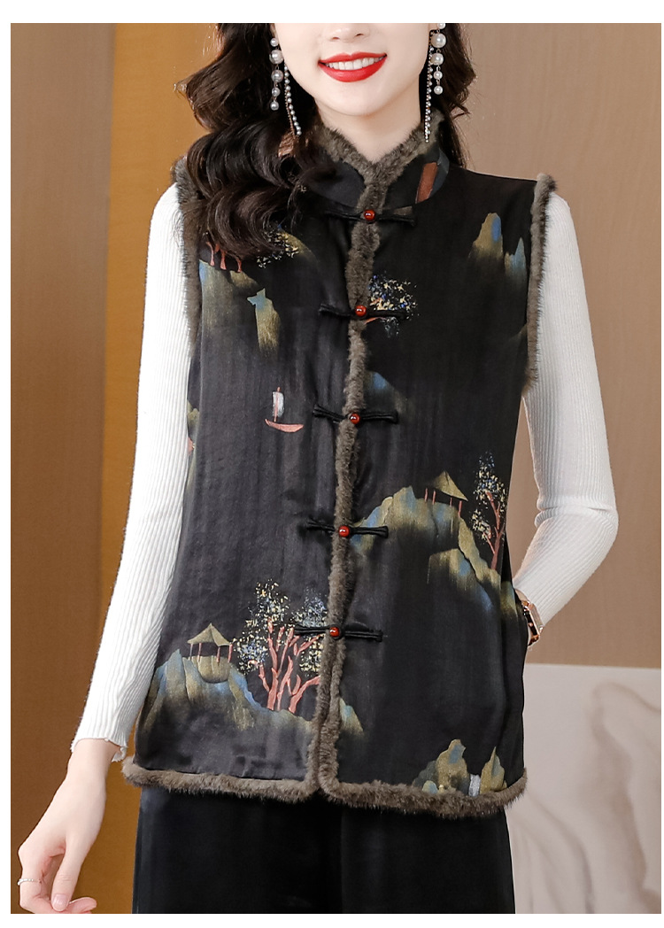 AHMolz1138 新中式复古仿水貂毛马甲女2023秋冬新款国风水墨印花盘扣背心外套