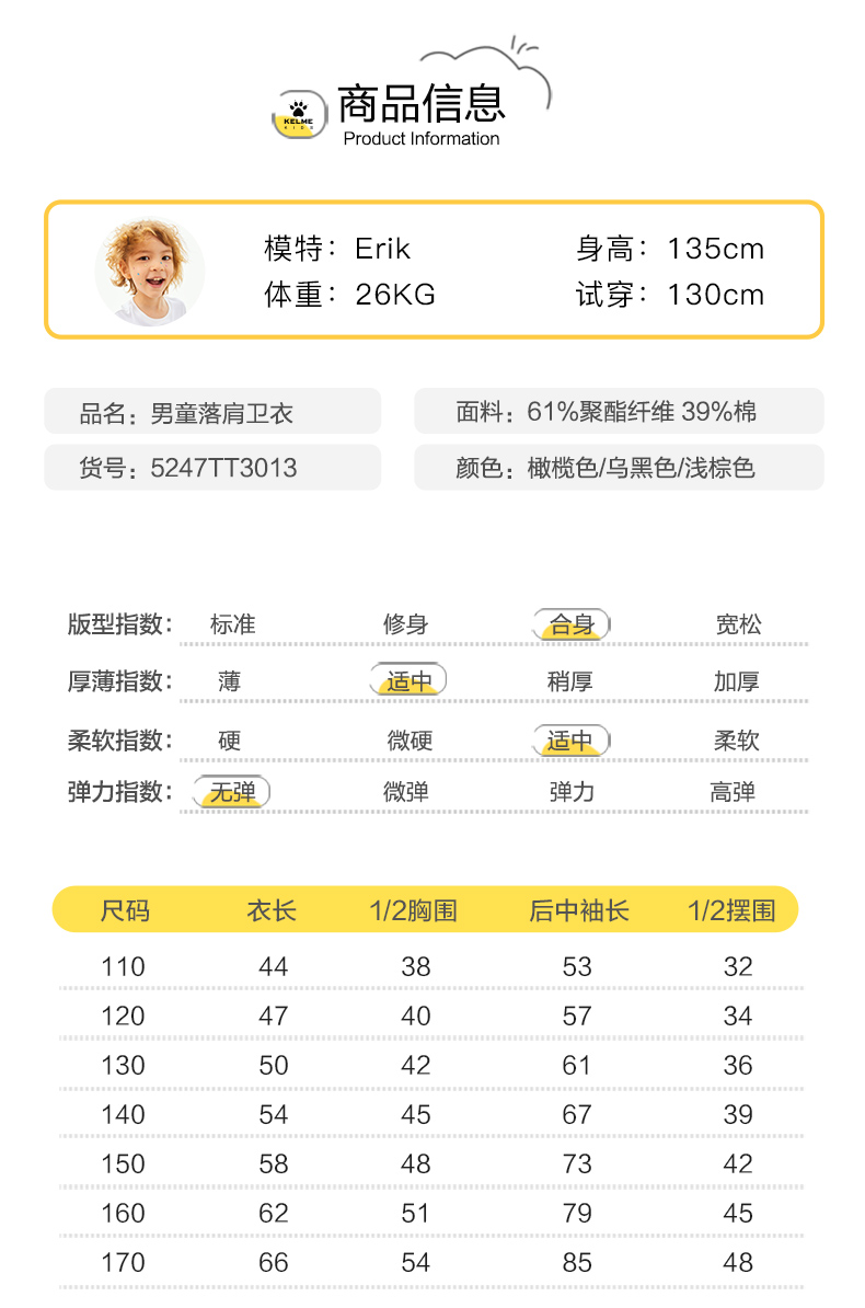 KIDS卡尔美卫衣男童秋季新款休闲棉质款式套头卫衣